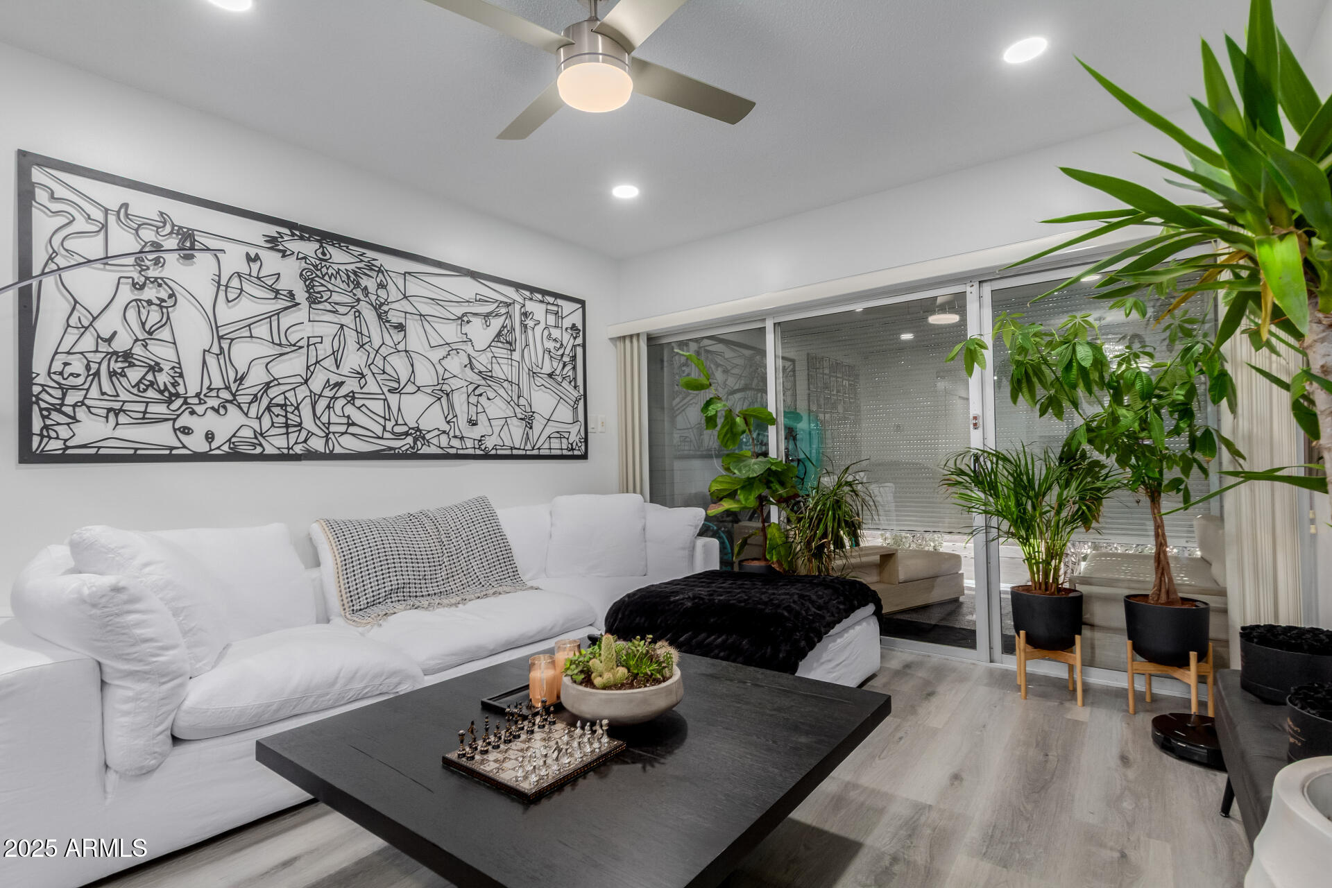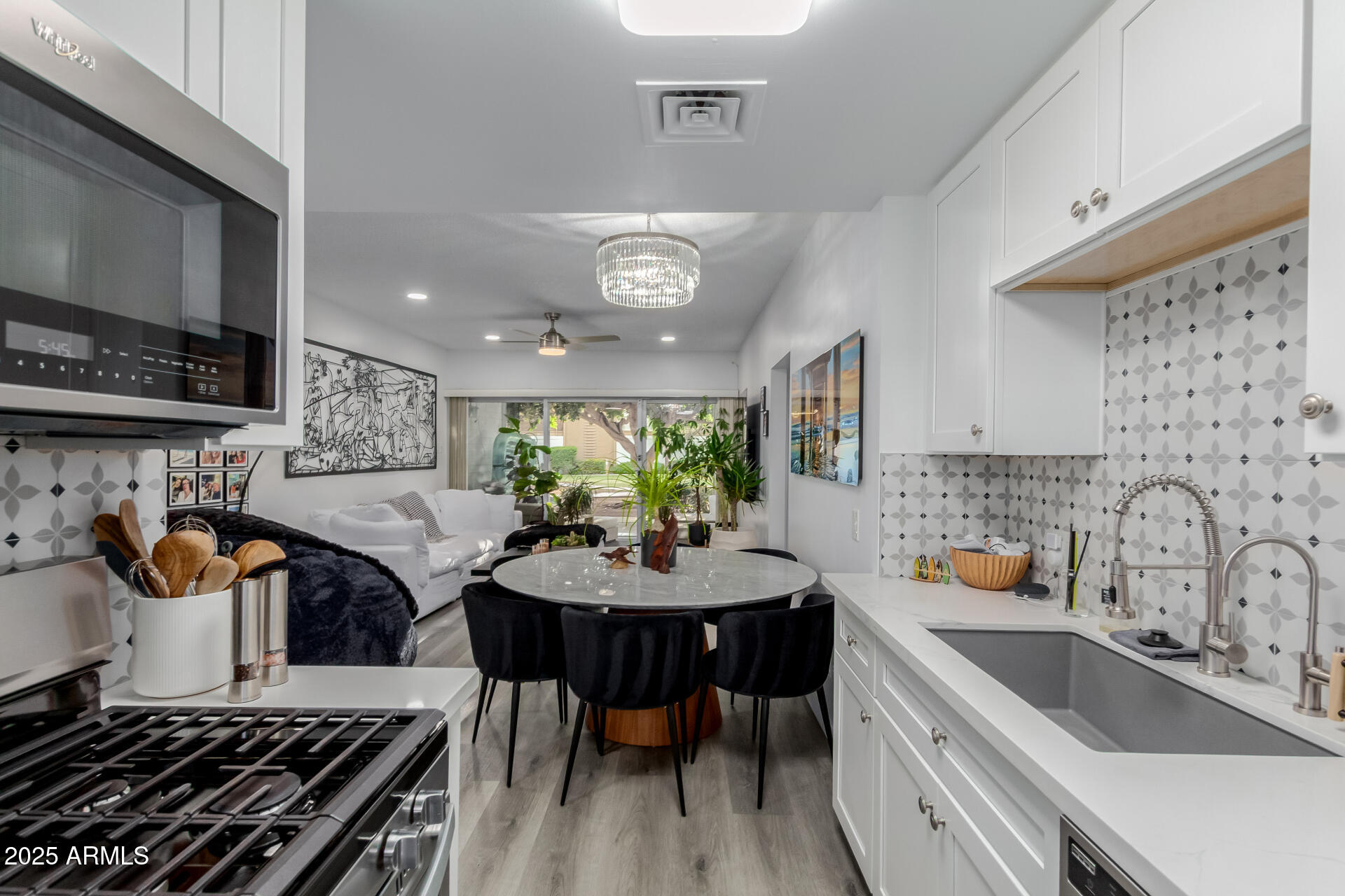 This stunning designer remodel features fresh flooring, updated paint, Calacatta Haze quartz countertops, stylish faucets, a granite kitchen sink, modern lighting, ceiling fans, chic kitchen appliances, mirrors, and more. The light-filled rooms offer captivating views of the greenery outside, creating a bright and inviting atmosphere. Comfort is enhanced by a newer AC unit and an electric security rolling shutter on the rear patio. Relax in your private oasis on the patio, enjoying views of the sparkling pool and greenbelt.
