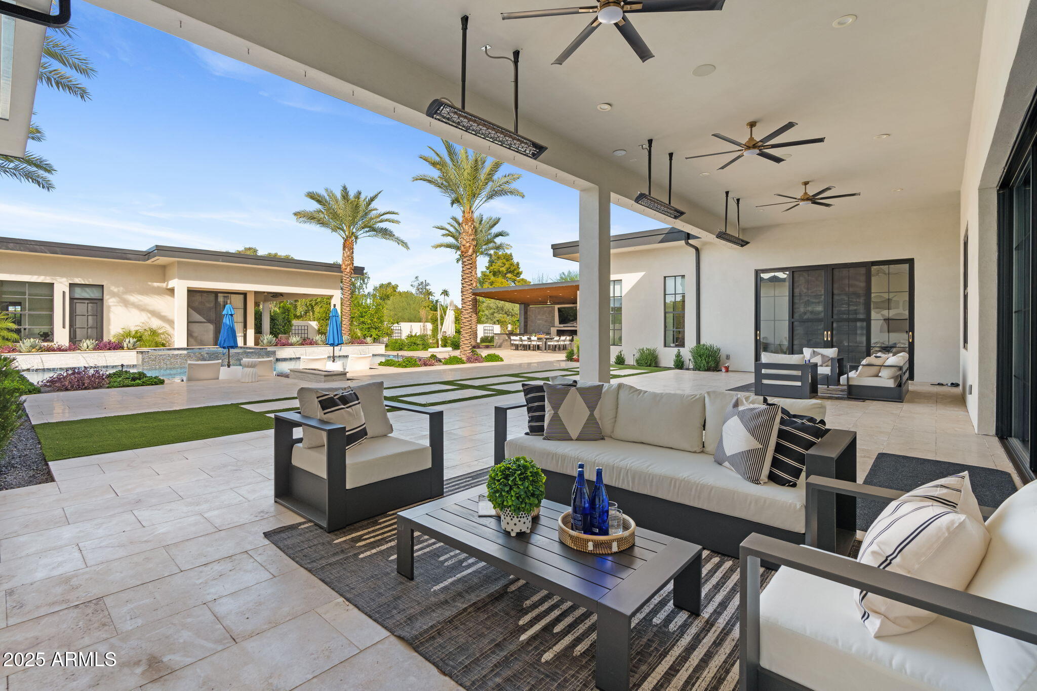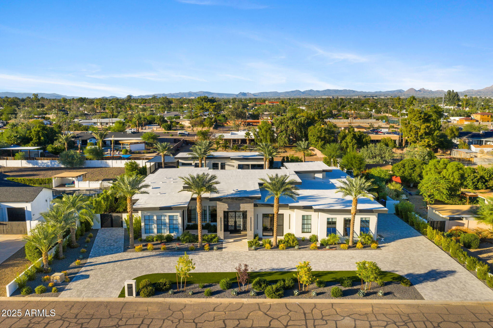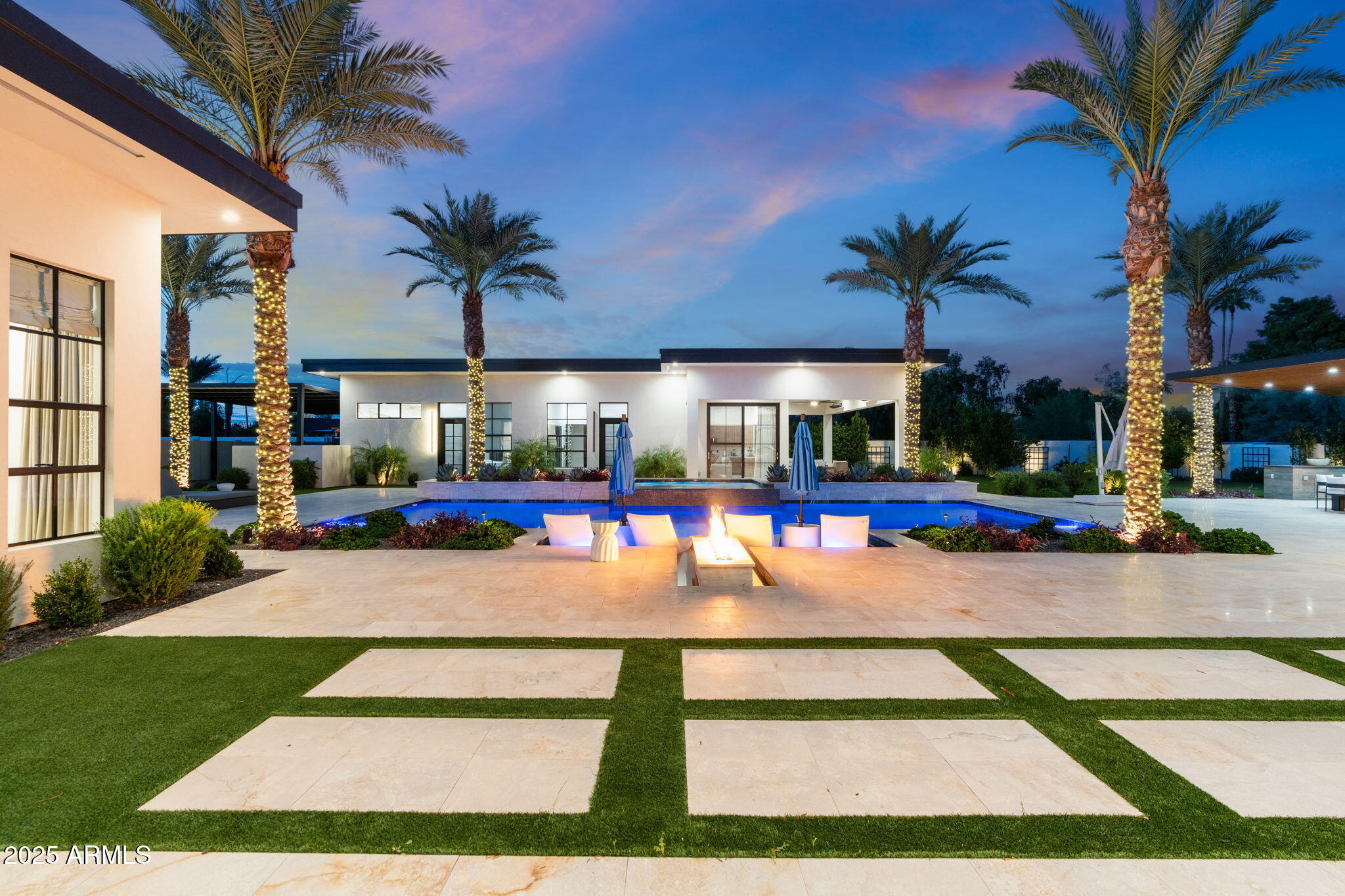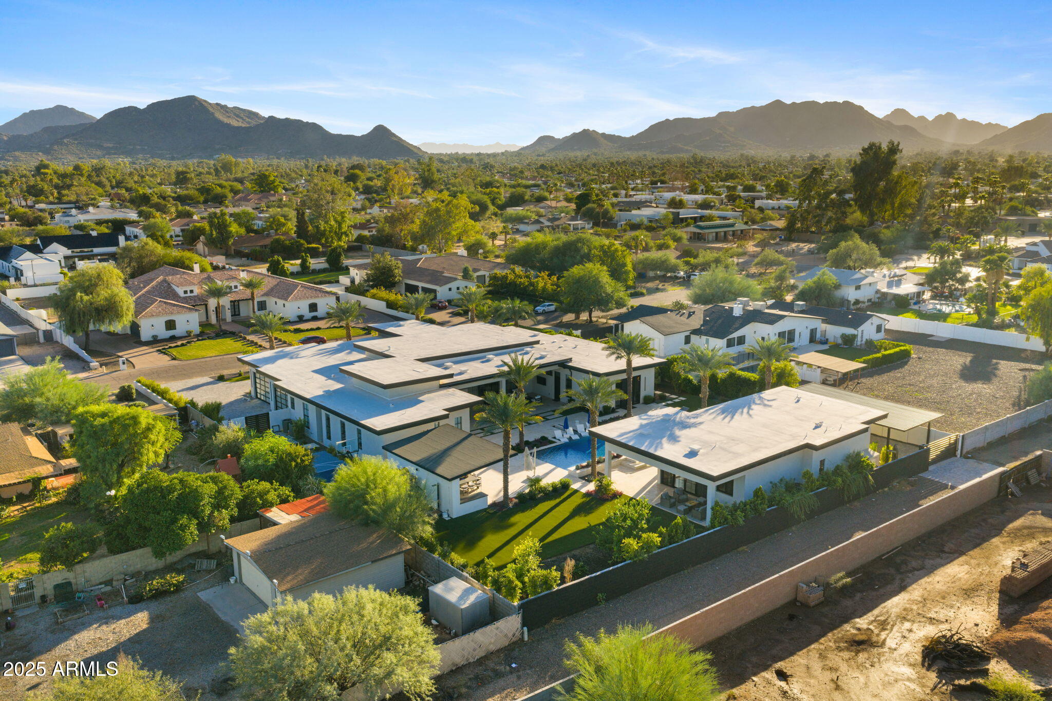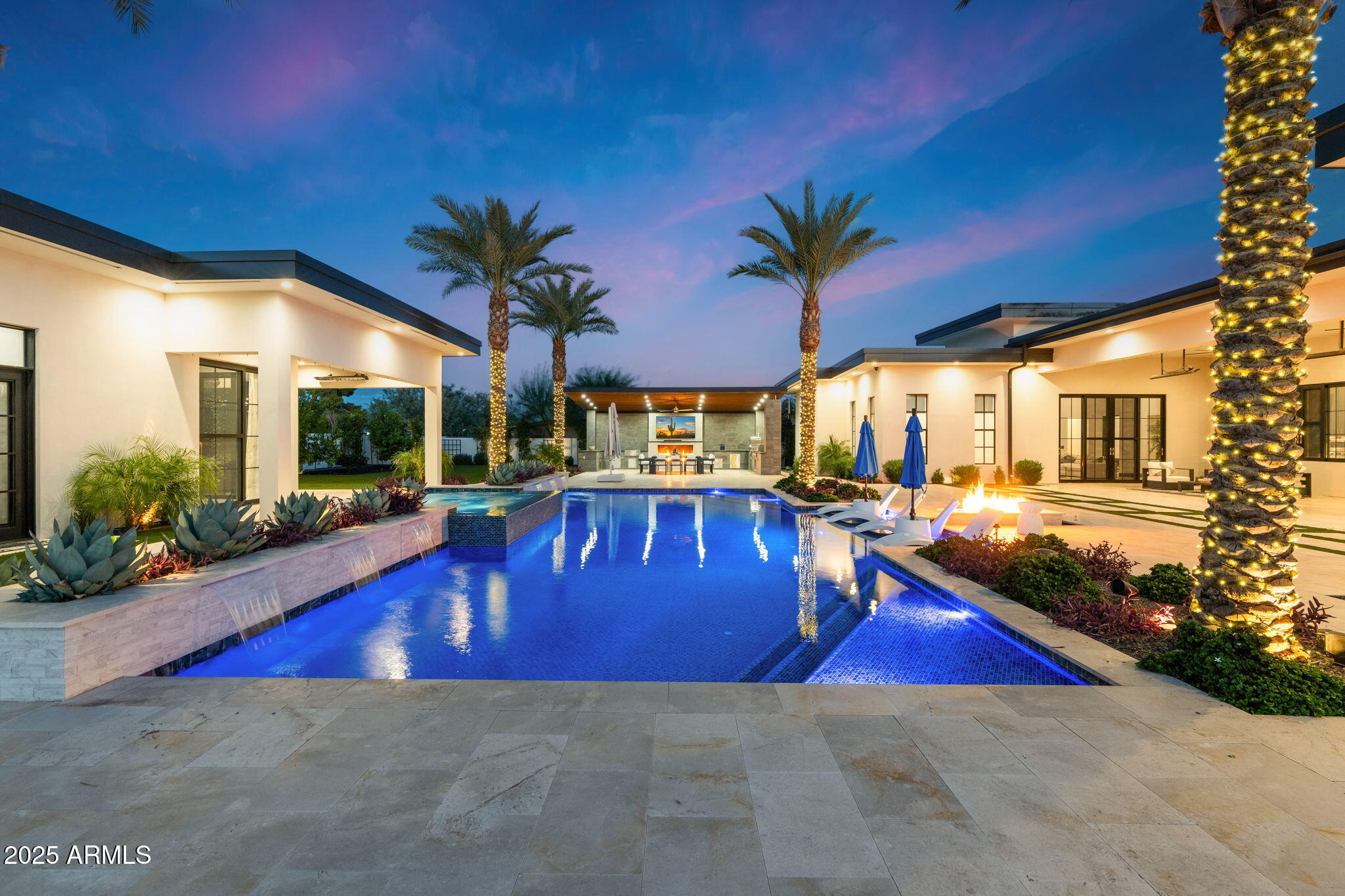 Discover unparalleled luxury in this 2022 custom built estate nestled in the heart of Paradise Valley, meticulously designed for family entertaining. The expansive kitchen is a culinary haven, boasting an oversized island, Sub Zero fridge and freezer, dual Cove dishwashers, never used Wolf steam oven, Transform home entertaining in the expansive game room. The bar is equipped with beverage fridges and an ice maker. The family room, adorned with 16' ceilings, seamlessly connects indoor and outdoor entertainment area spaces through an expansive 22- ft retractable pocket door flooding natural light framing breathtaking views. Indulge in casual dinners or elegant affairs in the formal dining room. Featuring 40 custom designed iron doors this residence showcases modern elegance in every detail The primary suite is a true retreat, centered around a fireplace encased in gold inlaid white marble tile and a resort style bath with a steam shower, soaking tub, beverage bar, separate laundry area, dual walk in closets. The kids' wing offers three additional ensuite bedrooms with walk-in closets off of a central flex/game room. Enjoy working from home in the office with custom ceiling details, French Doors to the side courtyard and a private half bath. Elevate your living experience with a Smart Home, controlled by a state-of-the-art Control 4 Home Automation System managing lighting, thermostats, cameras, security, and audio. The four-car garage boasts insulated doors and epoxy floors. Step into a resort-style backyard with expansive limestone pavered patios overlooking a custom basketball court and a stunning heated pool with baja step, cascading water features, fire features and spa. Relax by the gas fire pit poolside or temp your tastebuds at the 42" built-in grill with a never used pizza oven. Guests will feel right at home in the detached casita with one bedroom, 1.5 bath, gym room and a separate living room with kitchenette and laundry area. Captivating finishes include European Oak floors, synthetic stucco, exterior limestone accents, custom iron gates, stone, marble, and granite finishes, LED lights throughout, and wood-clad Low-E windows. Additional features include two gas tankless hot water heaters, upgraded foam insulation, a high-pressure misting system and much more in this extraordinary home!