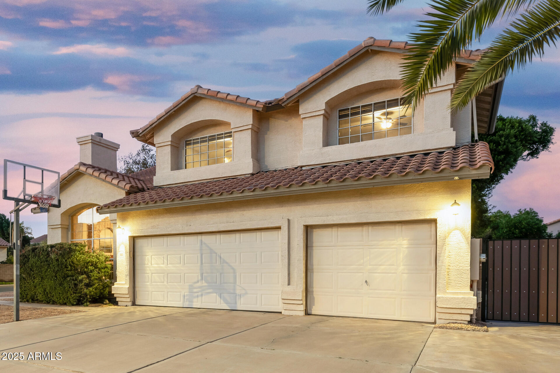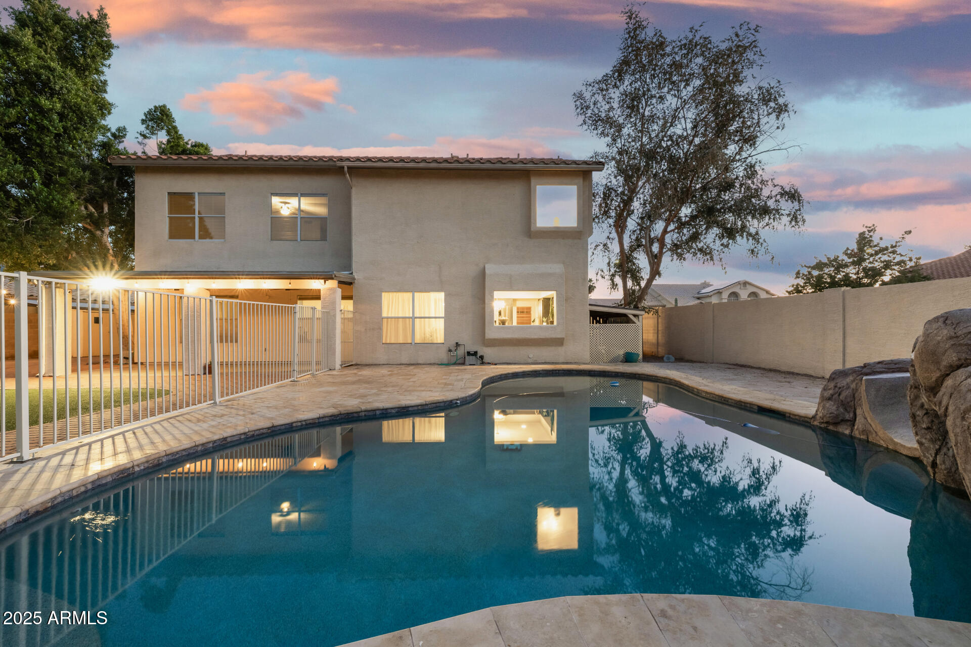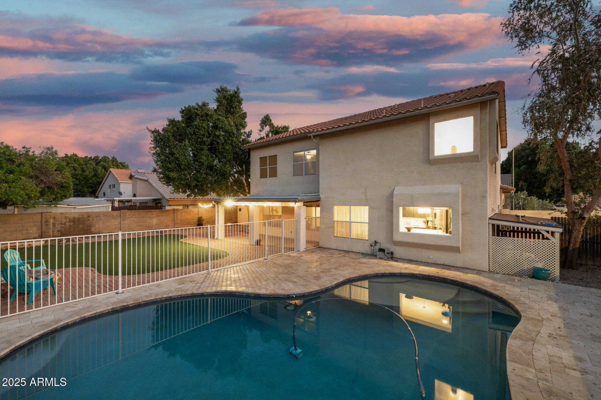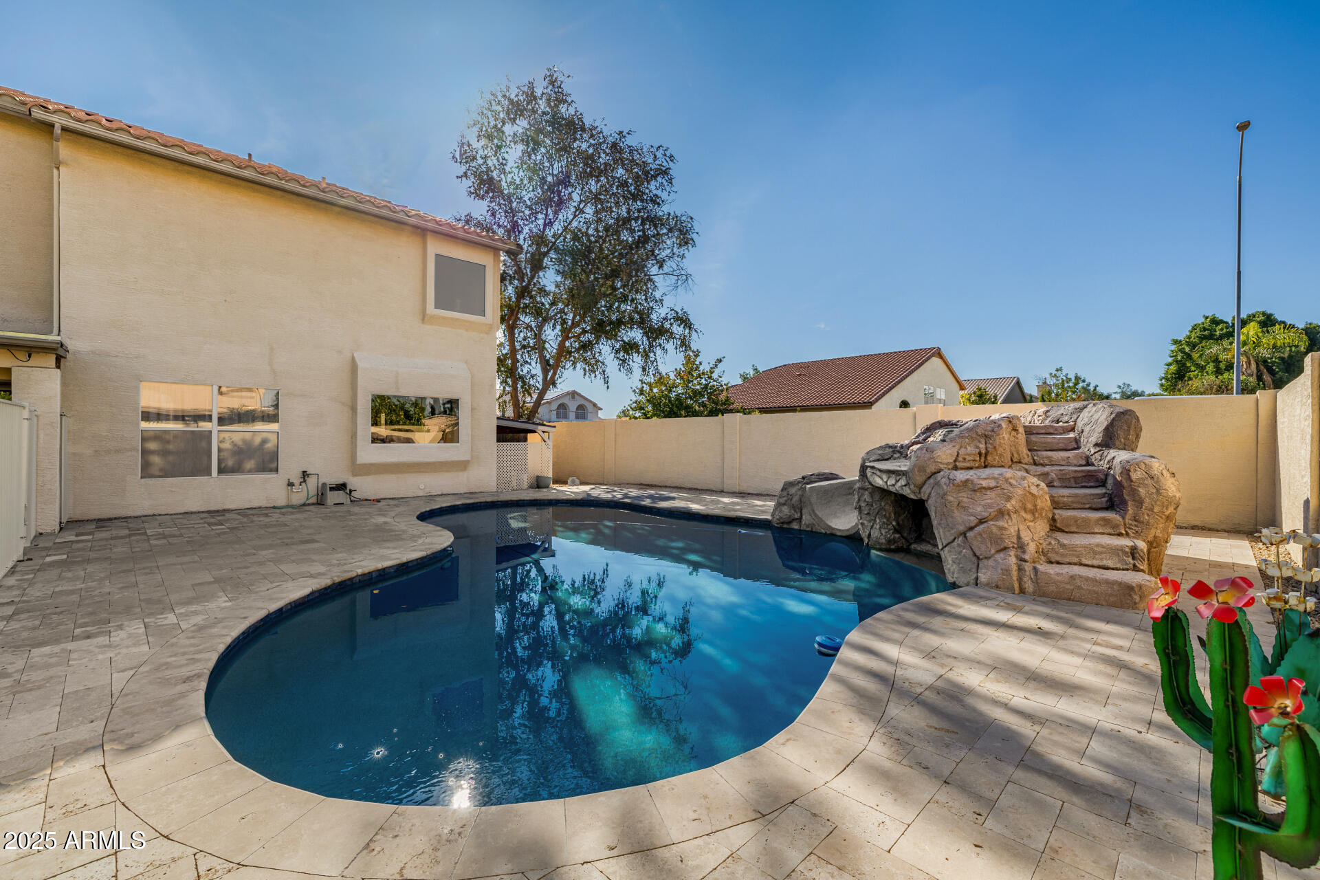 Beautifully updated 5 bed / 3 bath home in the highly desired Rancho Del Mar community--NO HOA and fully upgraded inside and out. This spacious two-story layout features a remodeled kitchen with quartz counters, stainless appliances, large island, updated lighting, and modern finishes throughout. Bright open living spaces include formal living/dining plus a separate family room with soaring ceilings and new flooring. One bedroom and full bath are located downstairs, perfect for guests or multi-gen living. Upstairs offers a large primary suite with remodeled bathroom, double sinks, separate tub/shower, and walk-in closet, along with 3 additional bedrooms and an updated hall bath. Recent improvements include newer AC units, shutters, flooring, and updated bathrooms. The backyard is a private oasis with a PebbleTec pool, covered patio, low-maintenance turf, pavers, and mature landscapingideal for outdoor living. 3-car garage, quiet interior lot, and an unbeatable Mesa location close to the US-60, Loop 101, shopping, dining, and schools. Move-in ready and rarely available in this coveted neighborhood.