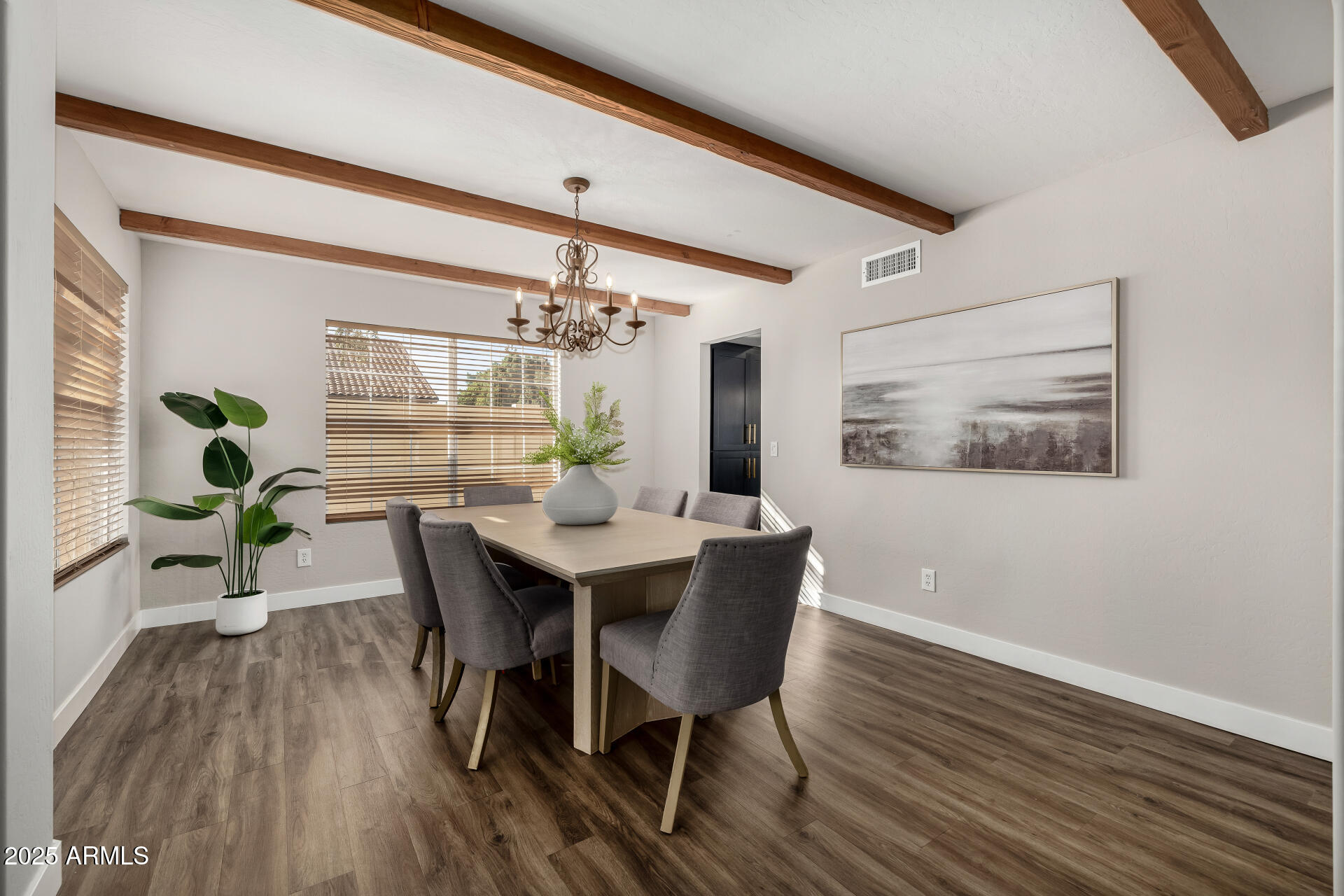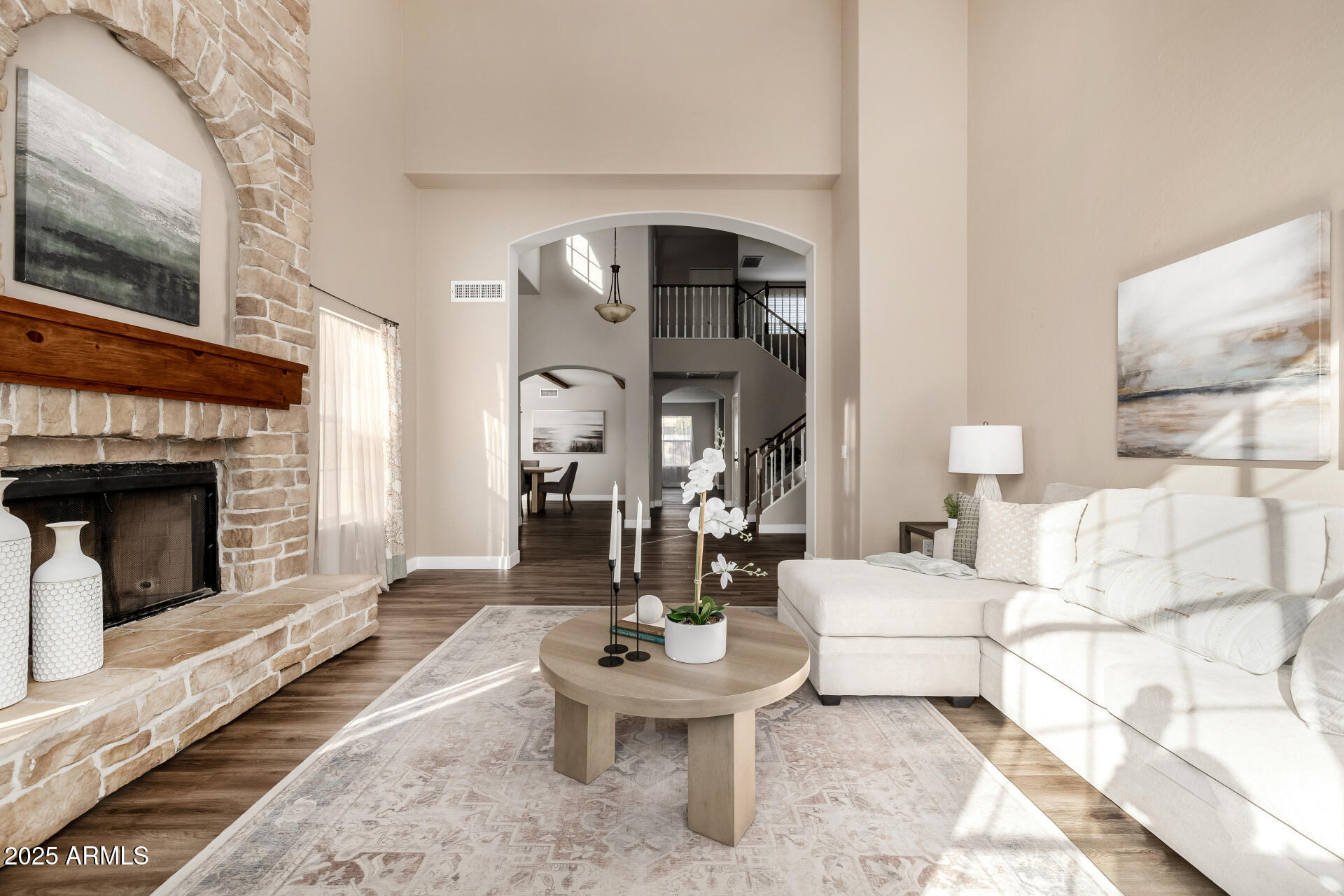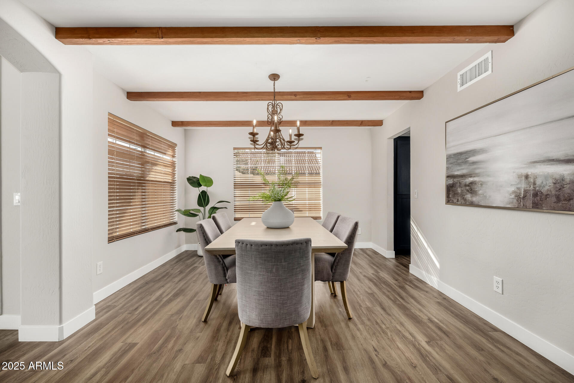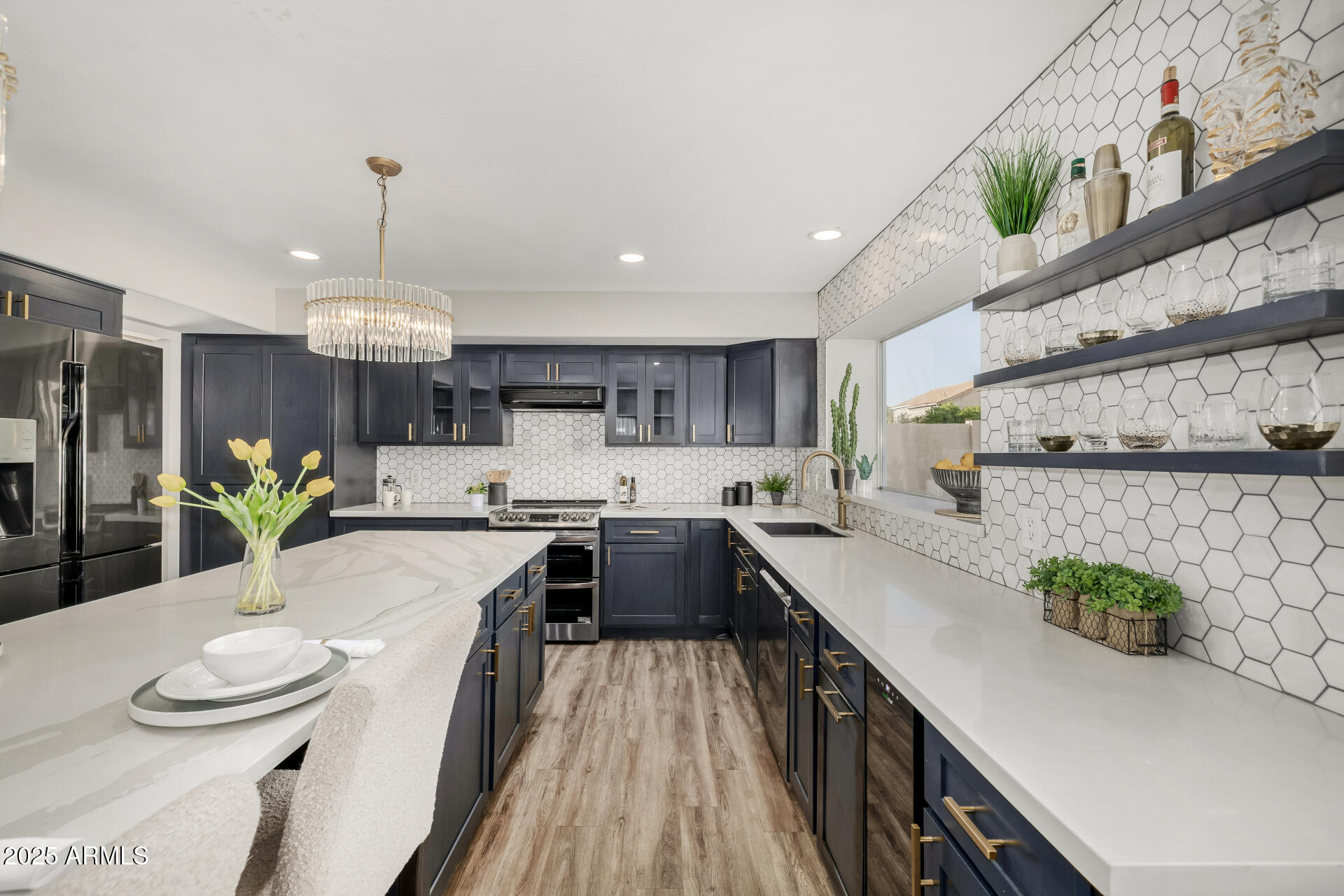 Beautifully updated 5 bed / 3 bath home in the highly desired Rancho Del Mar community--NO HOA and fully upgraded inside and out. This spacious two-story layout features a remodeled kitchen with quartz counters, stainless appliances, large island, updated lighting, and modern finishes throughout. Bright open living spaces include formal living/dining plus a separate family room with soaring ceilings and new flooring. One bedroom and full bath are located downstairs, perfect for guests or multi-gen living. Upstairs offers a large primary suite with remodeled bathroom, double sinks, separate tub/shower, and walk-in closet, along with 3 additional bedrooms and an updated hall bath. Recent improvements include newer AC units, shutters, flooring, and updated bathrooms. The backyard is a private oasis with a PebbleTec pool, covered patio, low-maintenance turf, pavers, and mature landscapingideal for outdoor living. 3-car garage, quiet interior lot, and an unbeatable Mesa location close to the US-60, Loop 101, shopping, dining, and schools. Move-in ready and rarely available in this coveted neighborhood.