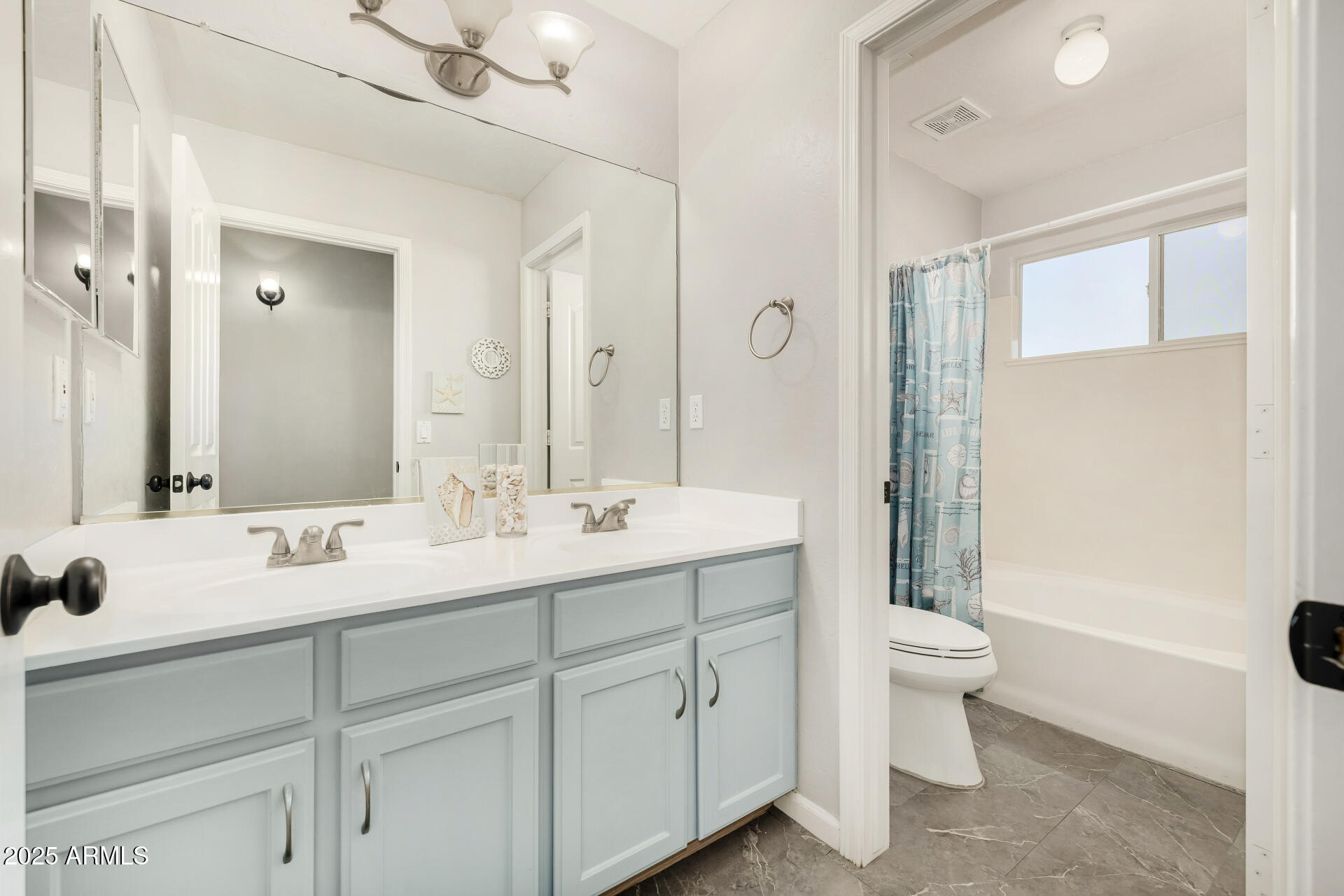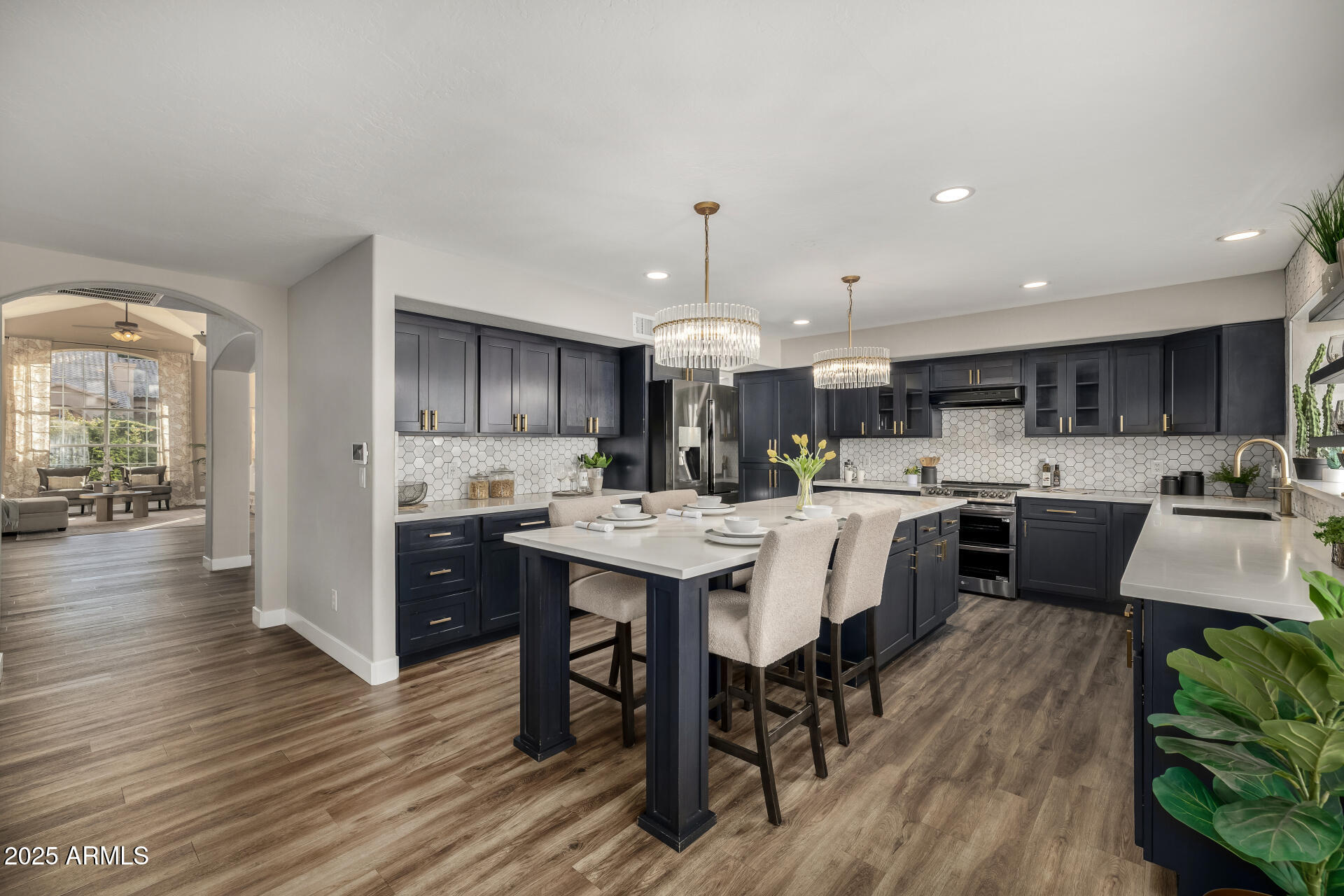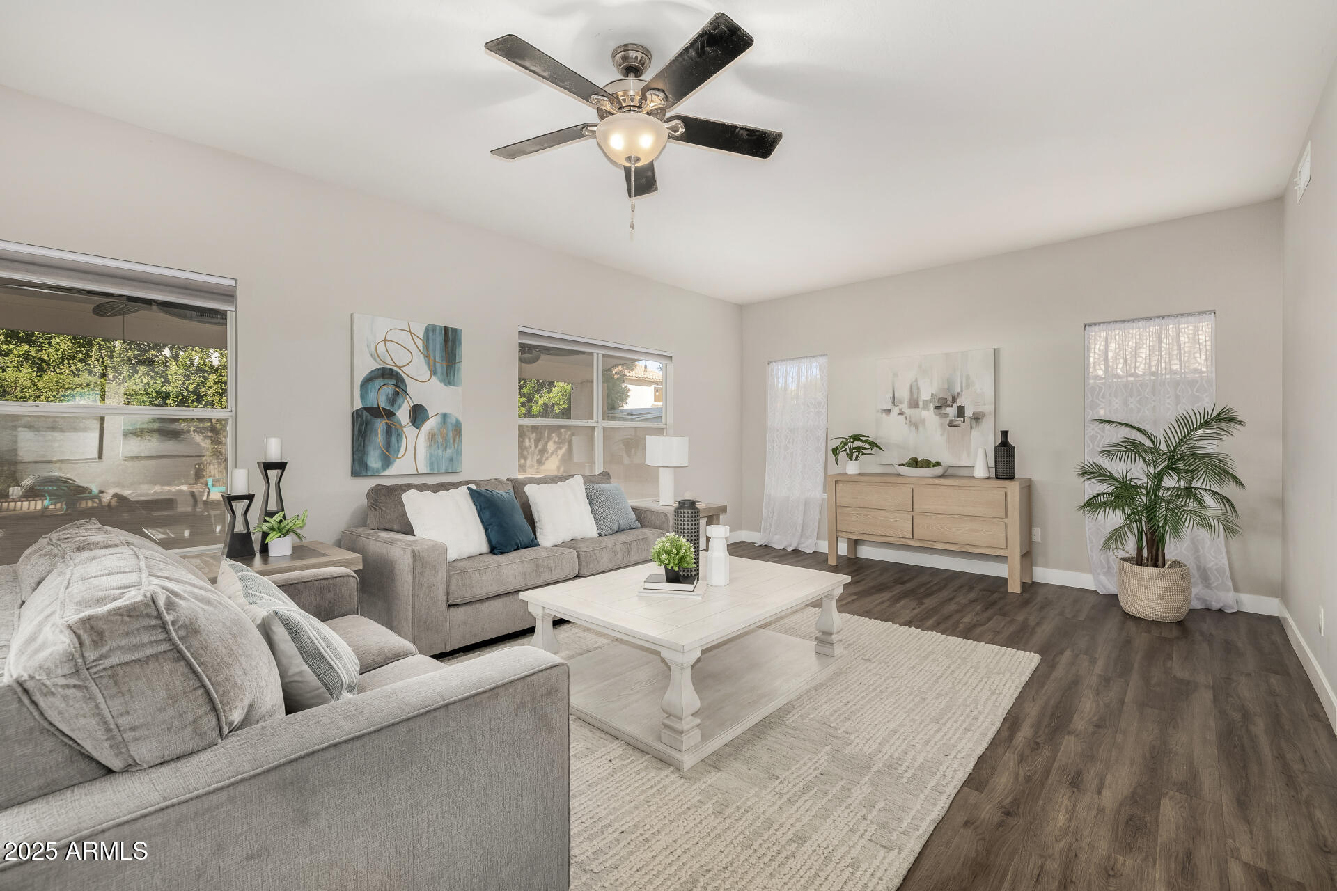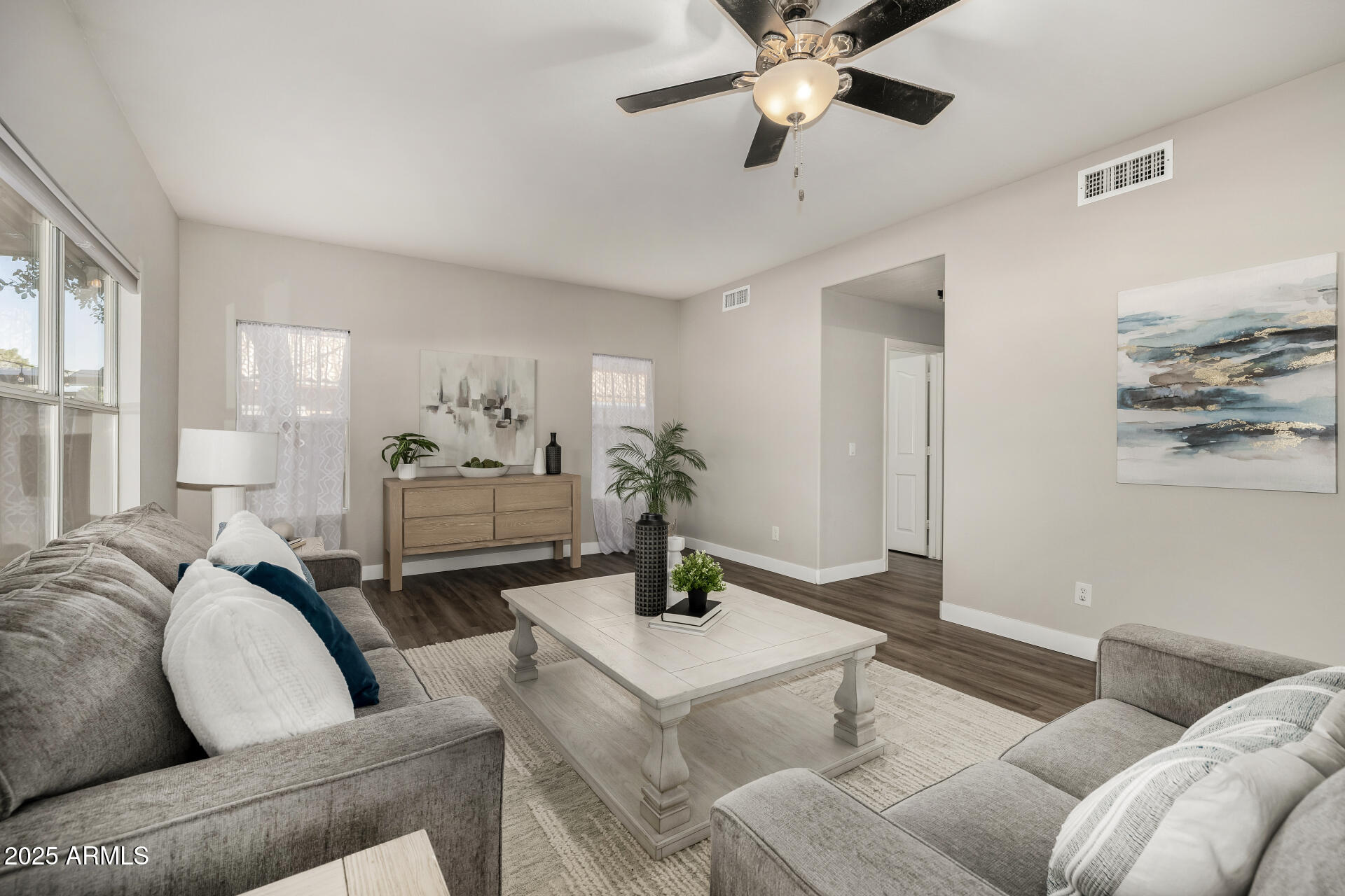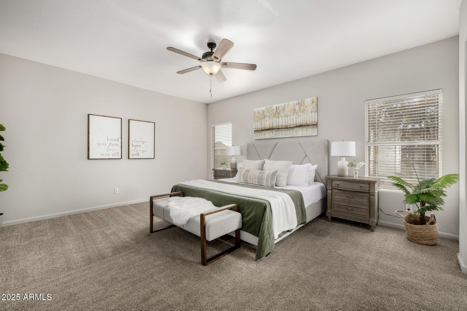 Beautifully updated 5 bed / 3 bath home in the highly desired Rancho Del Mar community--NO HOA and fully upgraded inside and out. This spacious two-story layout features a remodeled kitchen with quartz counters, stainless appliances, large island, updated lighting, and modern finishes throughout. Bright open living spaces include formal living/dining plus a separate family room with soaring ceilings and new flooring. One bedroom and full bath are located downstairs, perfect for guests or multi-gen living. Upstairs offers a large primary suite with remodeled bathroom, double sinks, separate tub/shower, and walk-in closet, along with 3 additional bedrooms and an updated hall bath. Recent improvements include newer AC units, shutters, flooring, and updated bathrooms. The backyard is a private oasis with a PebbleTec pool, covered patio, low-maintenance turf, pavers, and mature landscapingideal for outdoor living. 3-car garage, quiet interior lot, and an unbeatable Mesa location close to the US-60, Loop 101, shopping, dining, and schools. Move-in ready and rarely available in this coveted neighborhood.