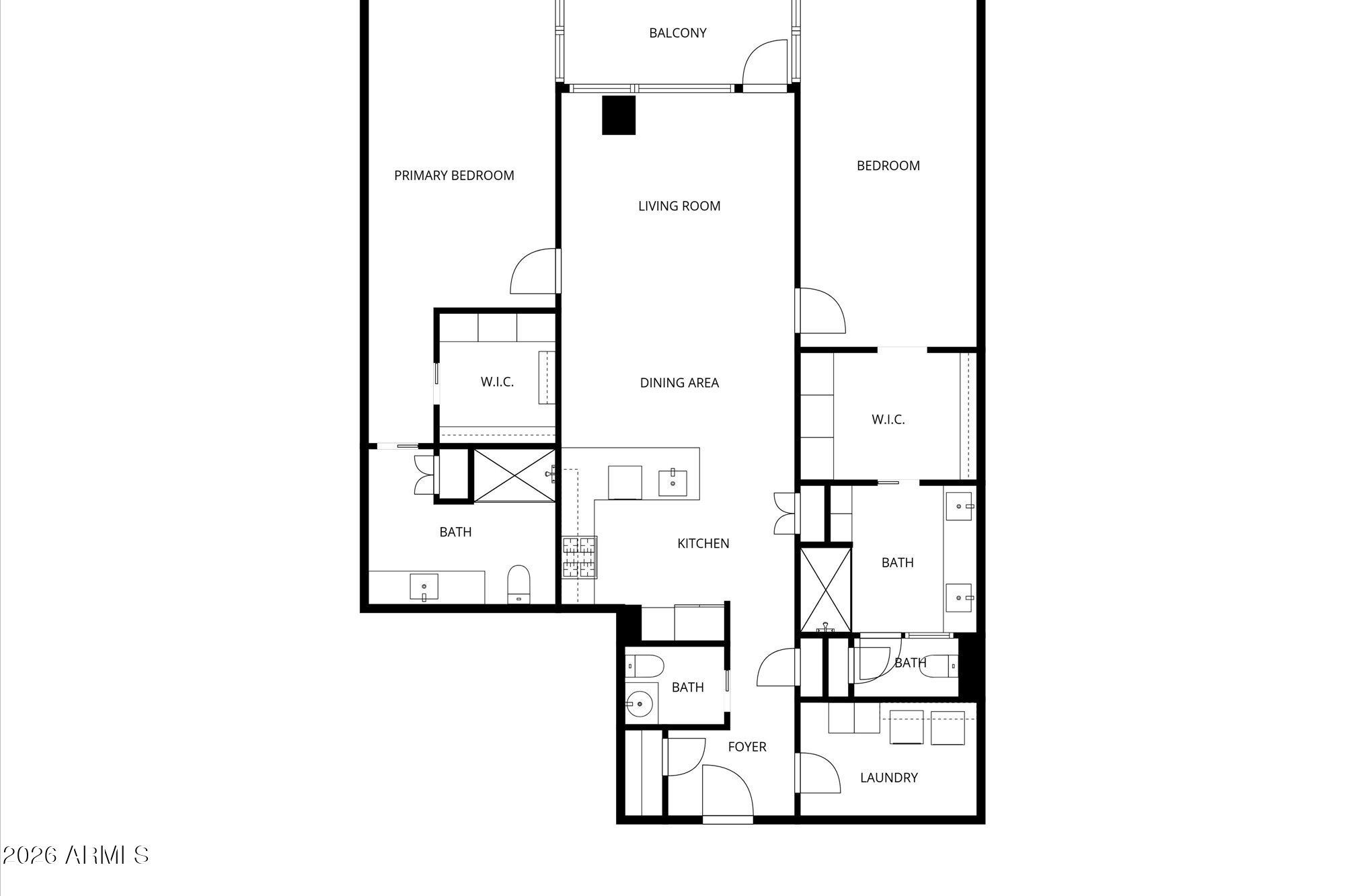 The layout includes two primary bedroom suites, each with its own bath and walk-in closet, plus a third bathroom. Living & dining areas open directly to the balcony, strengthening the indoor-outdoor connection & framing the views.