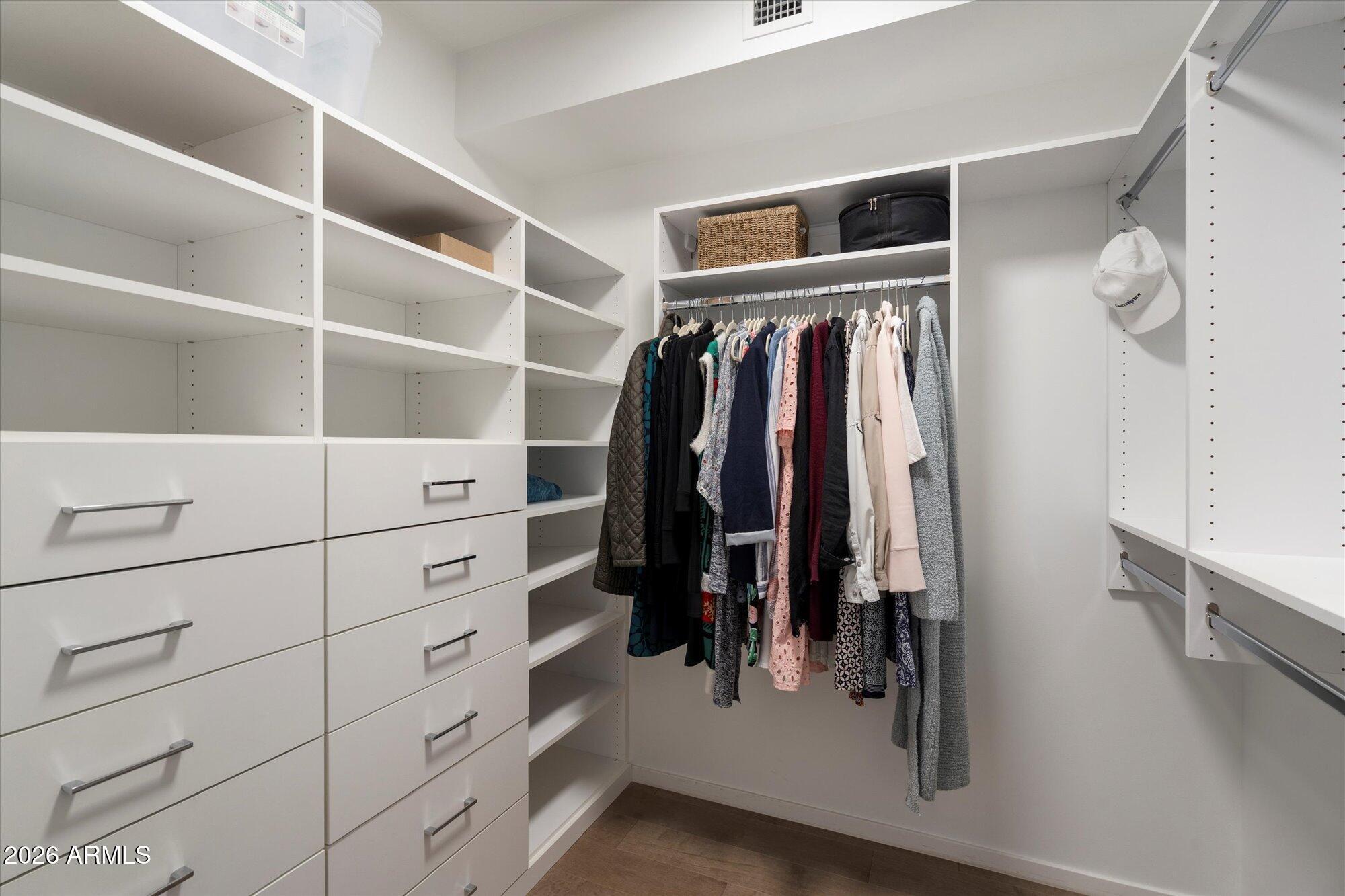 The unit has been thoughtfully upgraded by the current owner with wide-plank Mirage hardwood flooring in the bedrooms and closets, custom built-in closets, motorized blinds, ceiling fans, & additional improvements. ...CONTINUE READING.... A large laundry room with ample cabinetry, linen storage in the baths, and an entry coat closet provide excellent storage and functionality.