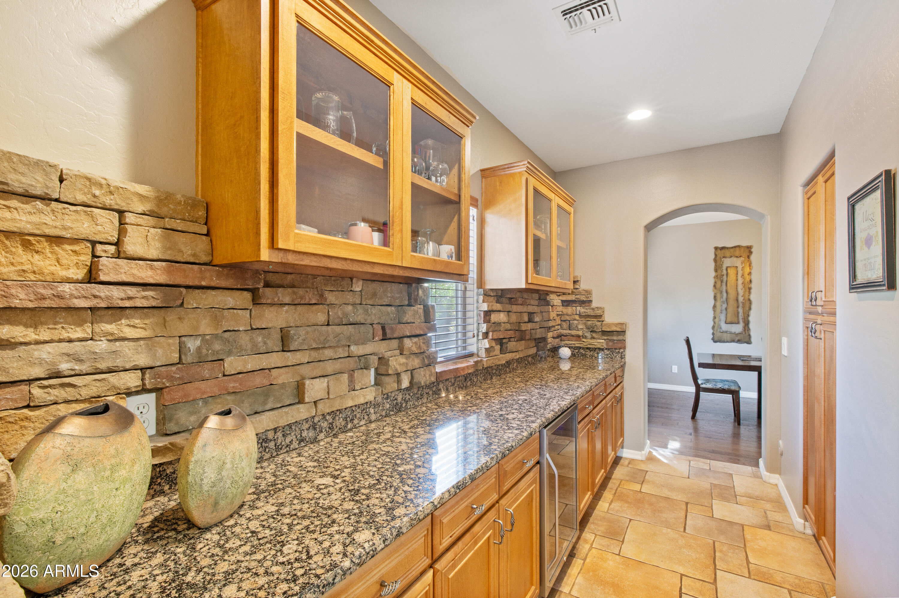 Situated on nearly half an acre in a private cul-de-sac, this 5-bedroom, 3.5-bath estate offers space, sophistication, and exceptional functionality. The grand entry welcomes you into a versatile front living area currently styled as a billiards room, along with a private office complete with a Murphy bed and oversized closet--ideal for guests or multi-generational living. Designed for entertaining, the formal dining room seamlessly connects to a butler's pantry, beverage center, walk-in pantry, and a dedicated wine room--perfect for showcasing and storing your collection. The gourmet kitchen is a showstopper, boasting a massive island, newer appliances, gas cooktop, double ovens, and a dramatic designer vent hood--all opening to the expansive family room with breathtaking views of the resort-style backyard.