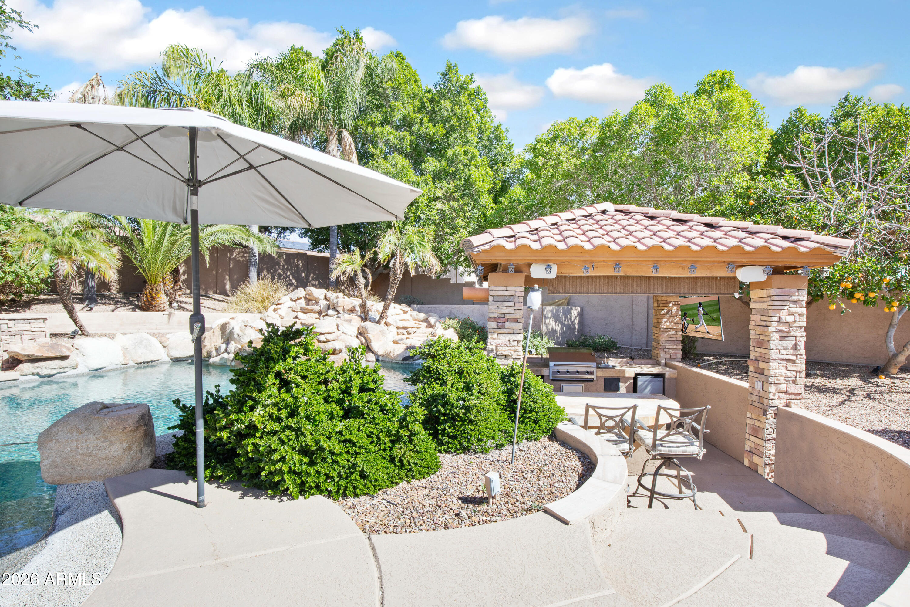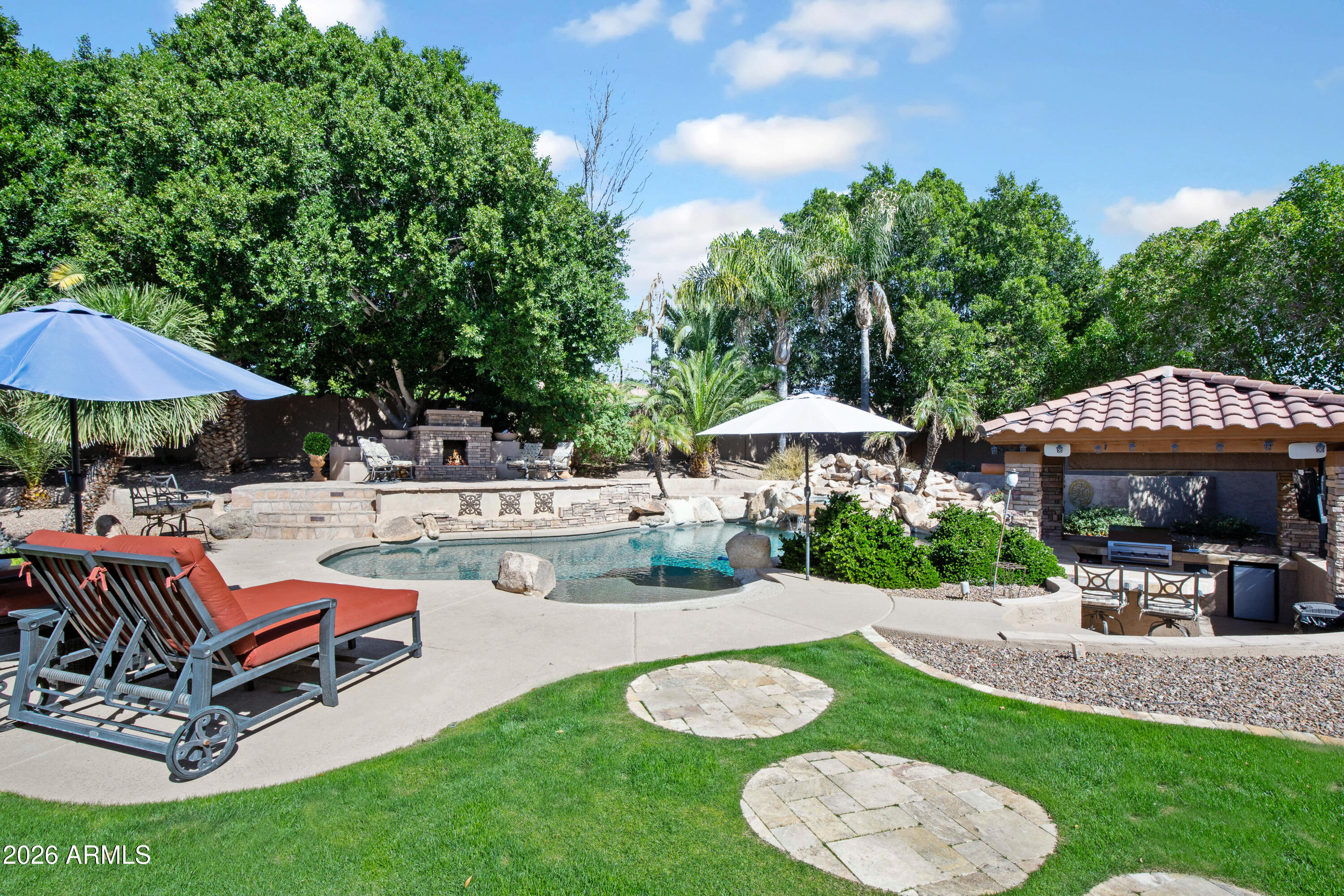 Step outside to your own private oasis. The beautifully designed pebble-tec pool features a swim-up bar, while the gazebo with built-in BBQ creates the ultimate outdoor kitchen experience. An elevated seating area with a cozy fireplace overlooks the pool, offering the perfect setting for evening gatherings. With exceptional privacy and multiple entertainment spaces, this backyard was made for hosting.