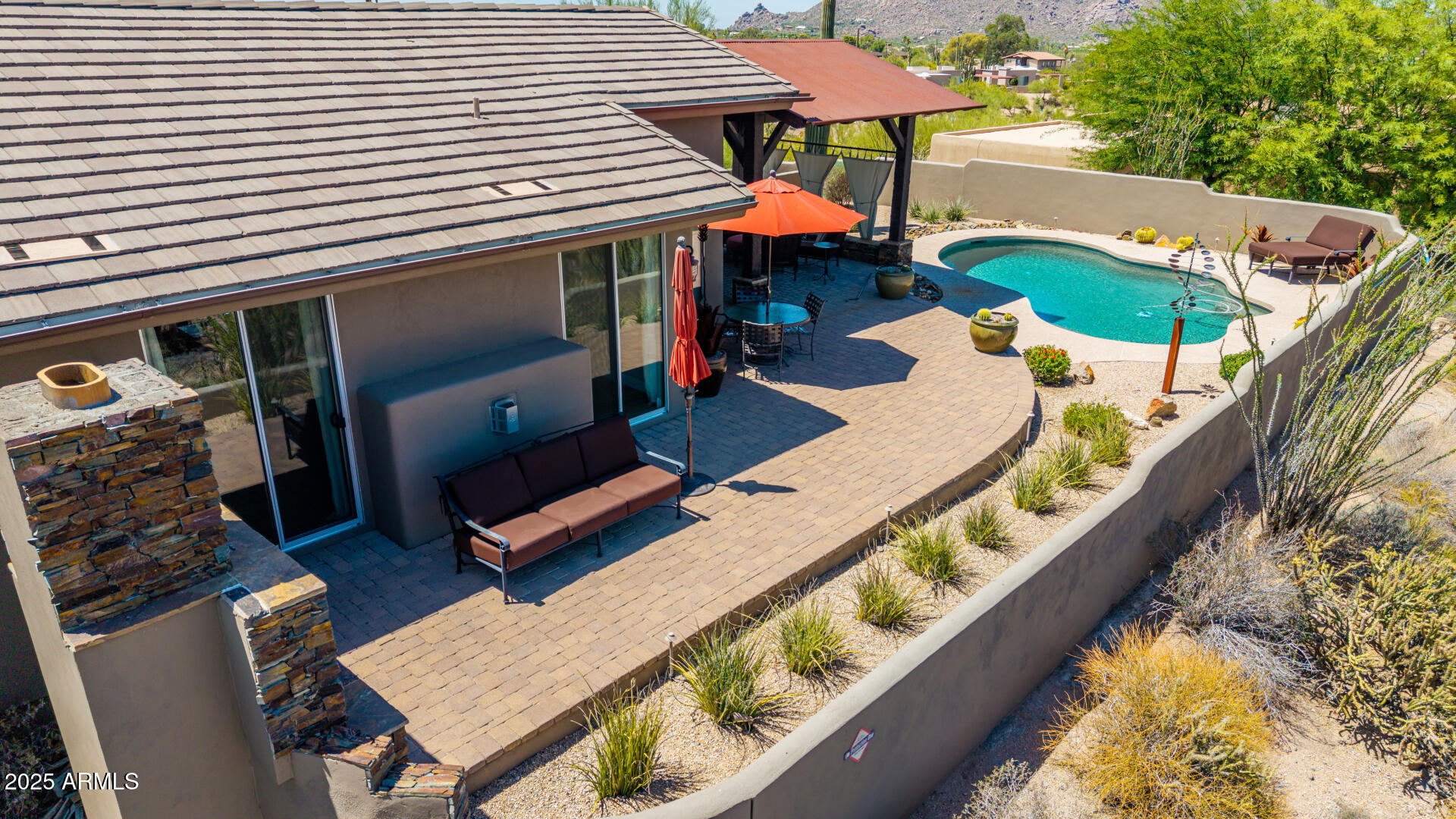 The backyard is resort-style. Built-in BBQ, paver patio, covered gazebo, outdoor fireplace, and a sparkling pool. All low maintenance and designed for easy indoor-outdoor living.