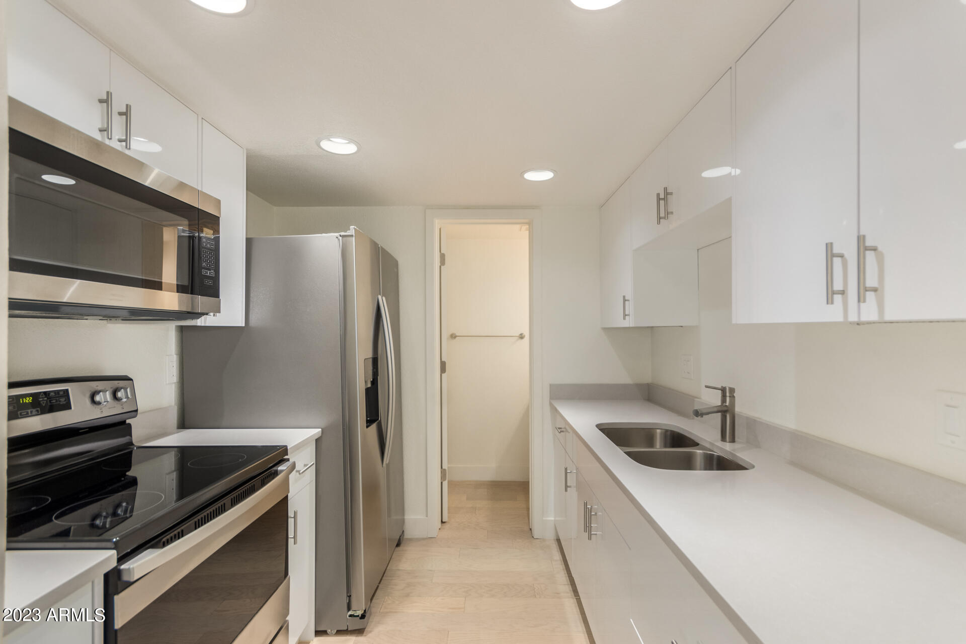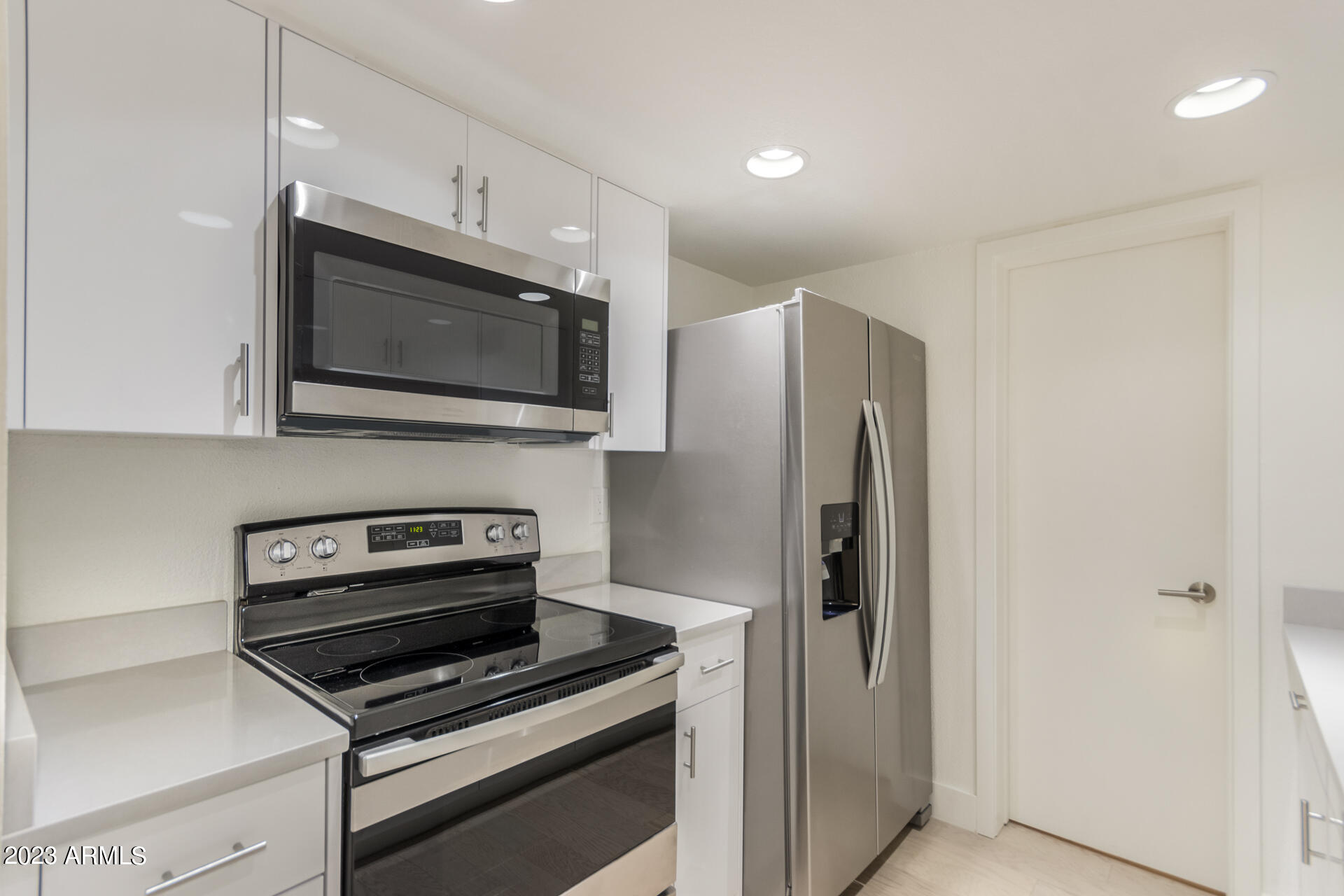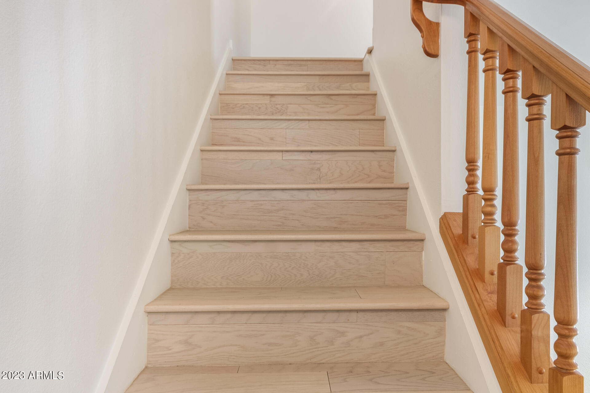 Wood floor throughout. Custom oak handrail keeps you secure on stairs. Soft-close custom cabinets with quartzite countertops. Side-by-side fridge with water/ice dispenser. (see doc for specifics).
