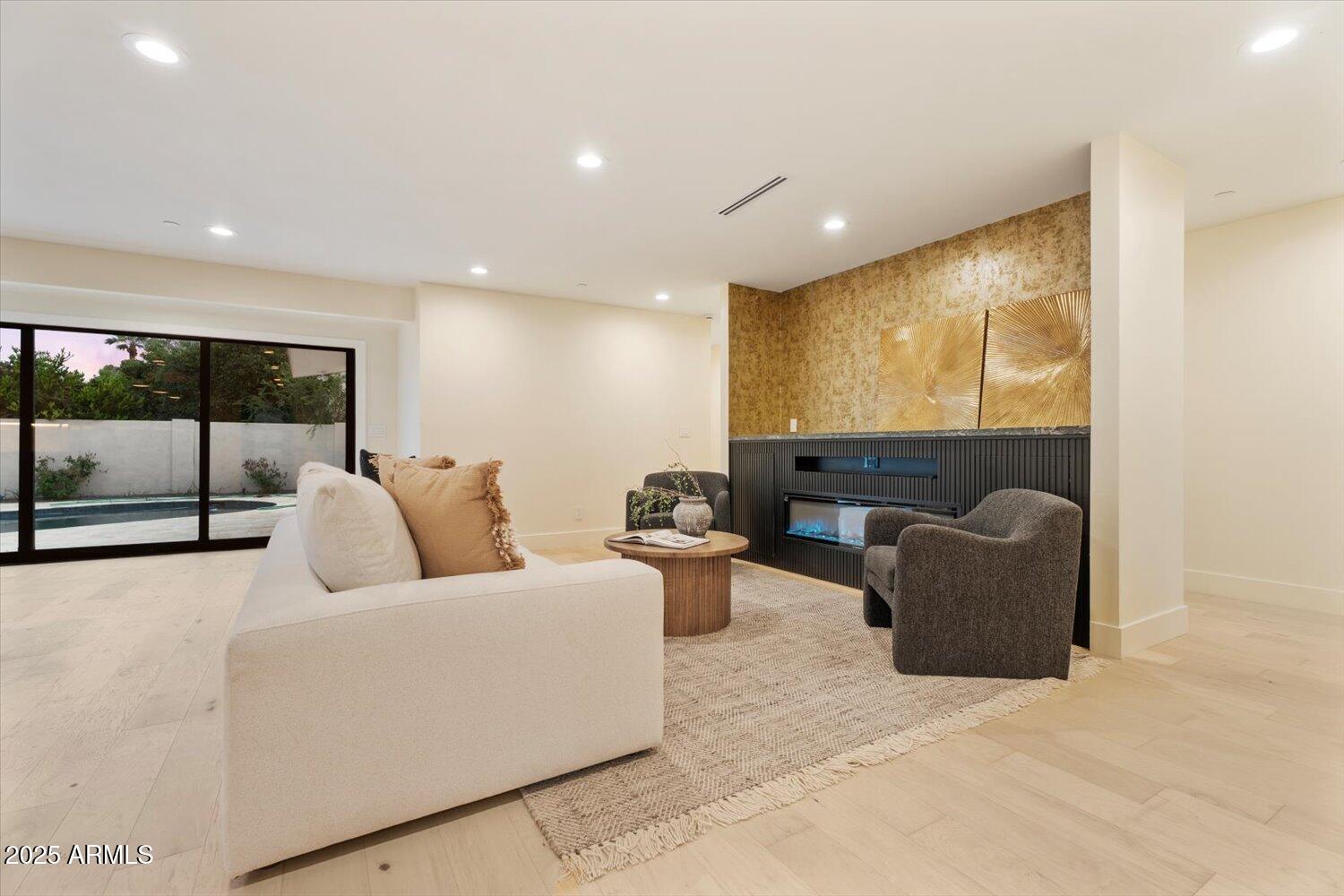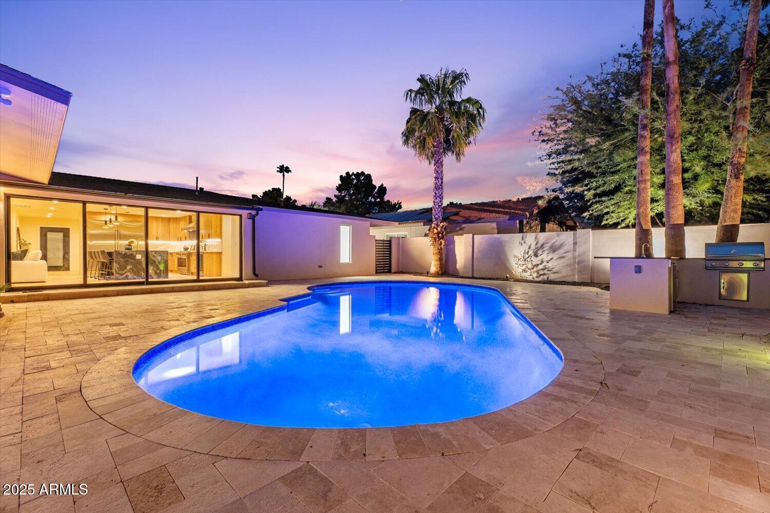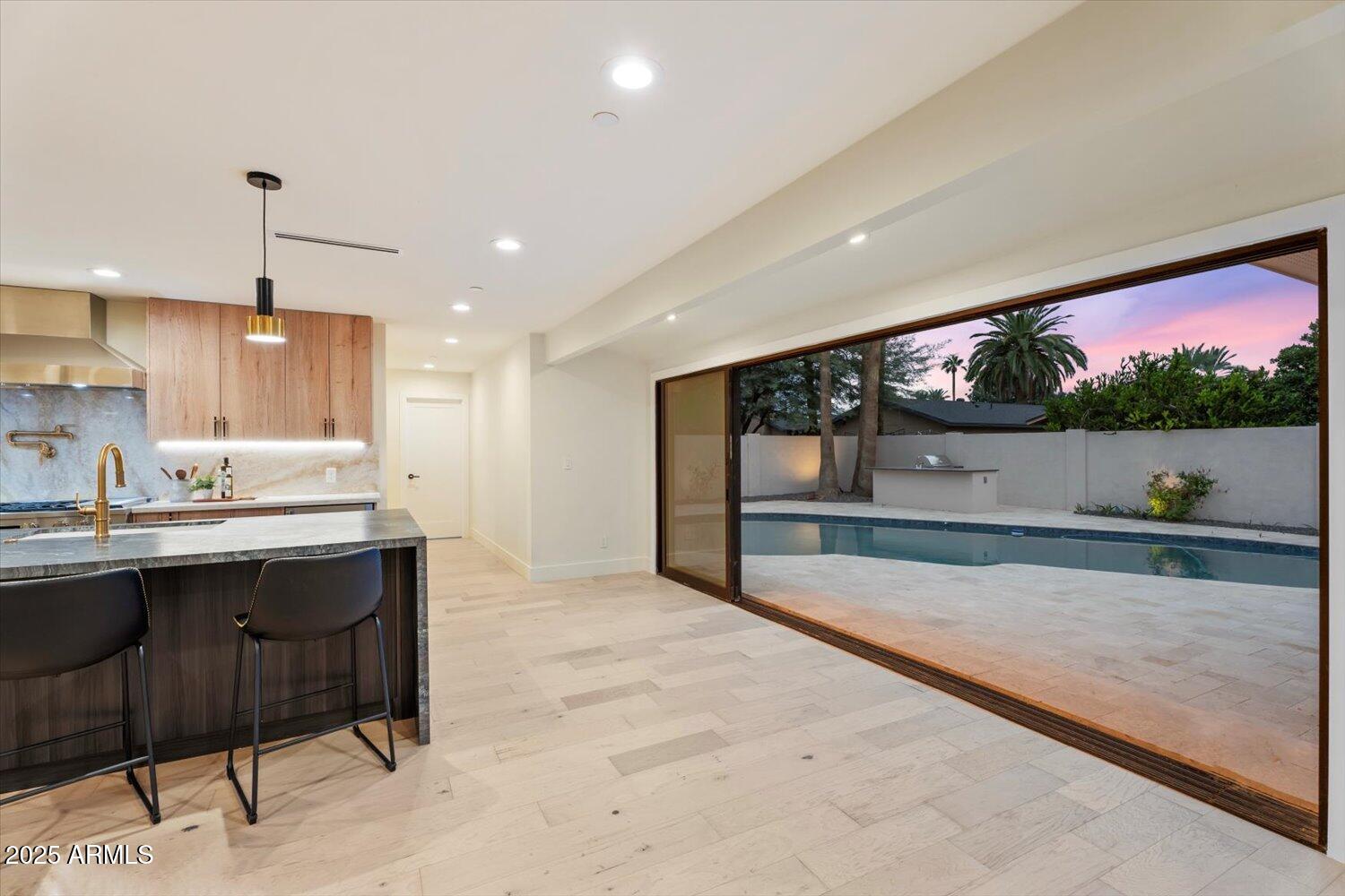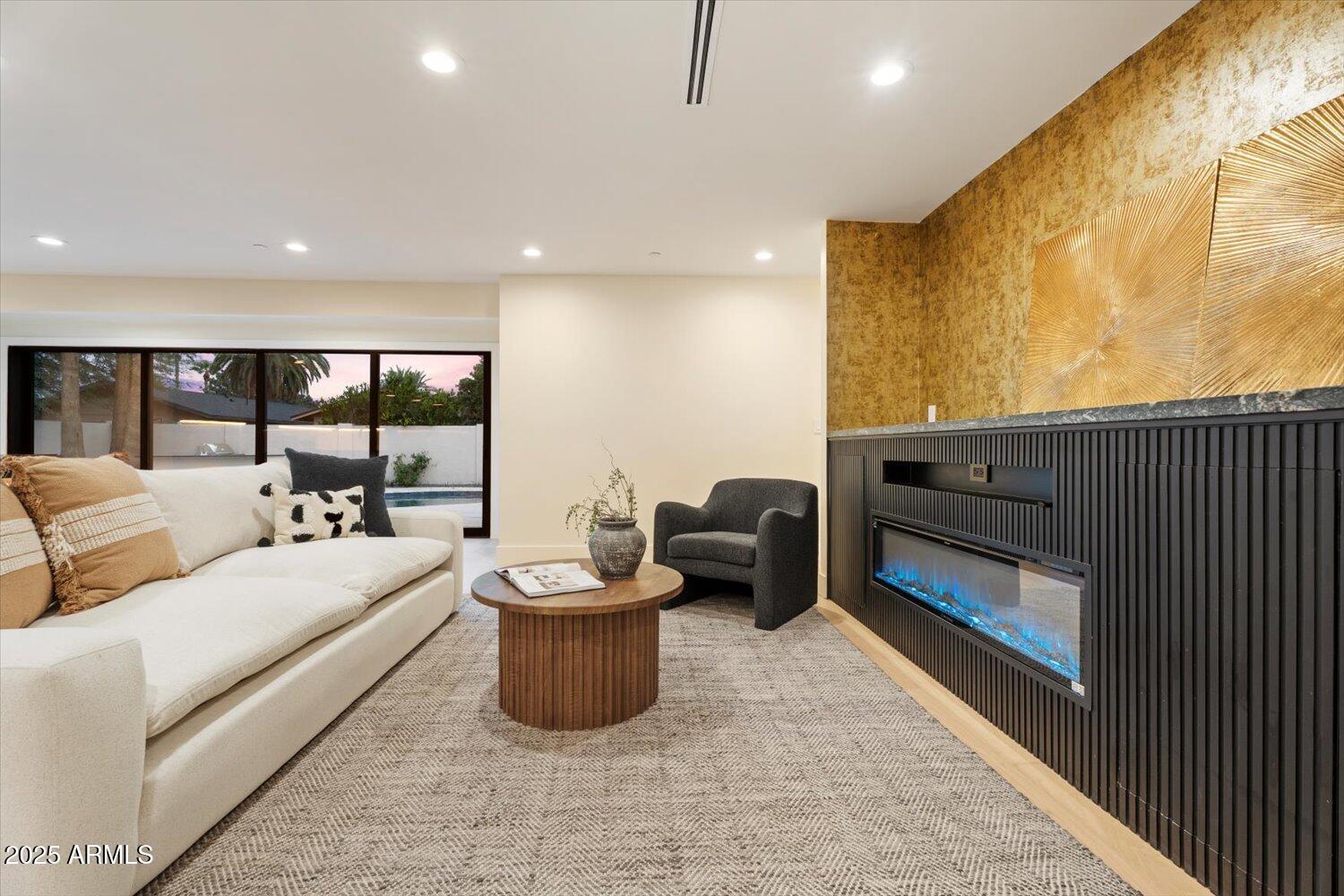 Rebuilt from the studs up, this stunning home blends modern luxury with timeless design. Warm engineered hardwood floors and a custom fireplace set the tone for effortless elegance. The gourmet kitchen features custom cabinetry, granite counters, a 48'' Monogram range, 60'' fridge/freezer, wine cooler, and spacious pantry. A retractable glass wall opens to a heated pool, spa, paver patio, and outdoor kitchen. Each bedroom offers an en-suite bath, while the primary suite boasts a freestanding tub and dual vanity. New HVAC, plumbing, electrical, and more ensure peace of mind. Epoxy garage with Tesla charger completes this remarkable home.