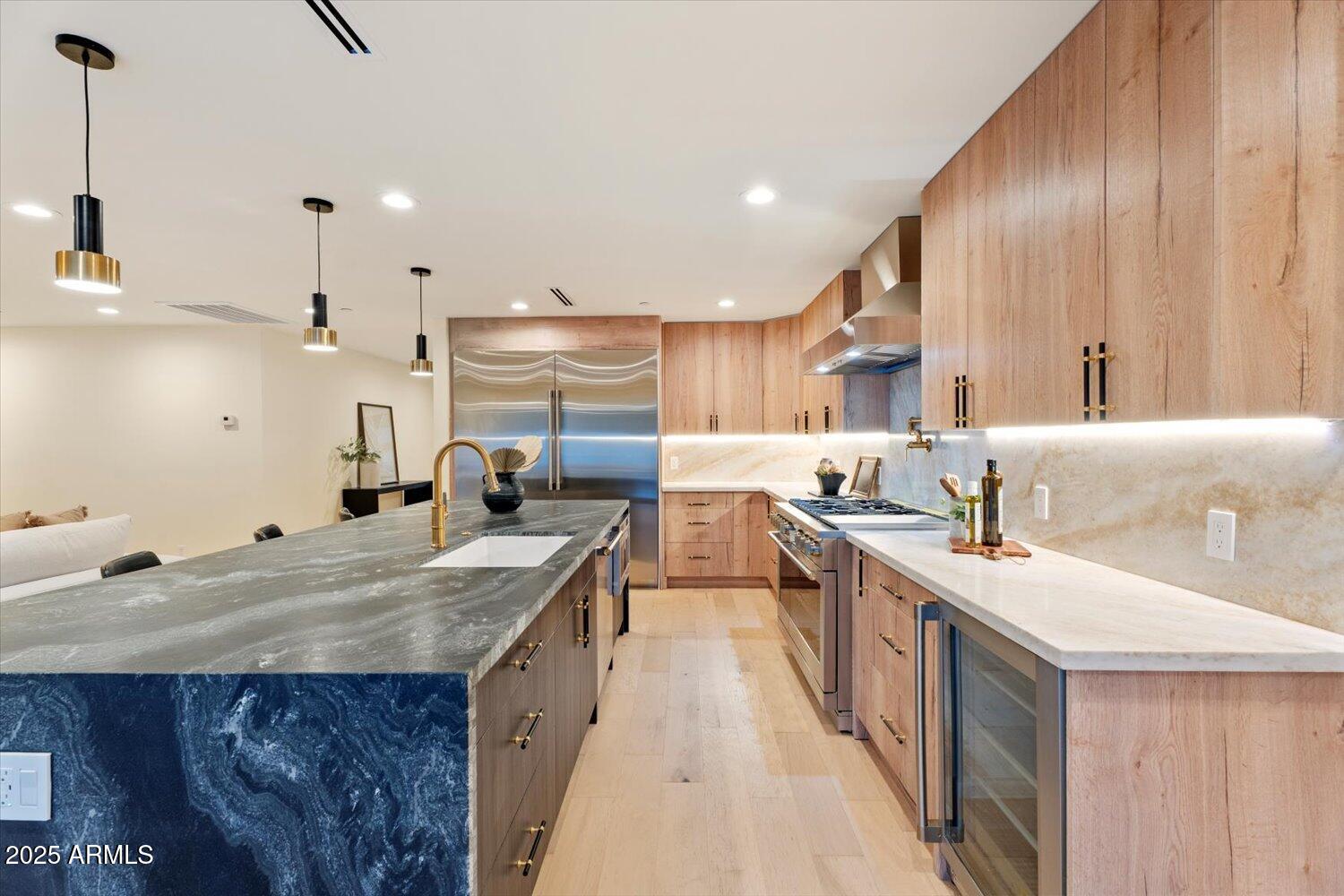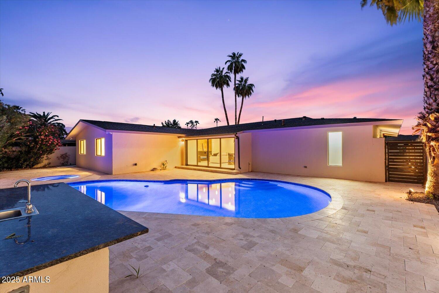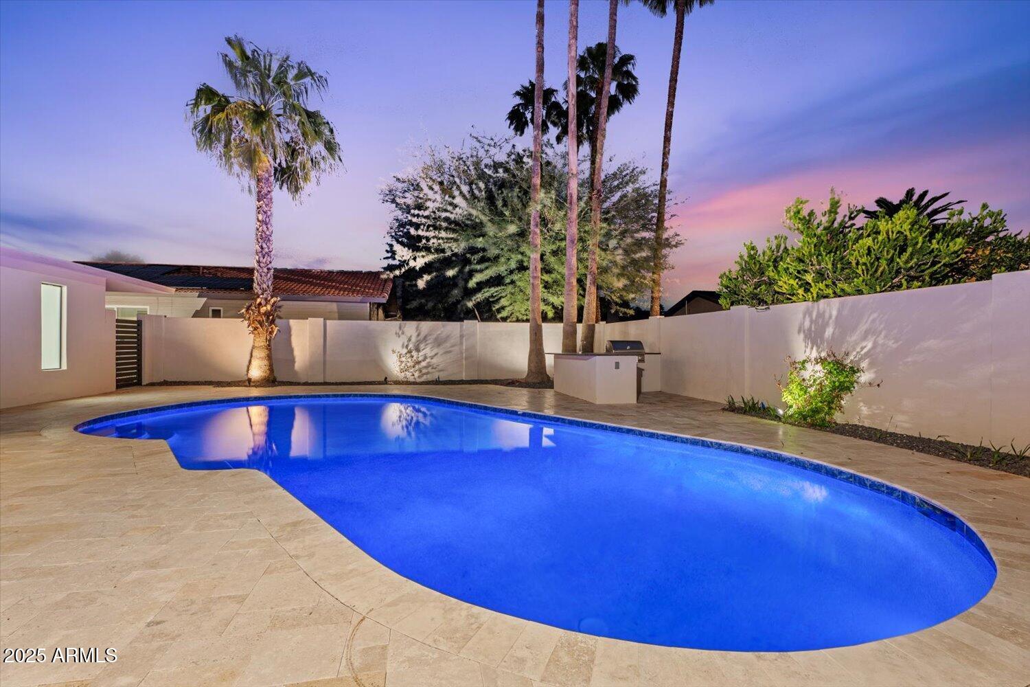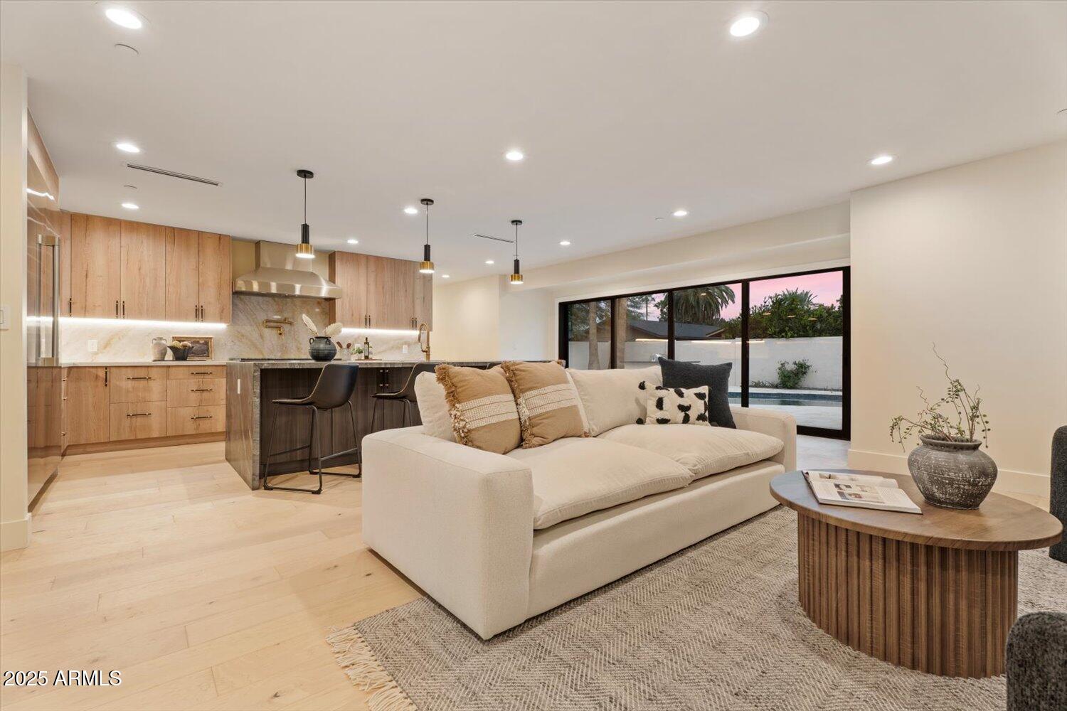 Rebuilt from the studs up, this stunning home blends modern luxury with timeless design. Warm engineered hardwood floors and a custom fireplace set the tone for effortless elegance. The gourmet kitchen features custom cabinetry, granite counters, a 48'' Monogram range, 60'' fridge/freezer, wine cooler, and spacious pantry. A retractable glass wall opens to a heated pool, spa, paver patio, and outdoor kitchen. Each bedroom offers an en-suite bath, while the primary suite boasts a freestanding tub and dual vanity. New HVAC, plumbing, electrical, and more ensure peace of mind. Epoxy garage with Tesla charger completes this remarkable home.