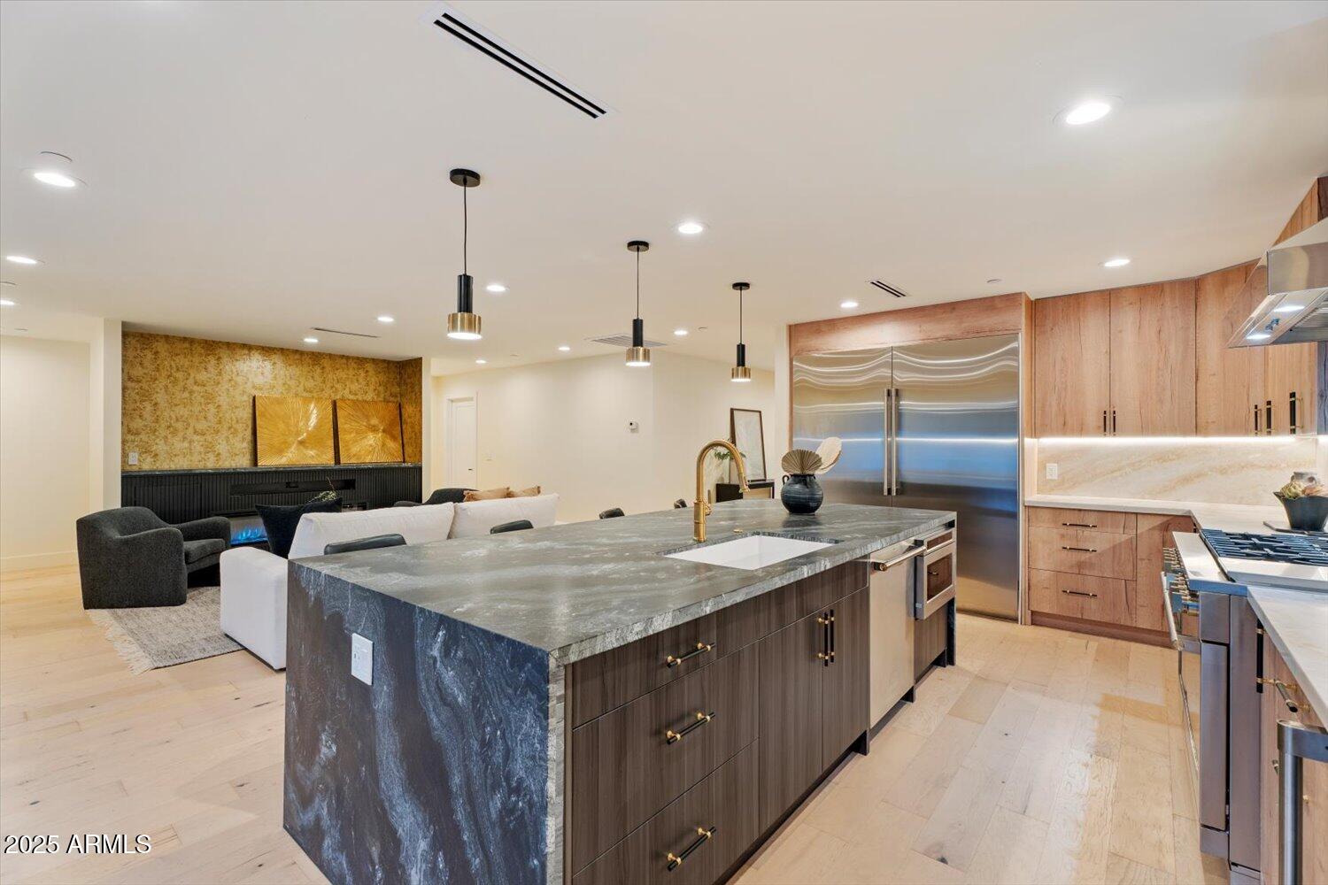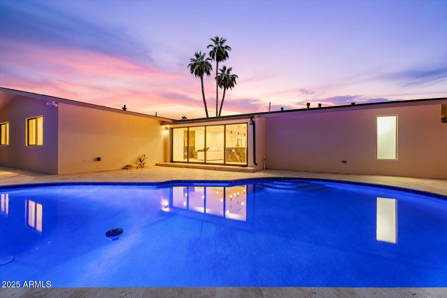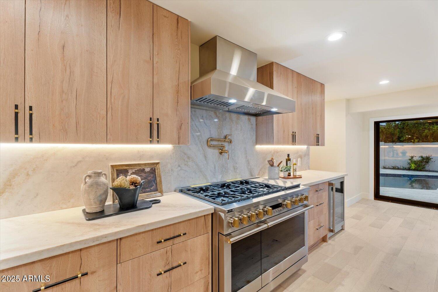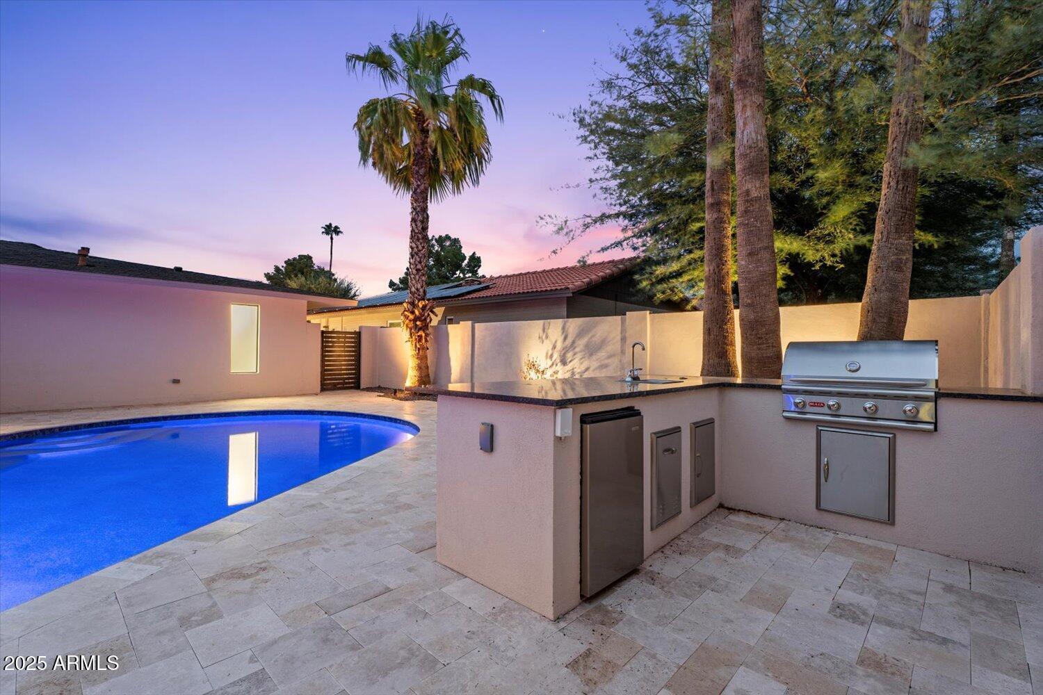 Rebuilt from the studs up, this stunning home blends modern luxury with timeless design. Warm engineered hardwood floors and a custom fireplace set the tone for effortless elegance. The gourmet kitchen features custom cabinetry, granite counters, a 48'' Monogram range, 60'' fridge/freezer, wine cooler, and spacious pantry. A retractable glass wall opens to a heated pool, spa, paver patio, and outdoor kitchen. Each bedroom offers an en-suite bath, while the primary suite boasts a freestanding tub and dual vanity. New HVAC, plumbing, electrical, and more ensure peace of mind. Epoxy garage with Tesla charger completes this remarkable home.