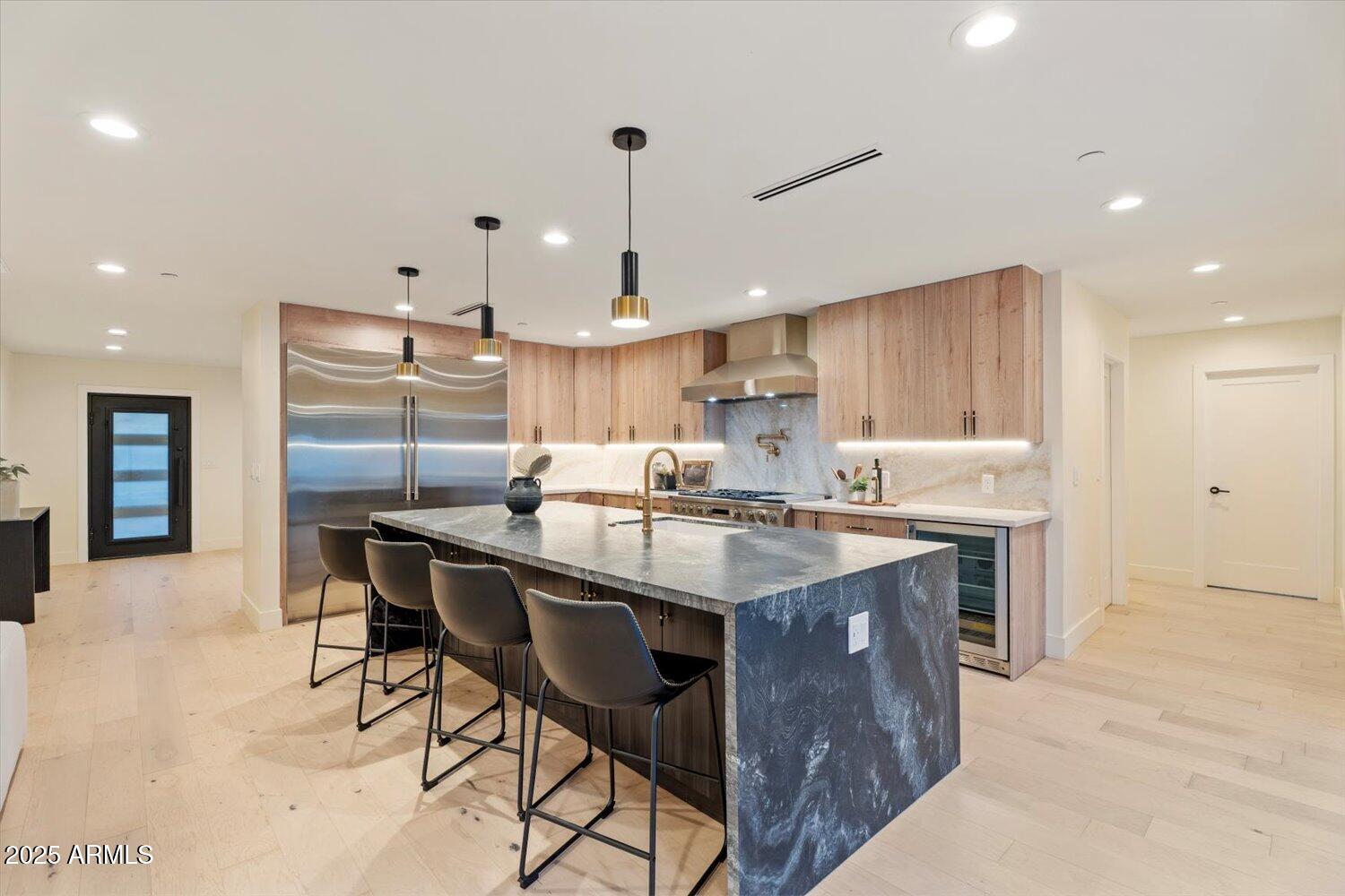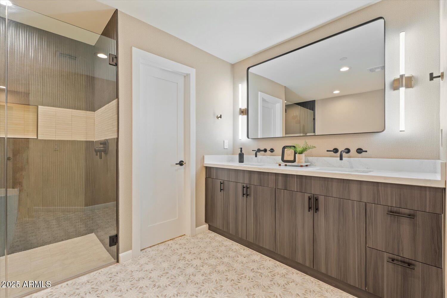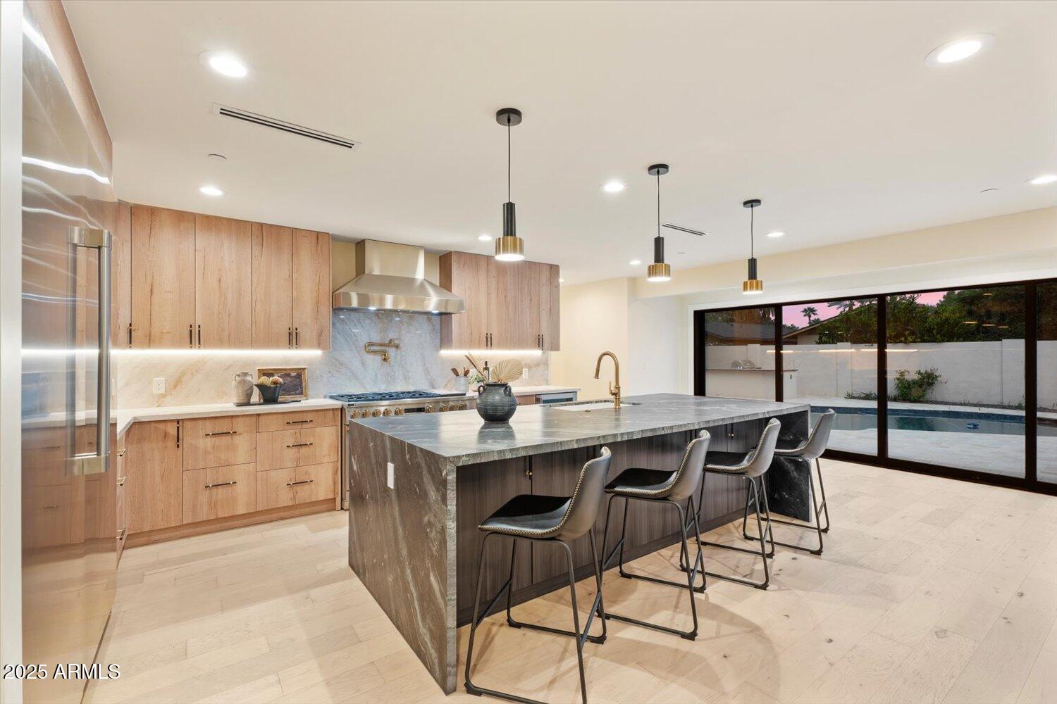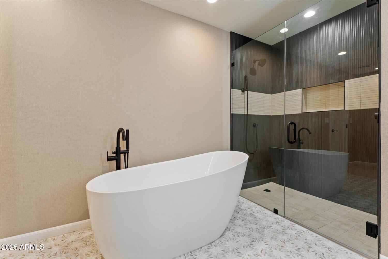 Rebuilt from the studs up, this stunning home blends modern luxury with timeless design. Warm engineered hardwood floors and a custom fireplace set the tone for effortless elegance. The gourmet kitchen features custom cabinetry, granite counters, a 48'' Monogram range, 60'' fridge/freezer, wine cooler, and spacious pantry. A retractable glass wall opens to a heated pool, spa, paver patio, and outdoor kitchen. Each bedroom offers an en-suite bath, while the primary suite boasts a freestanding tub and dual vanity. New HVAC, plumbing, electrical, and more ensure peace of mind. Epoxy garage with Tesla charger completes this remarkable home.