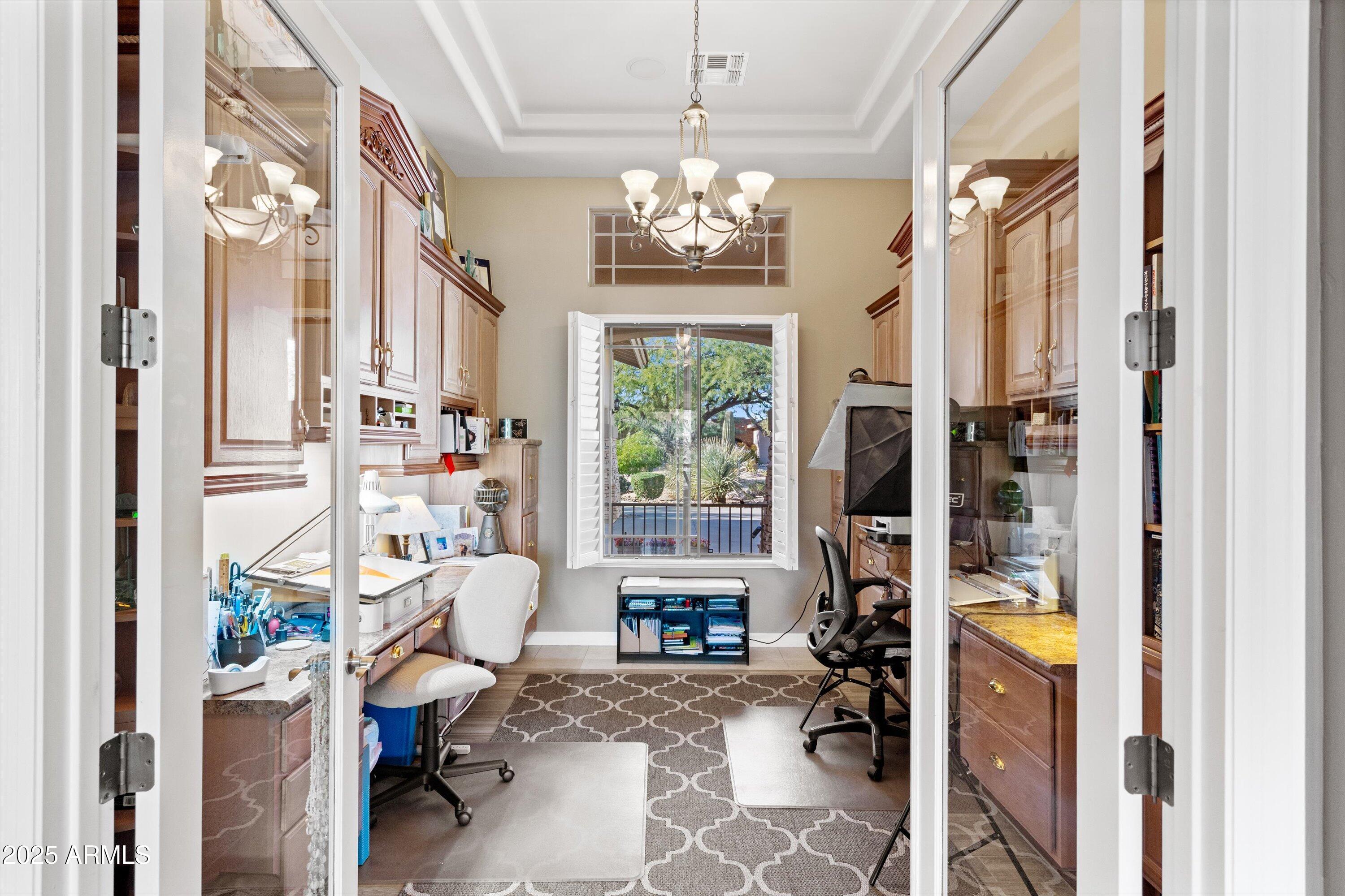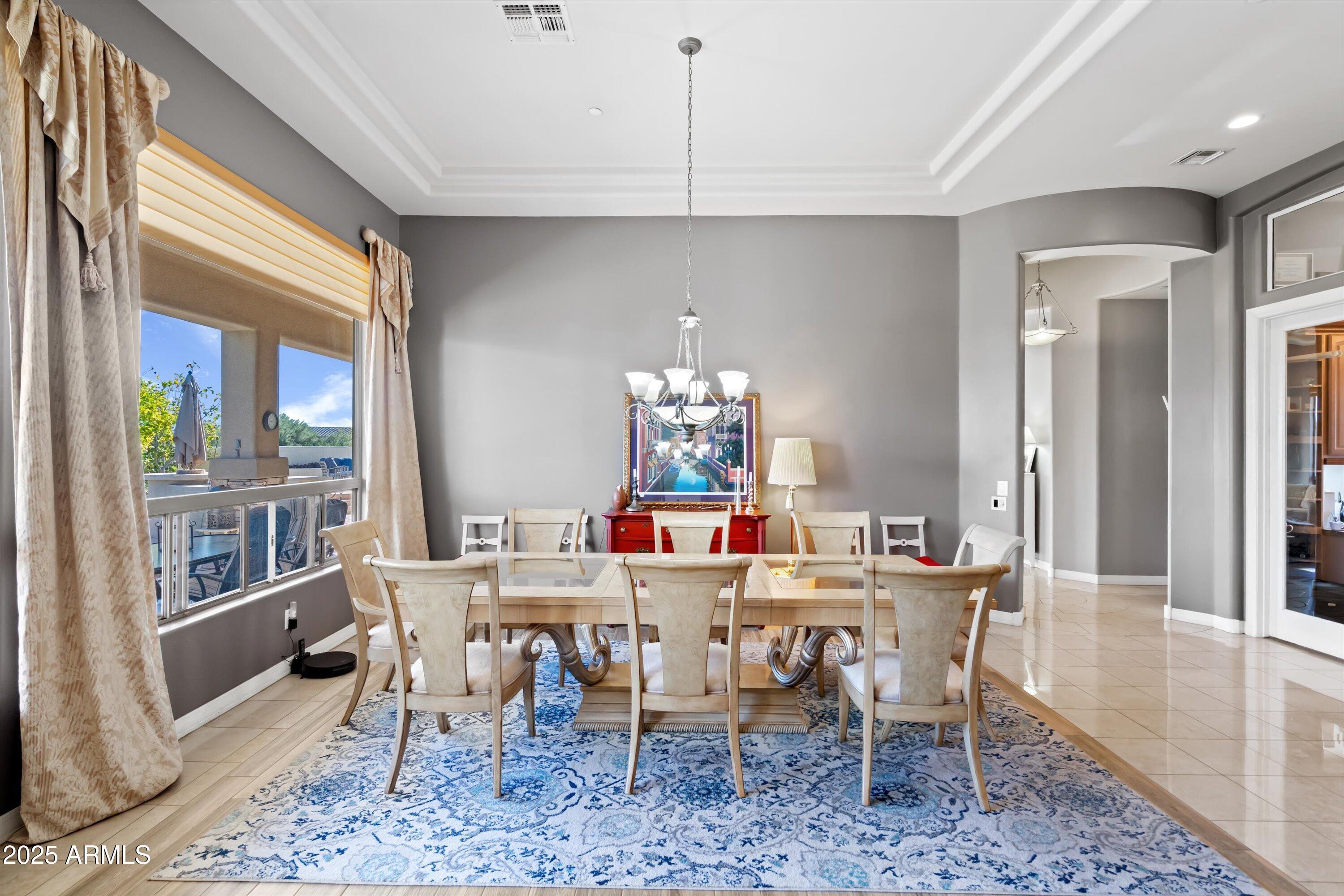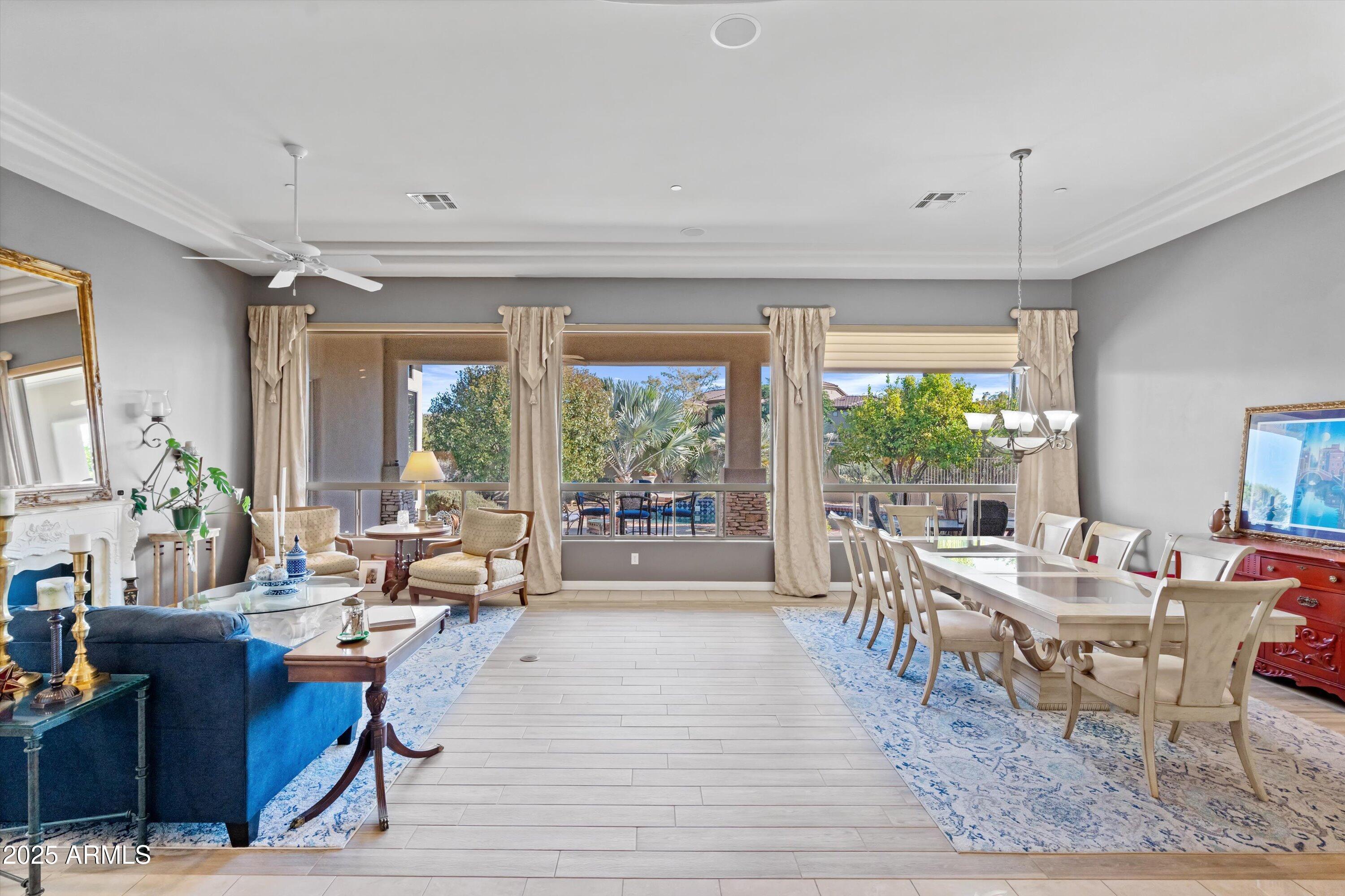 Inside, the spacious great room boasts tall tray ceilings and expansive windows showcasing the backyard and views. The gourmet kitchen and open layout make it perfect for entertaining. The luxurious primary suite includes a jetted tub, oversized shower, and elegant glass block details. Additional highlights include generously sized bedrooms, a bonus room, and a private den. Step outside to a resort-style backyard with multiple seating areas, a built-in BBQ, sparkling pool and spa and private balcony.