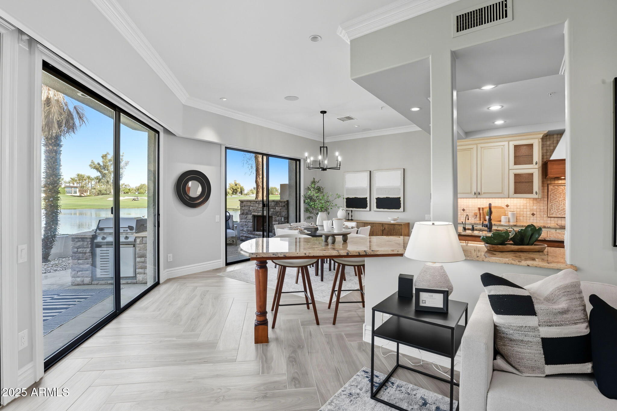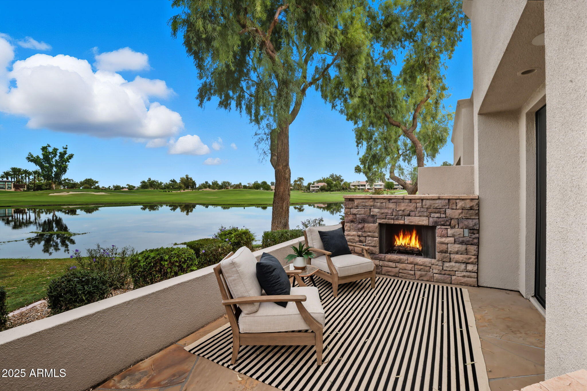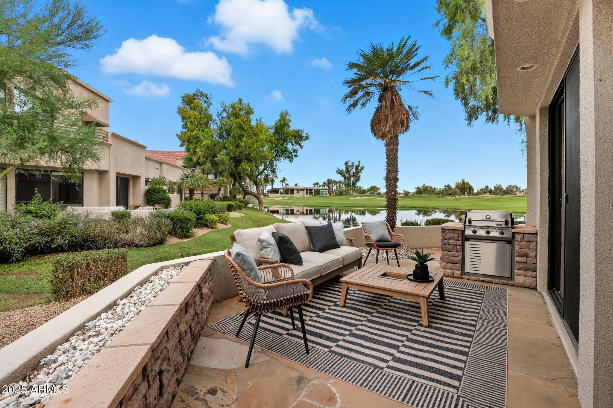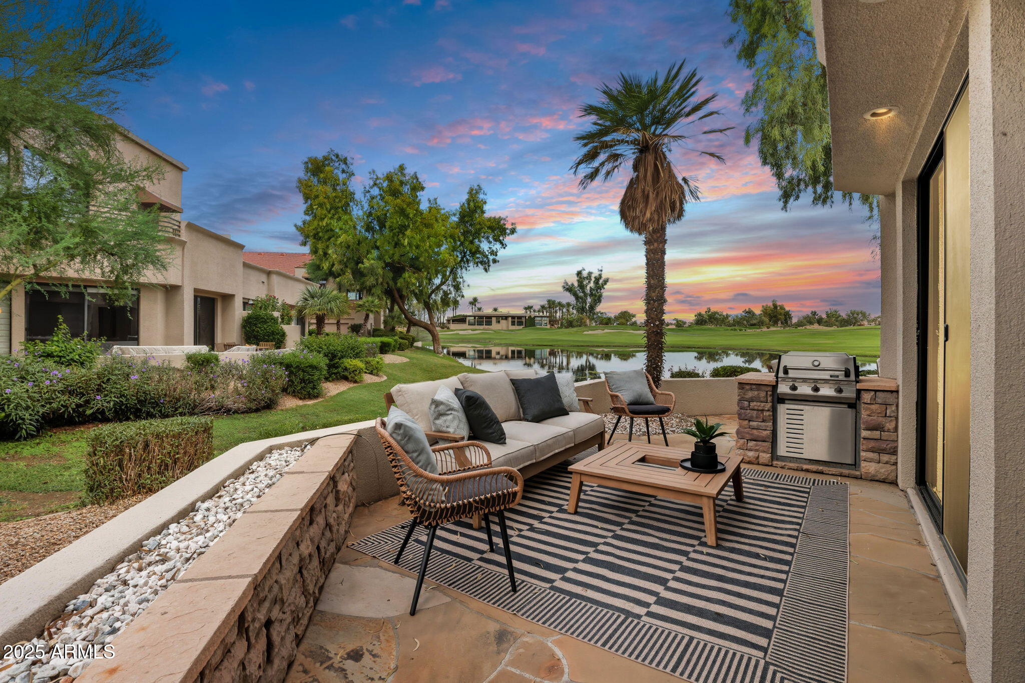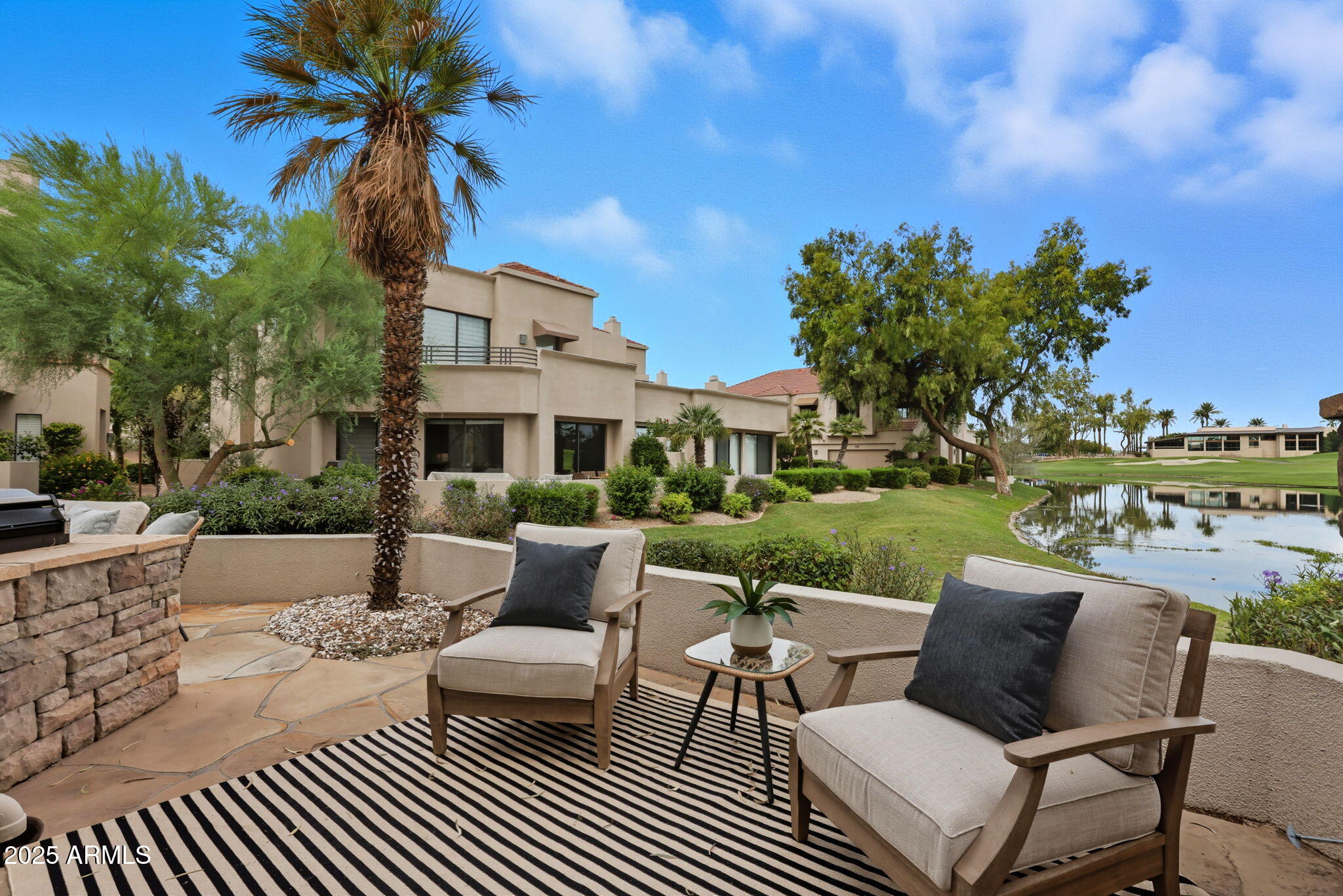 Experience the Gainey Ranch lifestyle in this remodeled & expanded 3 bed, 3 bath home showcasing breathtaking views of the golf course, lake, mountains & clubhouse. The spacious great room opens to a wraparound patio with BBQ & stone fireplace, ideal for entertaining. The gourmet kitchen features granite counters, a large island, custom cabinetry, two breakfast bars & top-of-the-line appliances, plus a custom bar with 200-bottle wine fridge. Upstairs, the primary suite offers a private balcony, sitting area, walk-in closet & spa bath with jacuzzi tub. Two additional bedrooms and a flexible exercise or bonus room complete the layout. Enjoy resort-style living with pools, spas, walking trails, and world-class dining & shopping nearby--plus the Hyatt Regency just steps away.