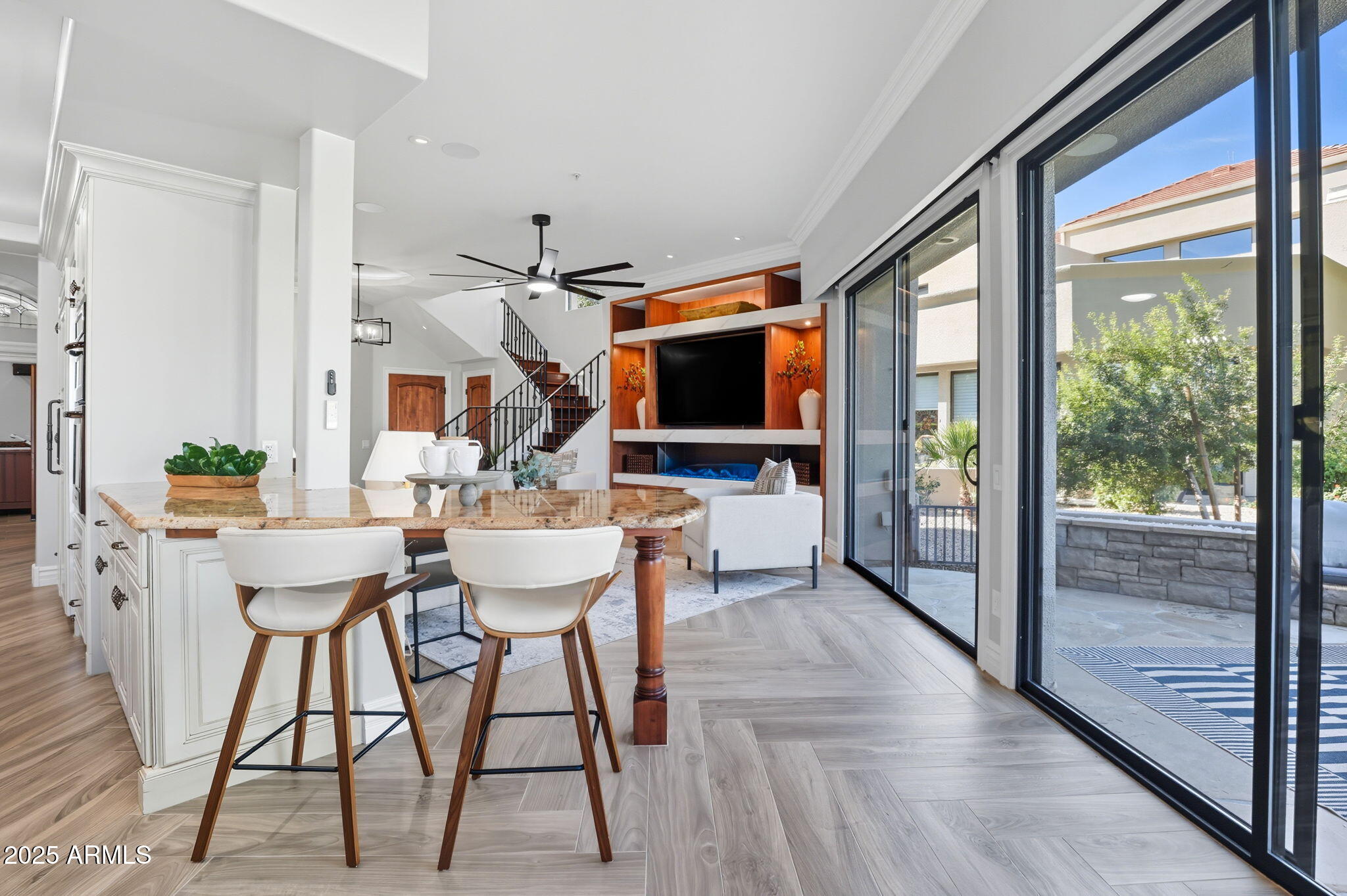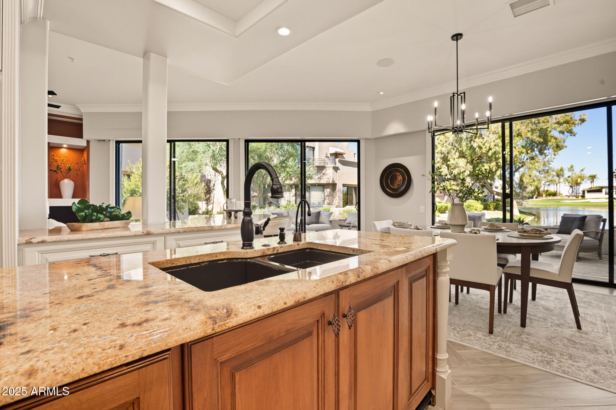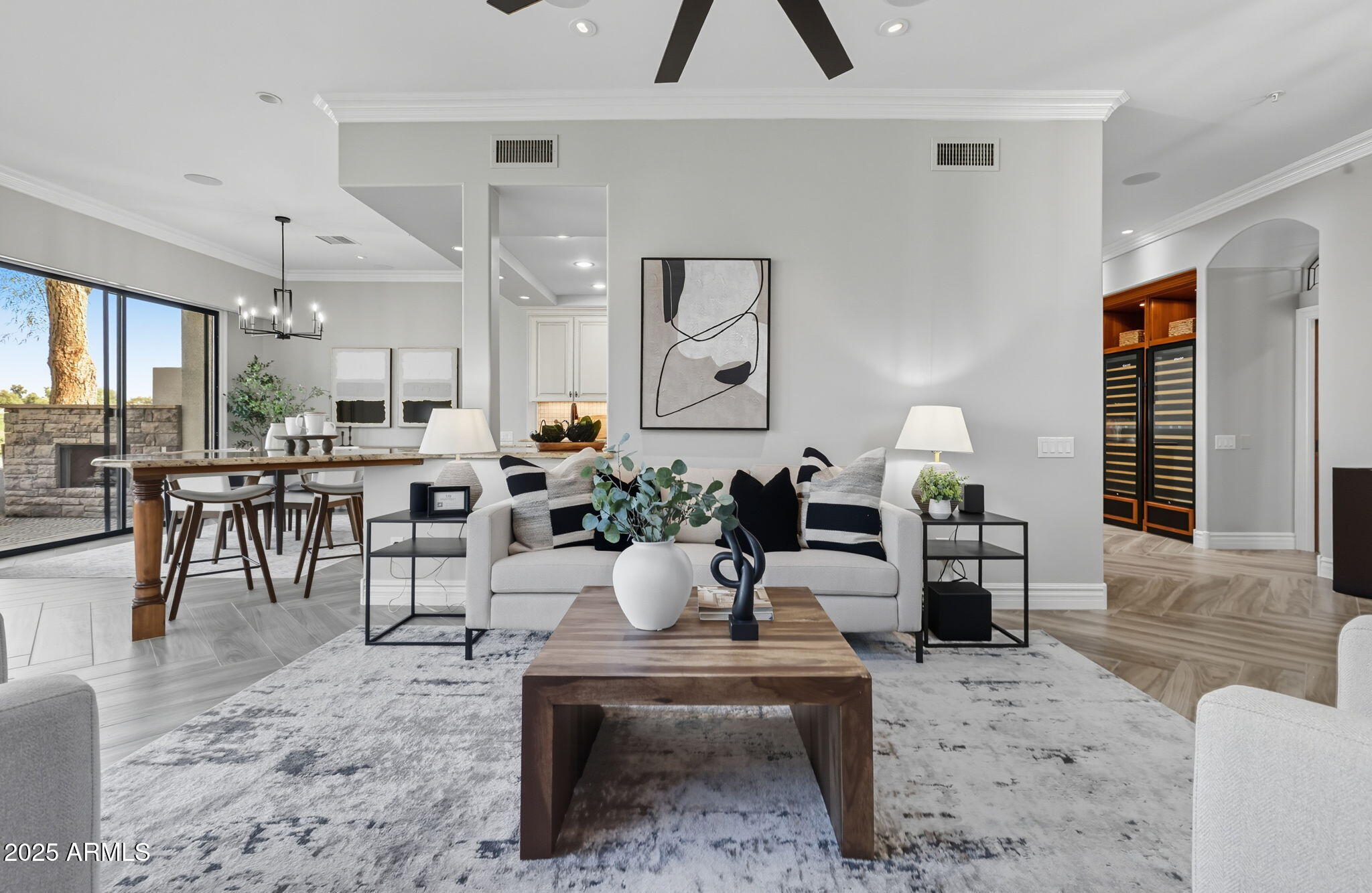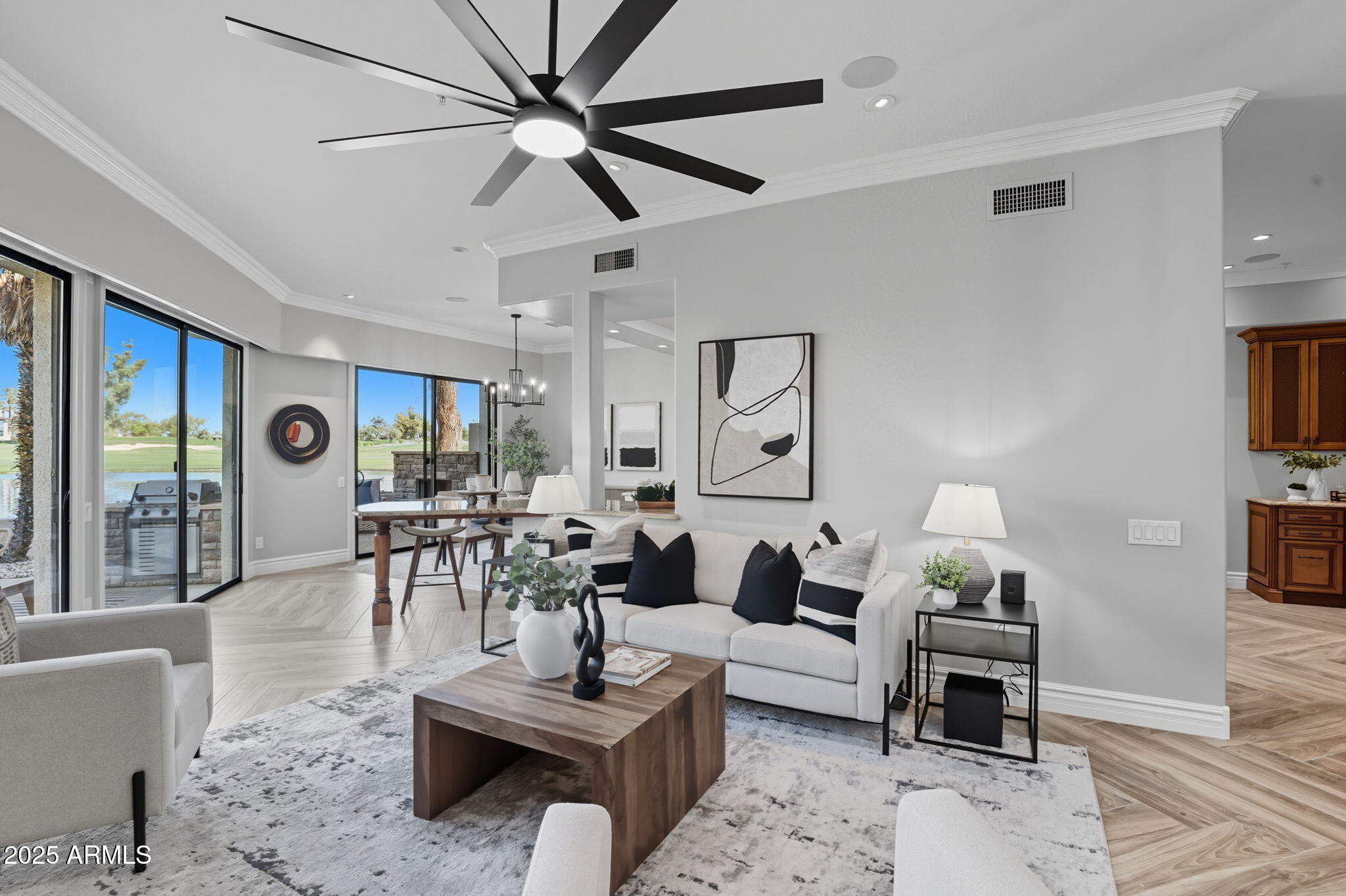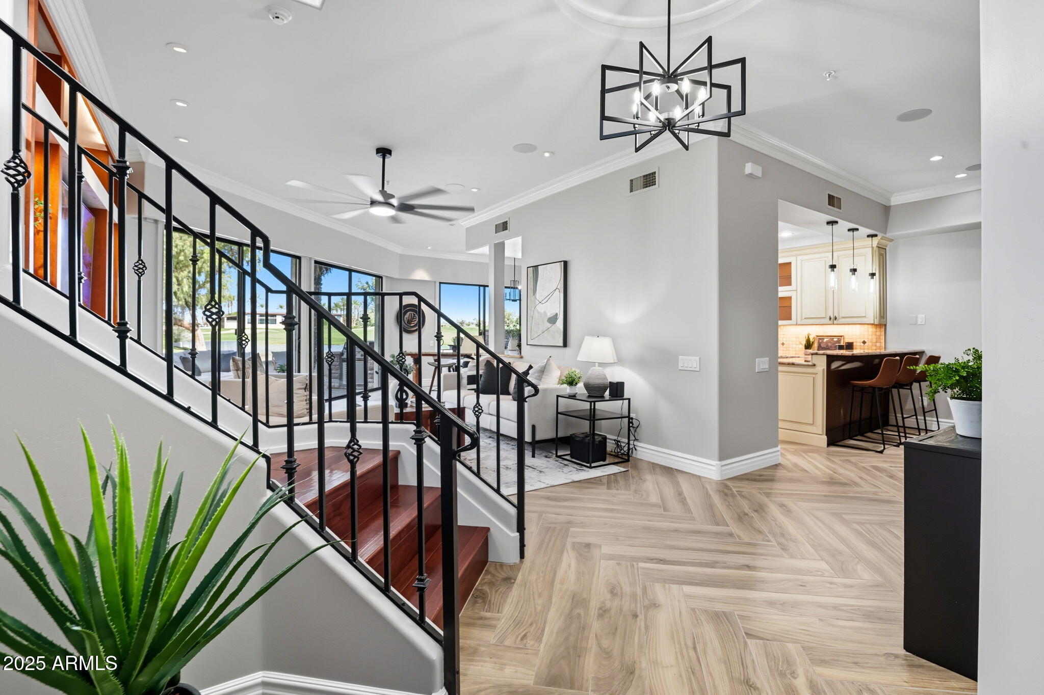 Experience the Gainey Ranch lifestyle in this remodeled & expanded 3 bed, 3 bath home showcasing breathtaking views of the golf course, lake, mountains & clubhouse. The spacious great room opens to a wraparound patio with BBQ & stone fireplace, ideal for entertaining. The gourmet kitchen features granite counters, a large island, custom cabinetry, two breakfast bars & top-of-the-line appliances, plus a custom bar with 200-bottle wine fridge. Upstairs, the primary suite offers a private balcony, sitting area, walk-in closet & spa bath with jacuzzi tub. Two additional bedrooms and a flexible exercise or bonus room complete the layout. Enjoy resort-style living with pools, spas, walking trails, and world-class dining & shopping nearby--plus the Hyatt Regency just steps away.