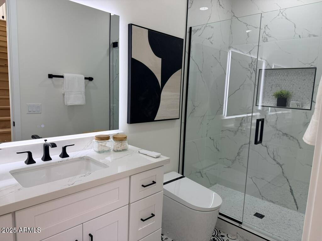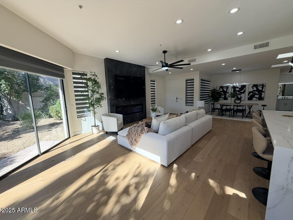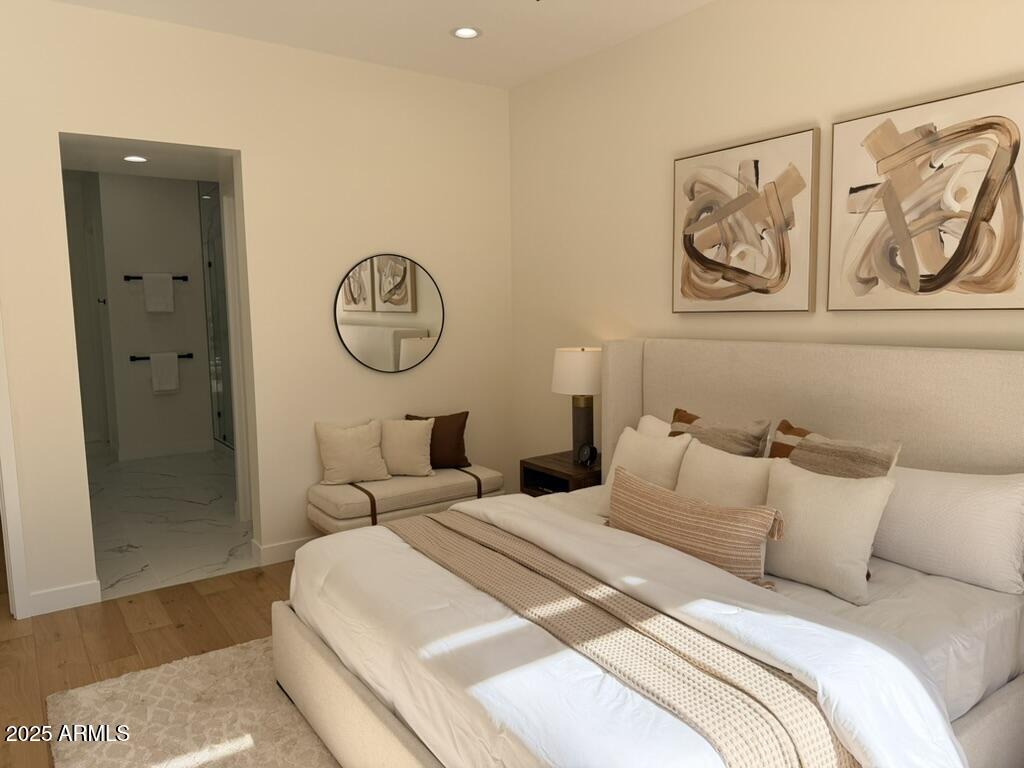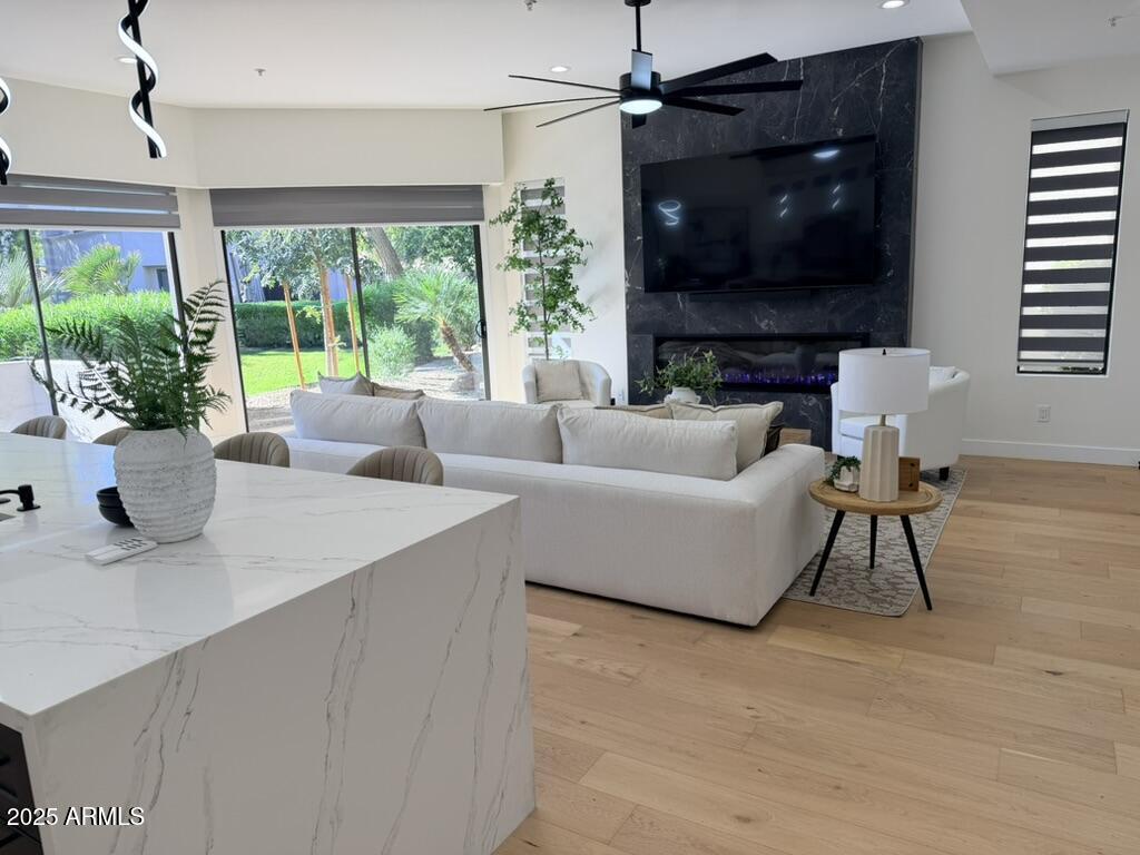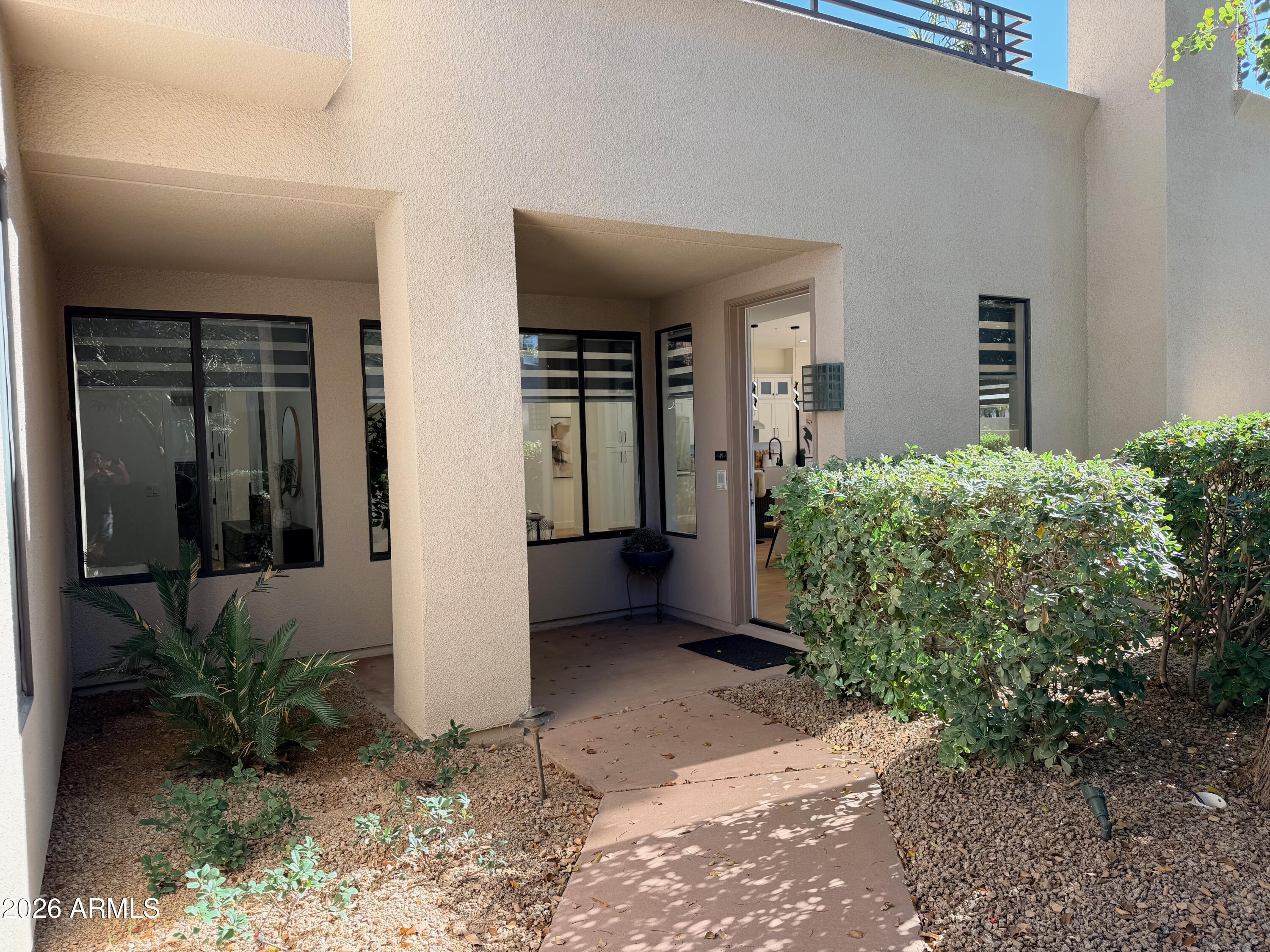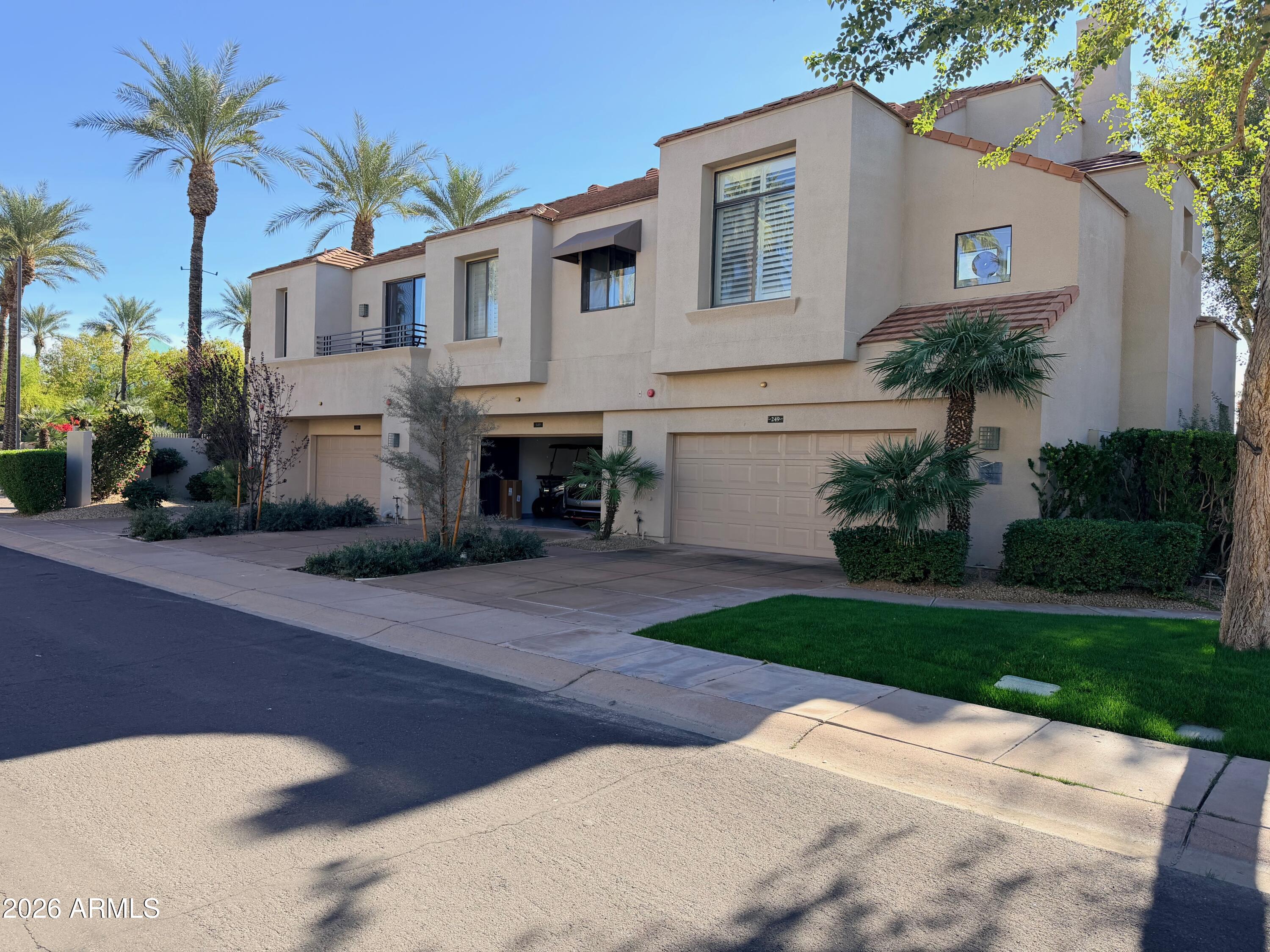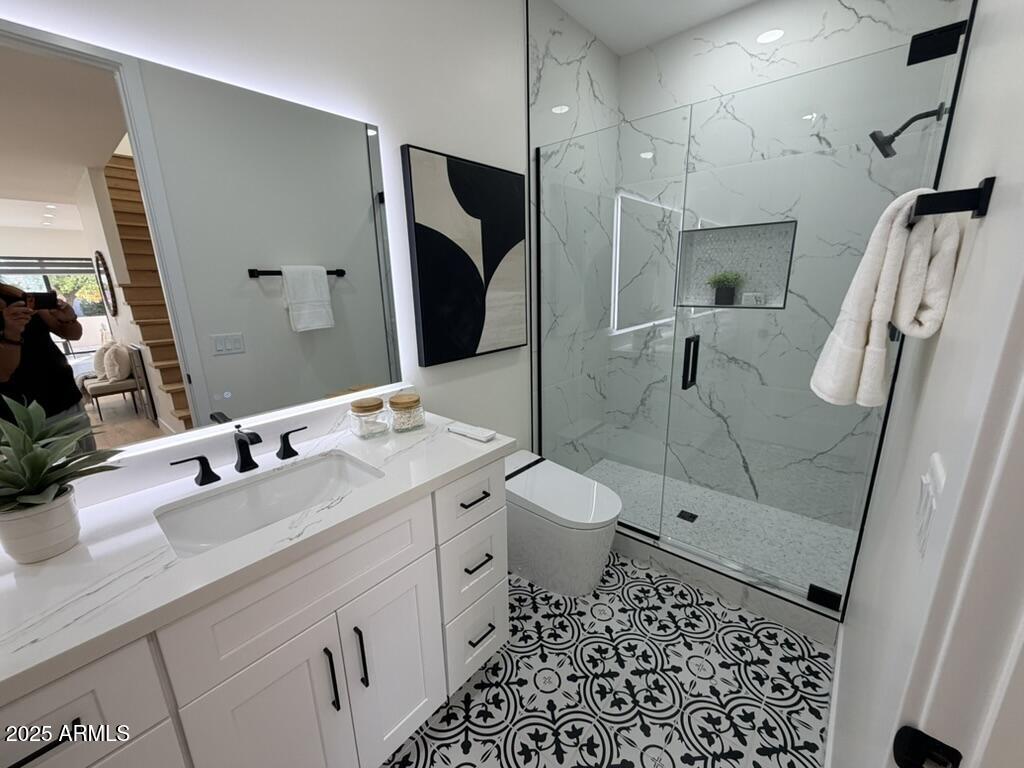 Completely reimagined from the studs up, this sophisticated 3br 3ba residence showcases a full remodel with premium finishes and modern design. The main-level primary suite is spacious with a stunning custom bathroom including a large walk-in shower, an impressive 120'' double vanity, and an electronic bidet. The chef's kitchen is appointed with a waterfall quartz island, custom cabinetry with glass-front uppers, and RGB in and under-cabinet lighting. Professional-grade appliances elevate the cooking experience. Imported Italian porcelain beautifully frames the electric fireplace and the included 85'' OLED television. German-engineered hardwood throughout the home, brings warmth to the contemporary design. Outdoor living is exceptional with an oversized patio ideal for dining and.. relaxation, surrounded by lush, manicured landscaping. The downstairs guest suite comfortably accommodates a queen-size bed, while the upstairs ensuite offers its own private balconyperfect for enjoying Arizona's breathtaking sunsets. This upper suite includes a walk-in closet and ample space for a king-size bed.