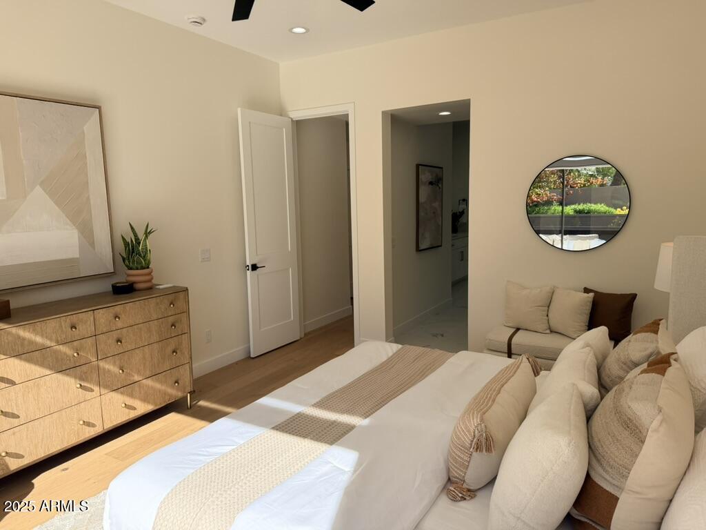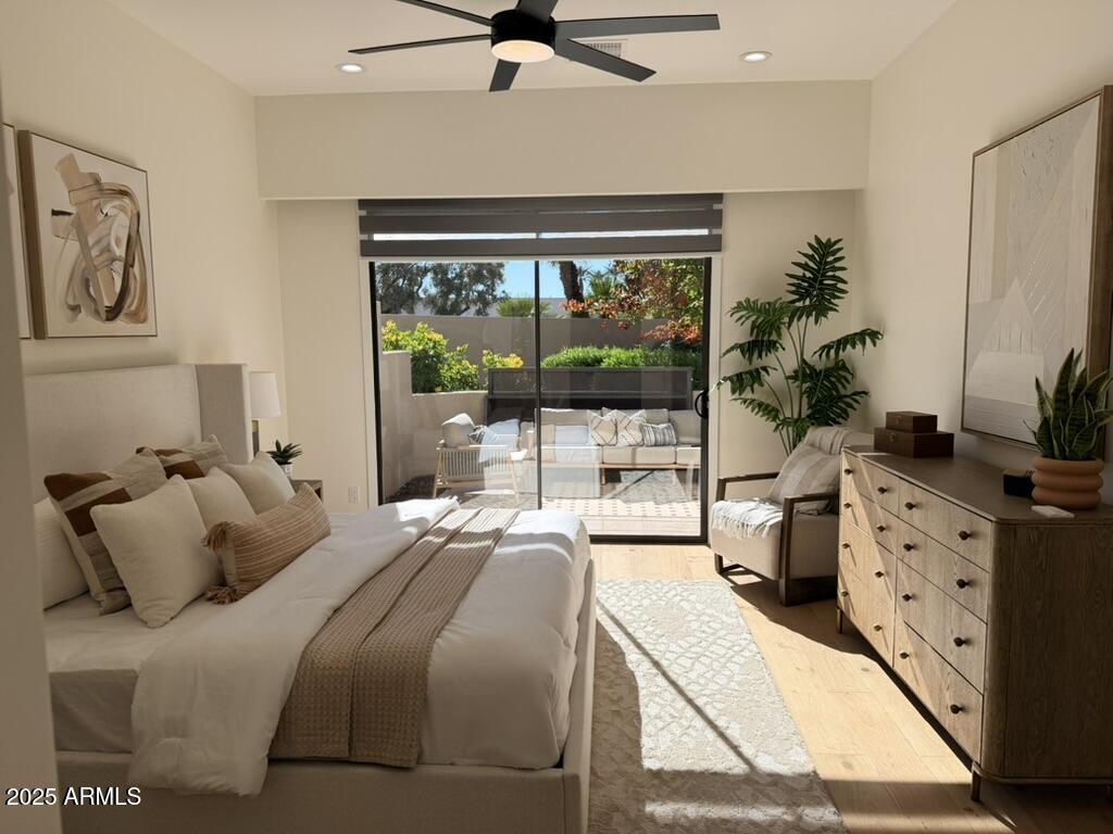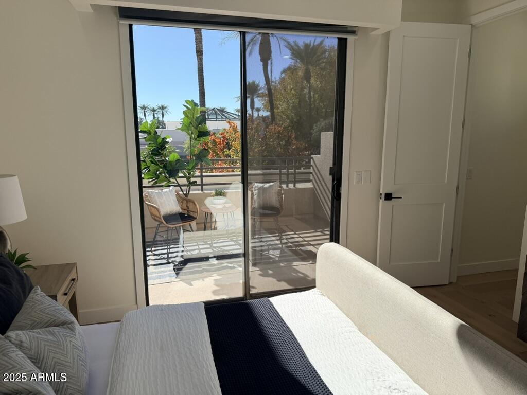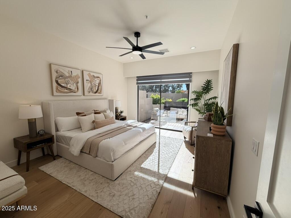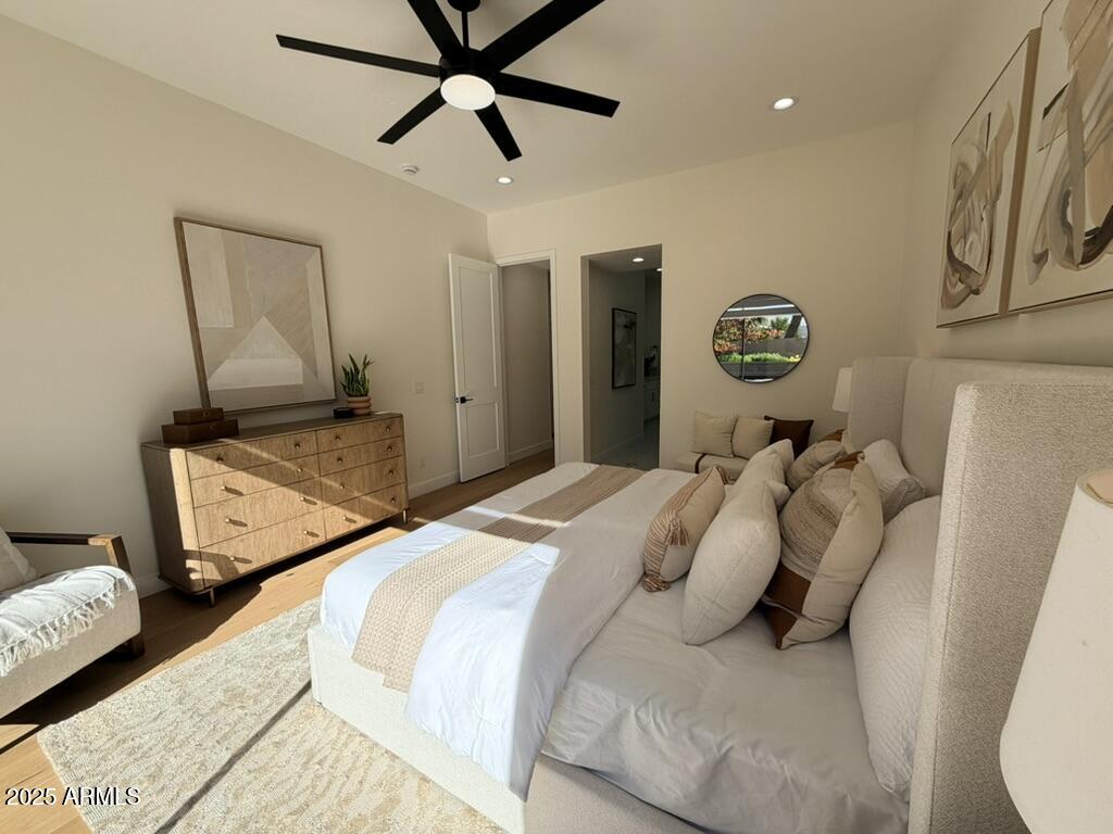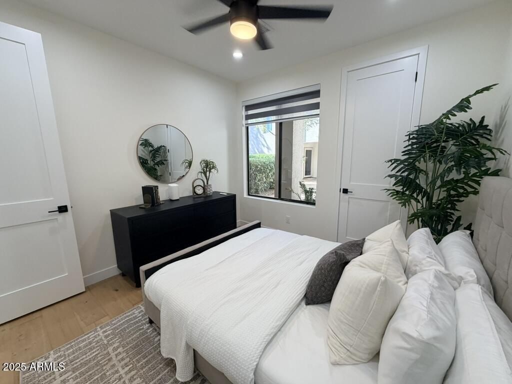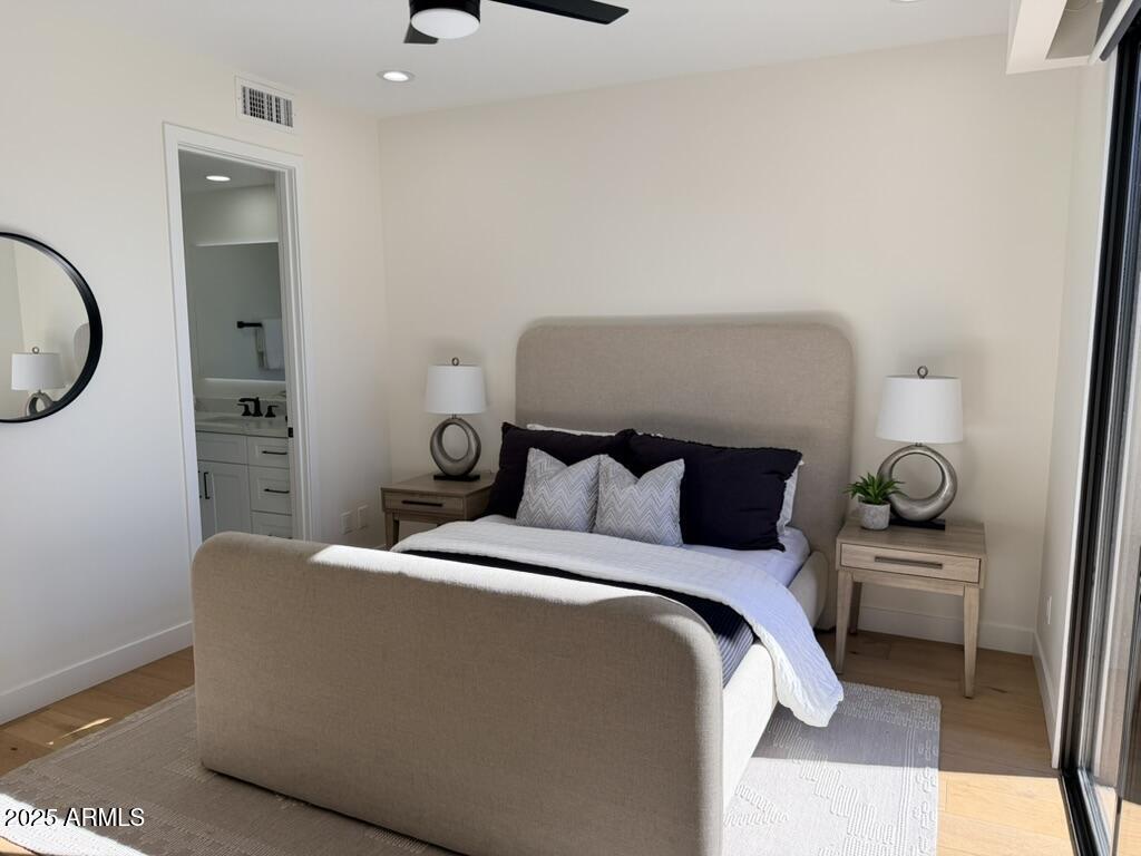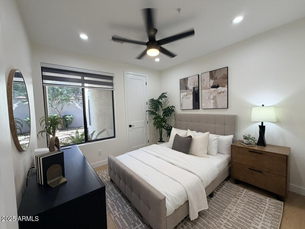 Completely reimagined from the studs up, this sophisticated 3br 3ba residence showcases a full remodel with premium finishes and modern design. The main-level primary suite is spacious with a stunning custom bathroom including a large walk-in shower, an impressive 120'' double vanity, and an electronic bidet. The chef's kitchen is appointed with a waterfall quartz island, custom cabinetry with glass-front uppers, and RGB in and under-cabinet lighting. Professional-grade appliances elevate the cooking experience. Imported Italian porcelain beautifully frames the electric fireplace and the included 85'' OLED television. German-engineered hardwood throughout the home, brings warmth to the contemporary design. Outdoor living is exceptional with an oversized patio ideal for dining and.. relaxation, surrounded by lush, manicured landscaping. The downstairs guest suite comfortably accommodates a queen-size bed, while the upstairs ensuite offers its own private balconyperfect for enjoying Arizona's breathtaking sunsets. This upper suite includes a walk-in closet and ample space for a king-size bed.