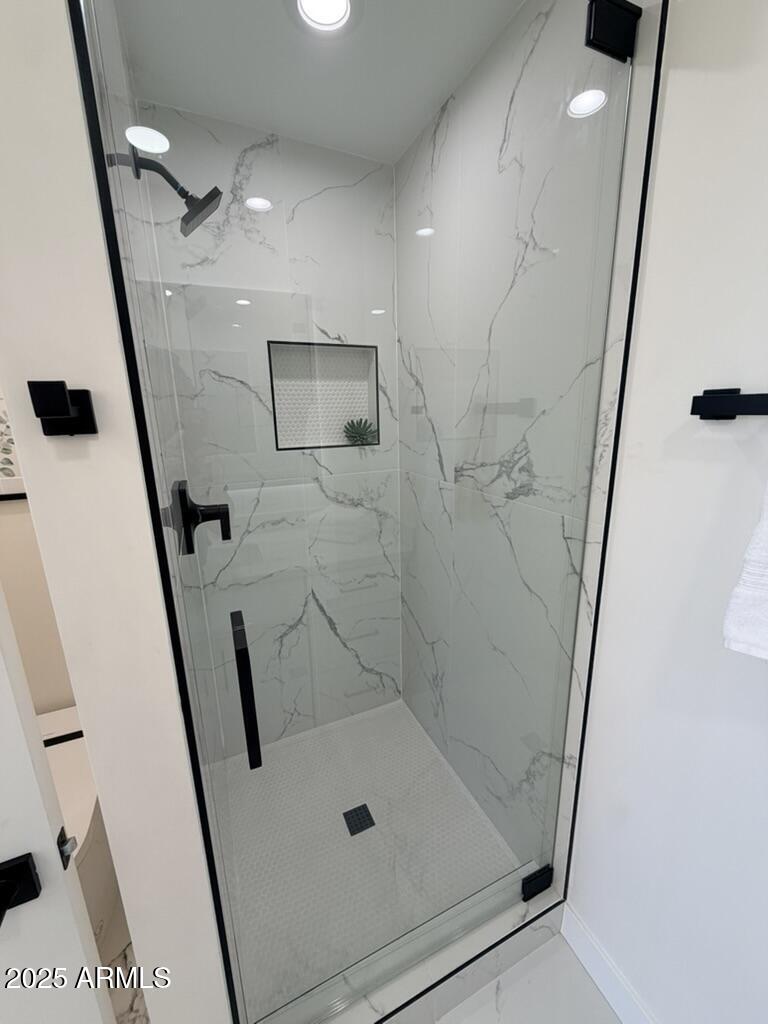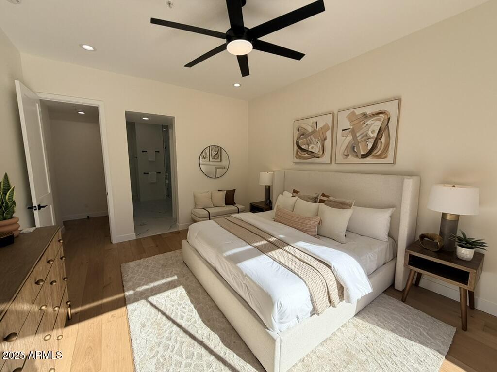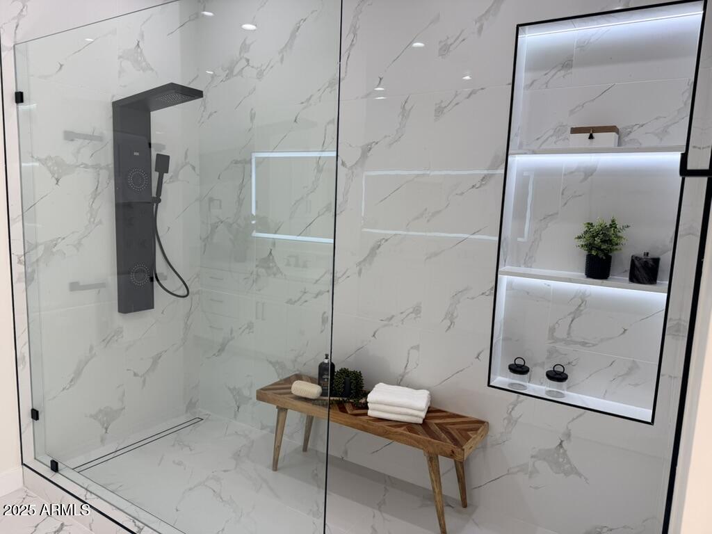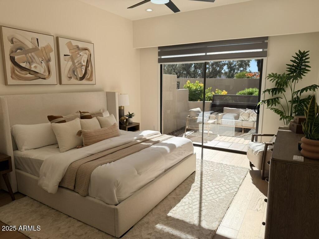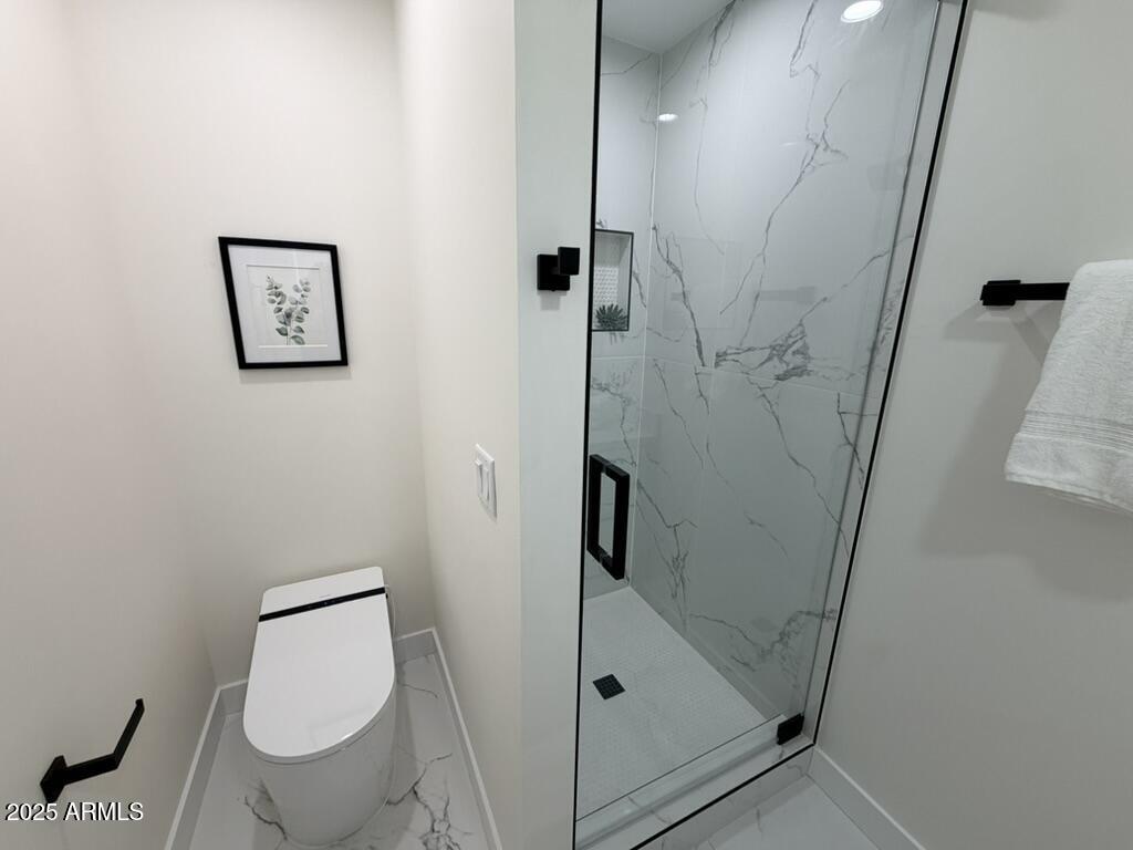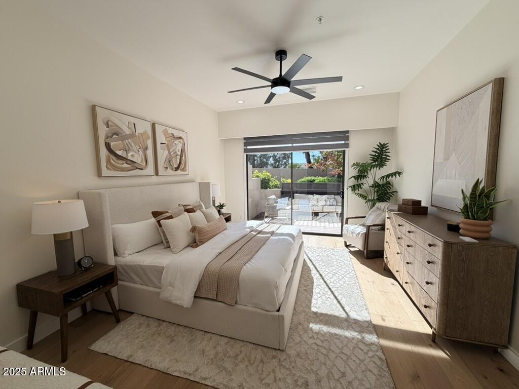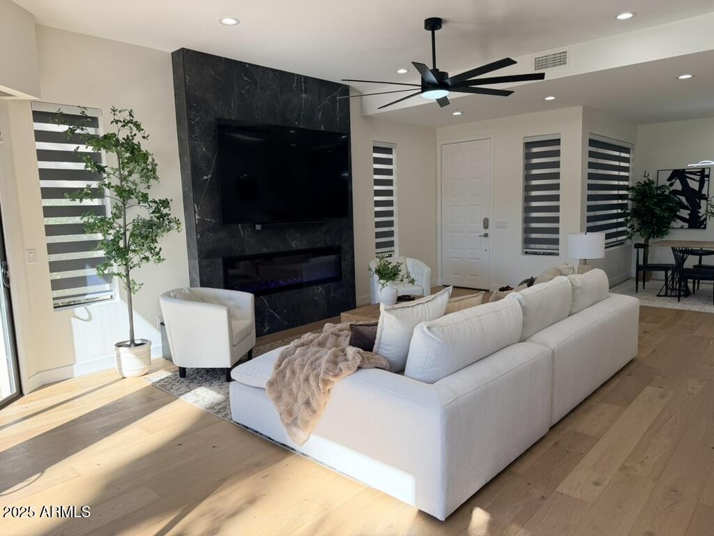 Completely reimagined from the studs up, this sophisticated 3br 3ba residence showcases a full remodel with premium finishes and modern design. The main-level primary suite is spacious with a stunning custom bathroom including a large walk-in shower, an impressive 120'' double vanity, and an electronic bidet. The chef's kitchen is appointed with a waterfall quartz island, custom cabinetry with glass-front uppers, and RGB in and under-cabinet lighting. Professional-grade appliances elevate the cooking experience. Imported Italian porcelain beautifully frames the electric fireplace and the included 85'' OLED television. German-engineered hardwood throughout the home, brings warmth to the contemporary design. Outdoor living is exceptional with an oversized patio ideal for dining and.. relaxation, surrounded by lush, manicured landscaping. The downstairs guest suite comfortably accommodates a queen-size bed, while the upstairs ensuite offers its own private balconyperfect for enjoying Arizona's breathtaking sunsets. This upper suite includes a walk-in closet and ample space for a king-size bed.