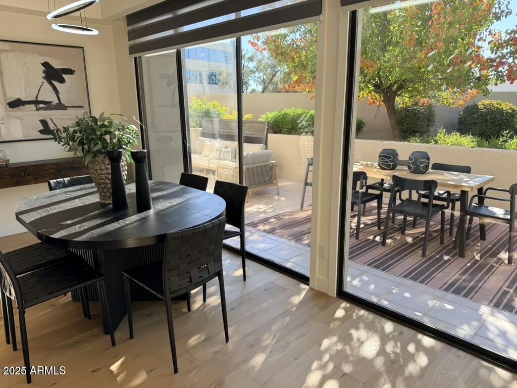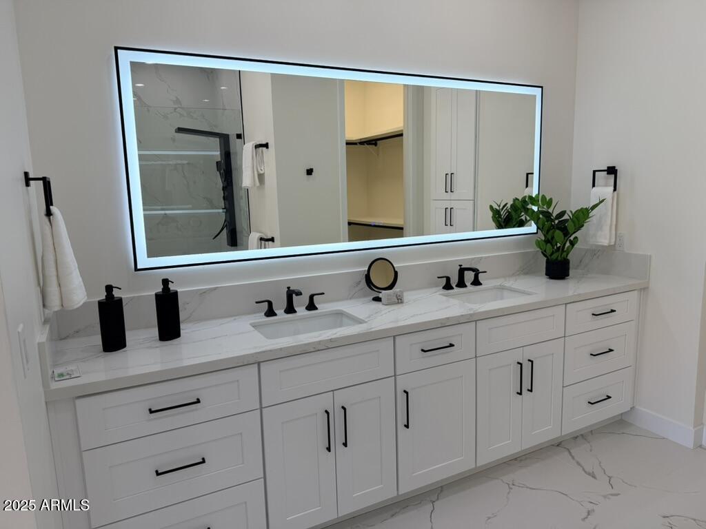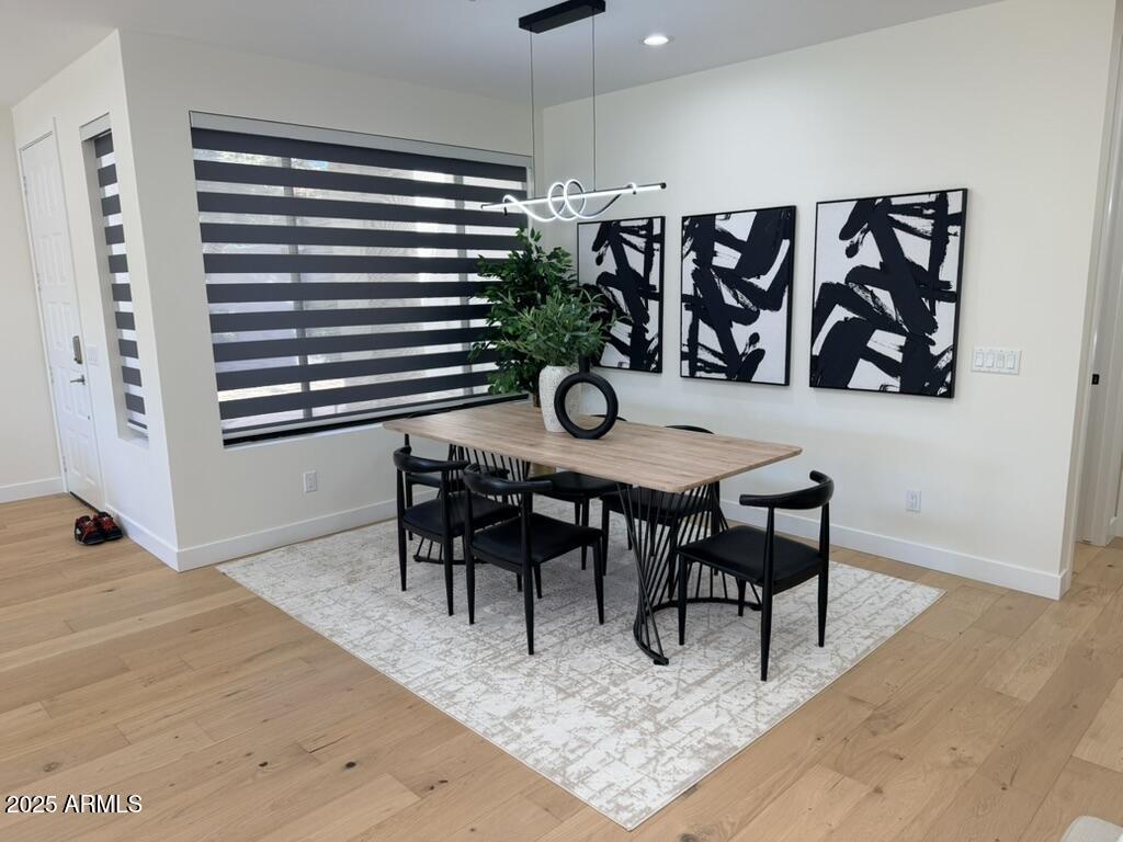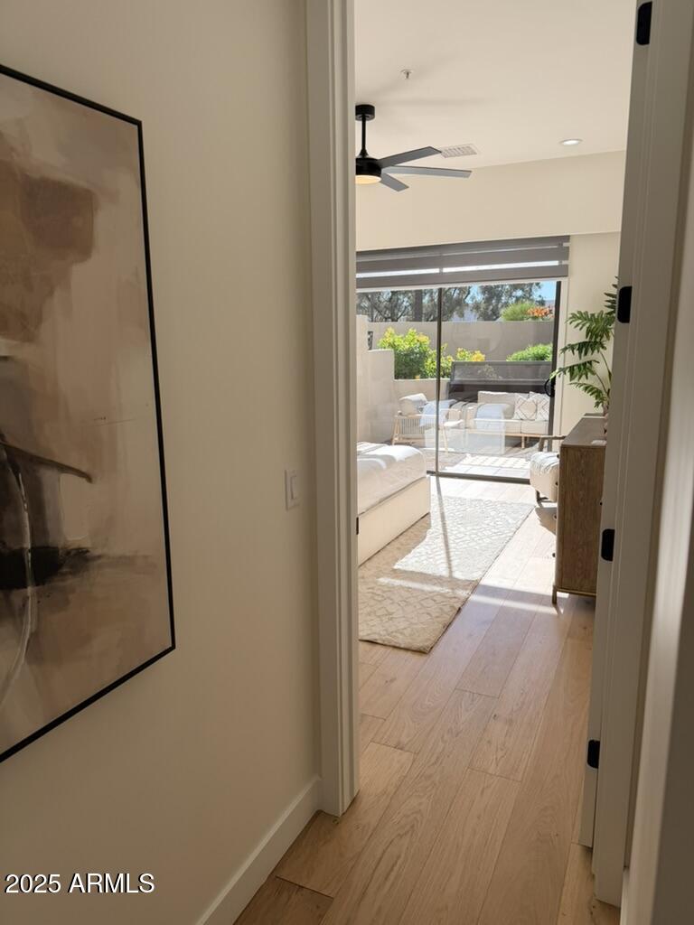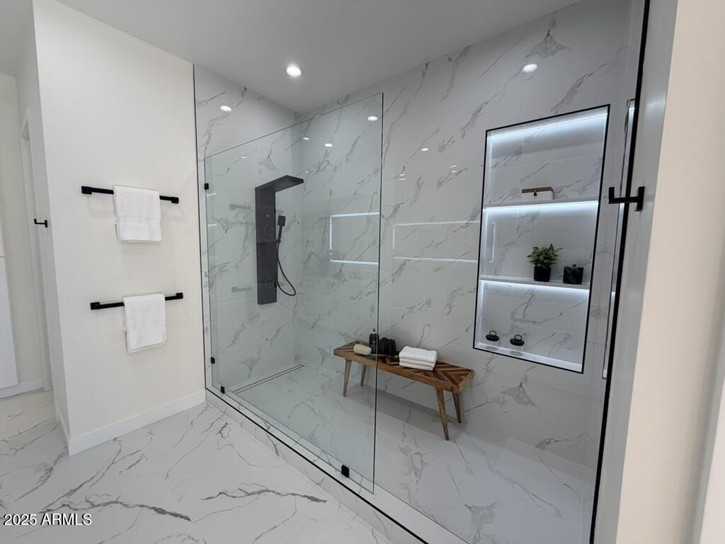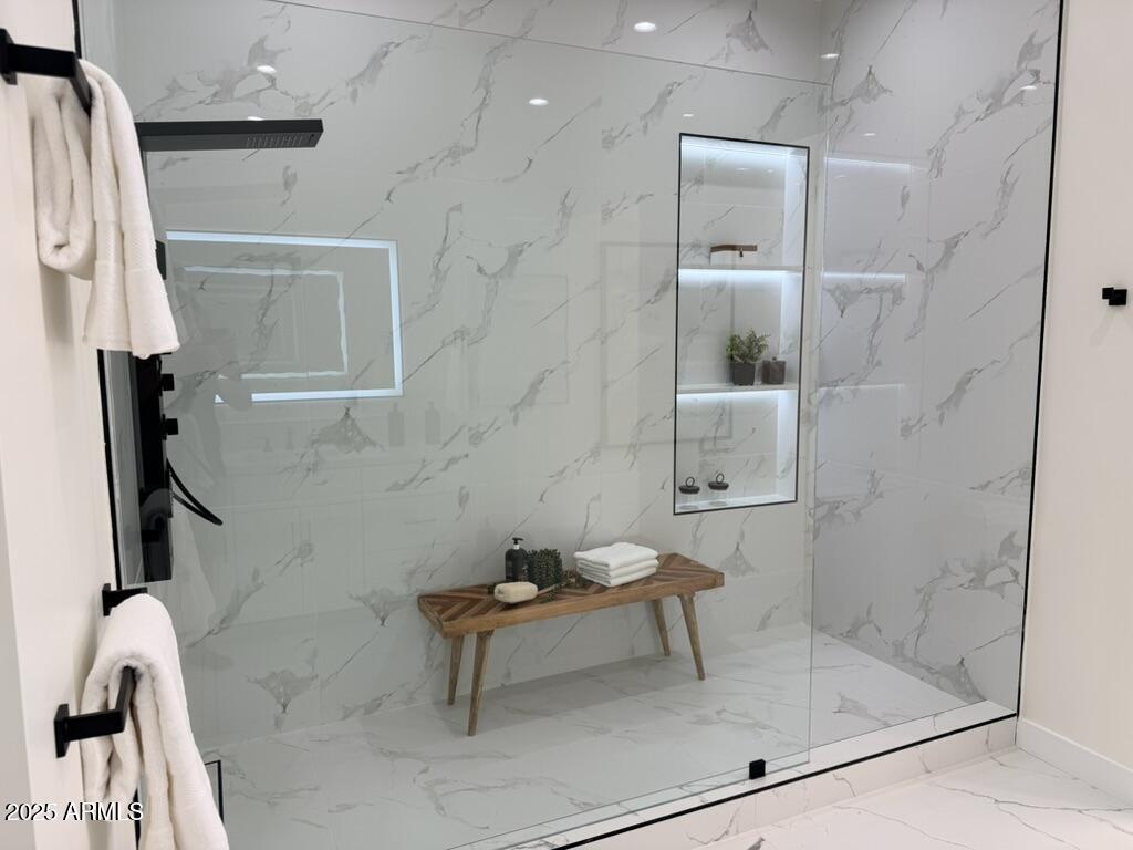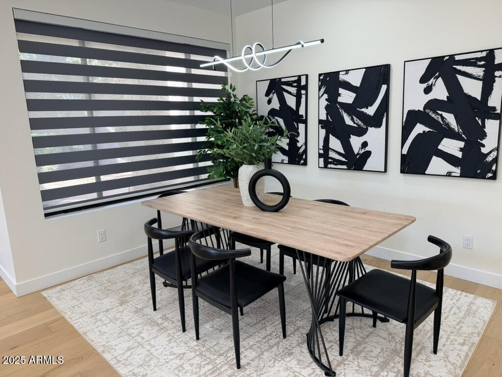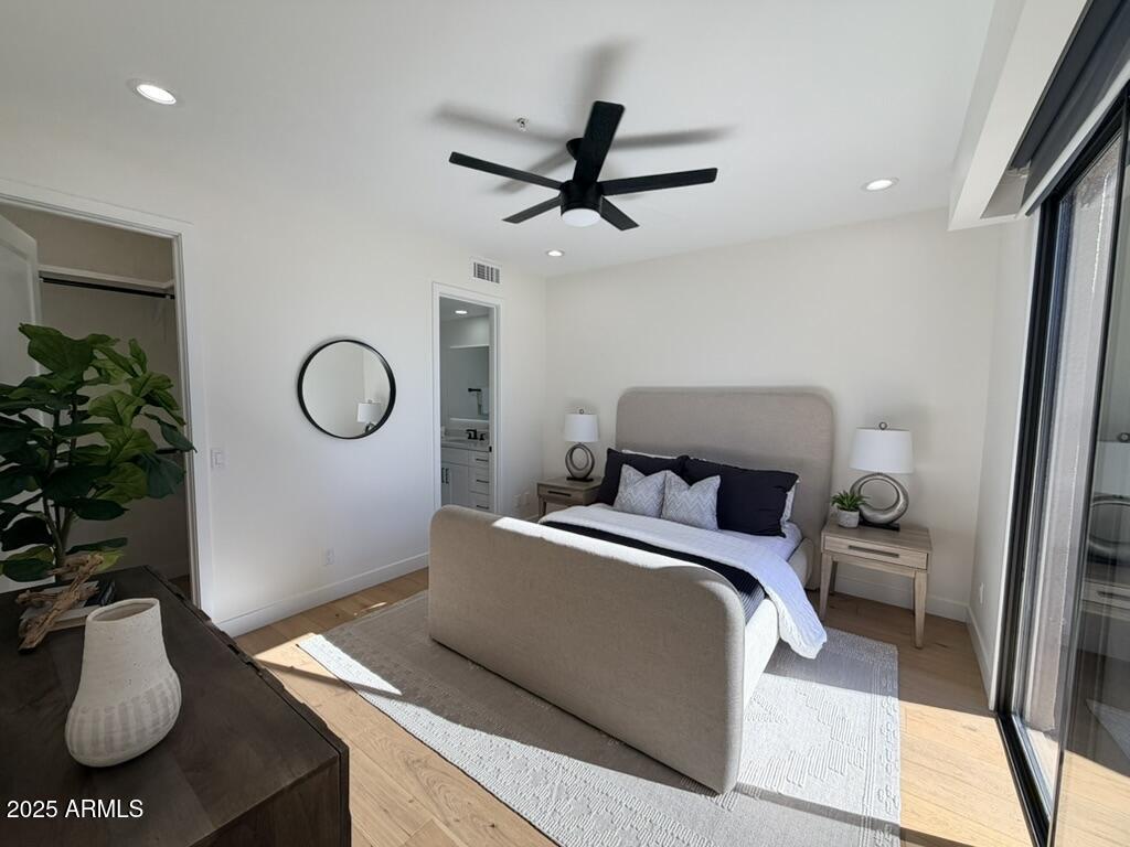 Completely reimagined from the studs up, this sophisticated 3br 3ba residence showcases a full remodel with premium finishes and modern design. The main-level primary suite is spacious with a stunning custom bathroom including a large walk-in shower, an impressive 120'' double vanity, and an electronic bidet. The chef's kitchen is appointed with a waterfall quartz island, custom cabinetry with glass-front uppers, and RGB in and under-cabinet lighting. Professional-grade appliances elevate the cooking experience. Imported Italian porcelain beautifully frames the electric fireplace and the included 85'' OLED television. German-engineered hardwood throughout the home, brings warmth to the contemporary design. Outdoor living is exceptional with an oversized patio ideal for dining and.. relaxation, surrounded by lush, manicured landscaping. The downstairs guest suite comfortably accommodates a queen-size bed, while the upstairs ensuite offers its own private balconyperfect for enjoying Arizona's breathtaking sunsets. This upper suite includes a walk-in closet and ample space for a king-size bed.