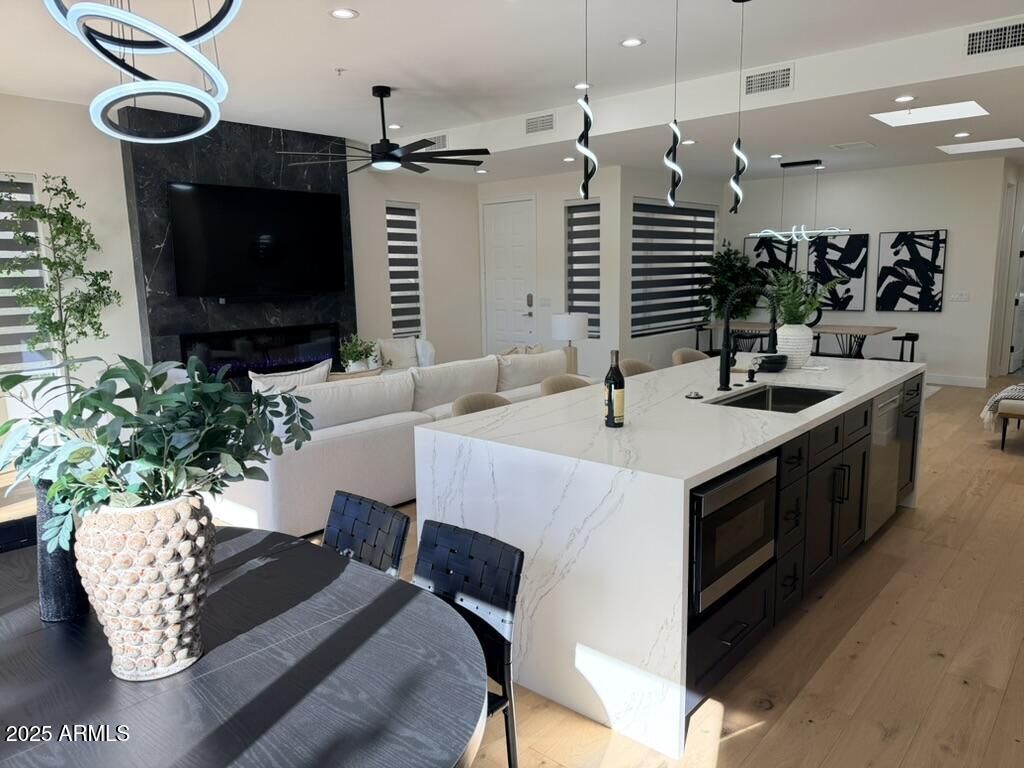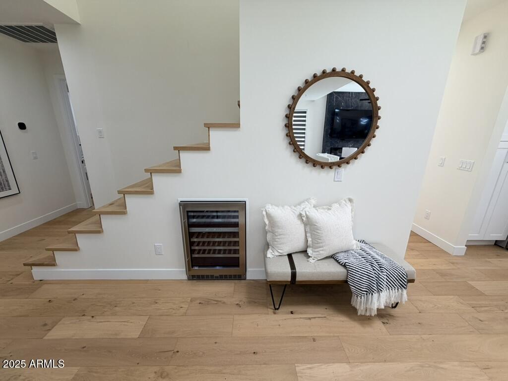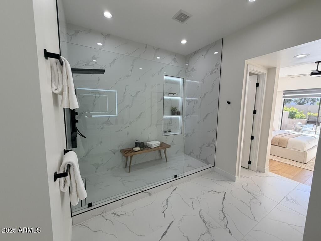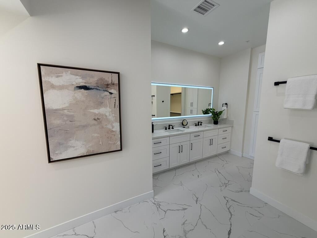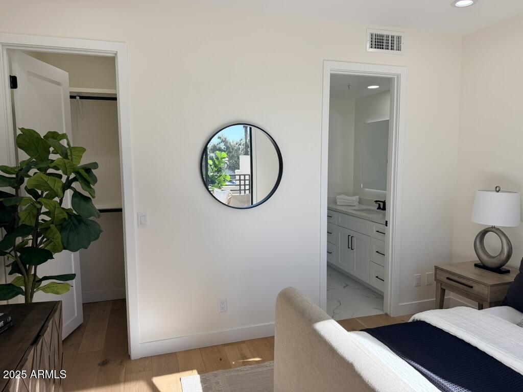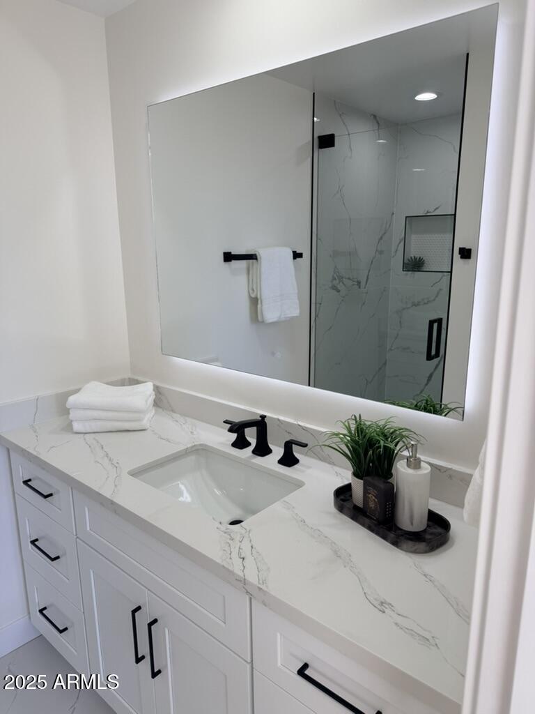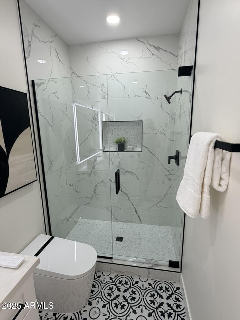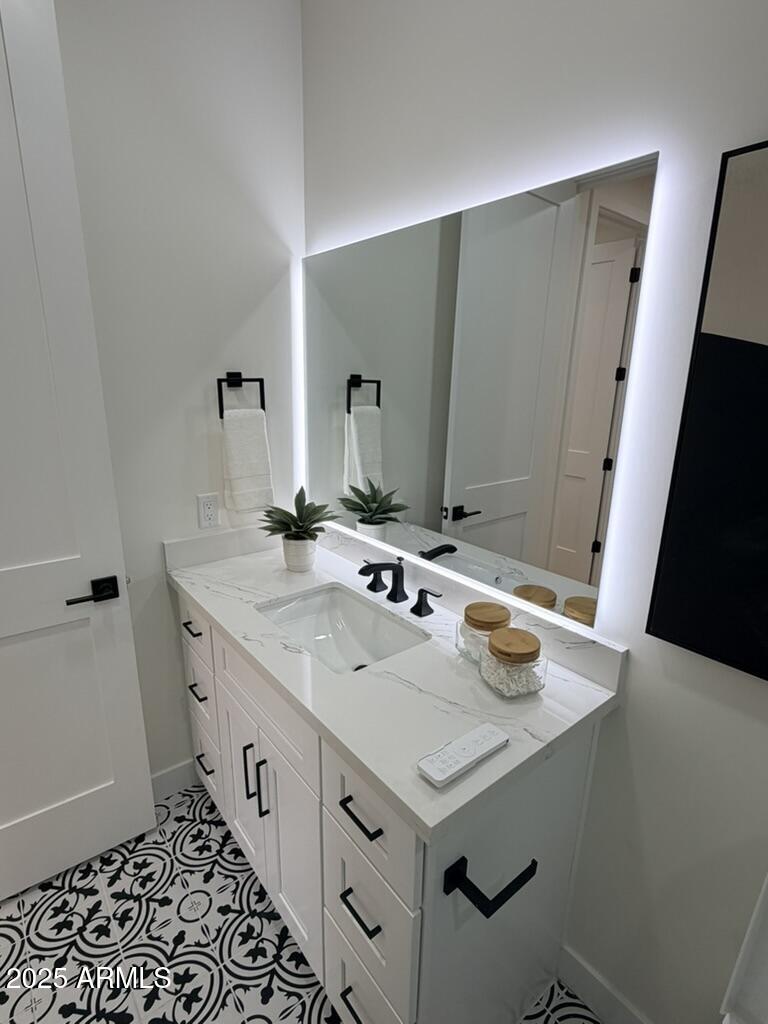 Completely reimagined from the studs up, this sophisticated 3br 3ba residence showcases a full remodel with premium finishes and modern design. The main-level primary suite is spacious with a stunning custom bathroom including a large walk-in shower, an impressive 120'' double vanity, and an electronic bidet. The chef's kitchen is appointed with a waterfall quartz island, custom cabinetry with glass-front uppers, and RGB in and under-cabinet lighting. Professional-grade appliances elevate the cooking experience. Imported Italian porcelain beautifully frames the electric fireplace and the included 85'' OLED television. German-engineered hardwood throughout the home, brings warmth to the contemporary design. Outdoor living is exceptional with an oversized patio ideal for dining and.. relaxation, surrounded by lush, manicured landscaping. The downstairs guest suite comfortably accommodates a queen-size bed, while the upstairs ensuite offers its own private balconyperfect for enjoying Arizona's breathtaking sunsets. This upper suite includes a walk-in closet and ample space for a king-size bed.