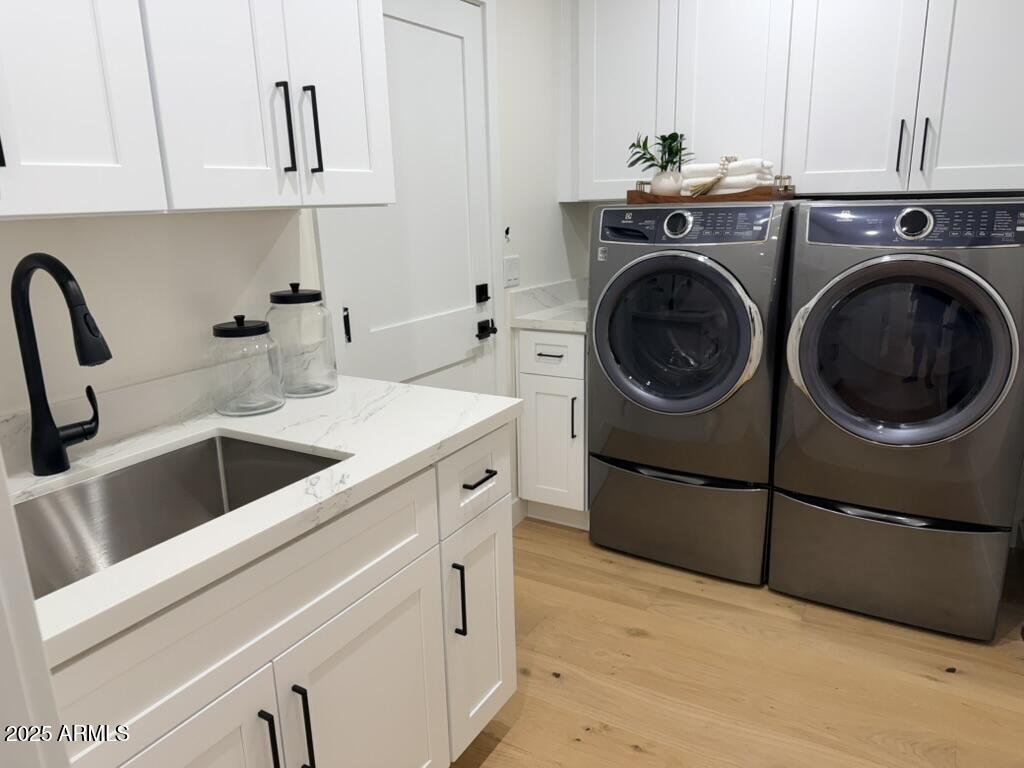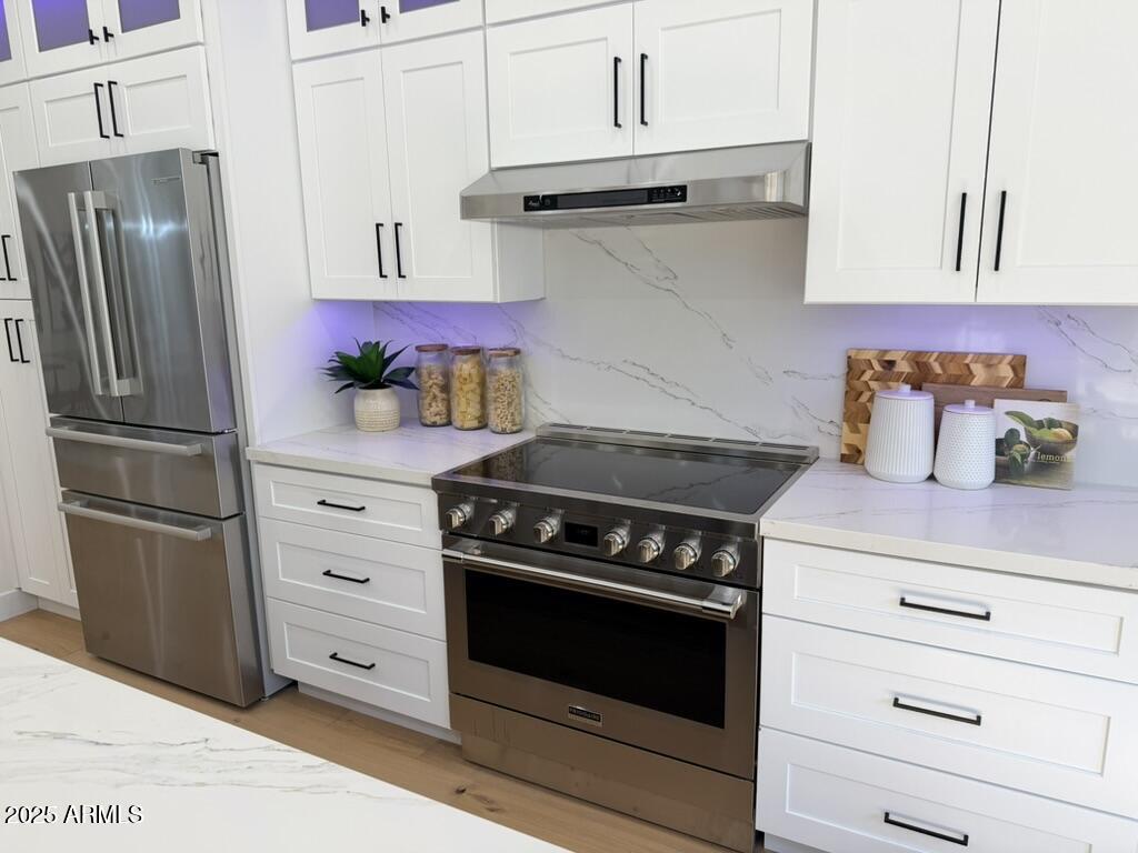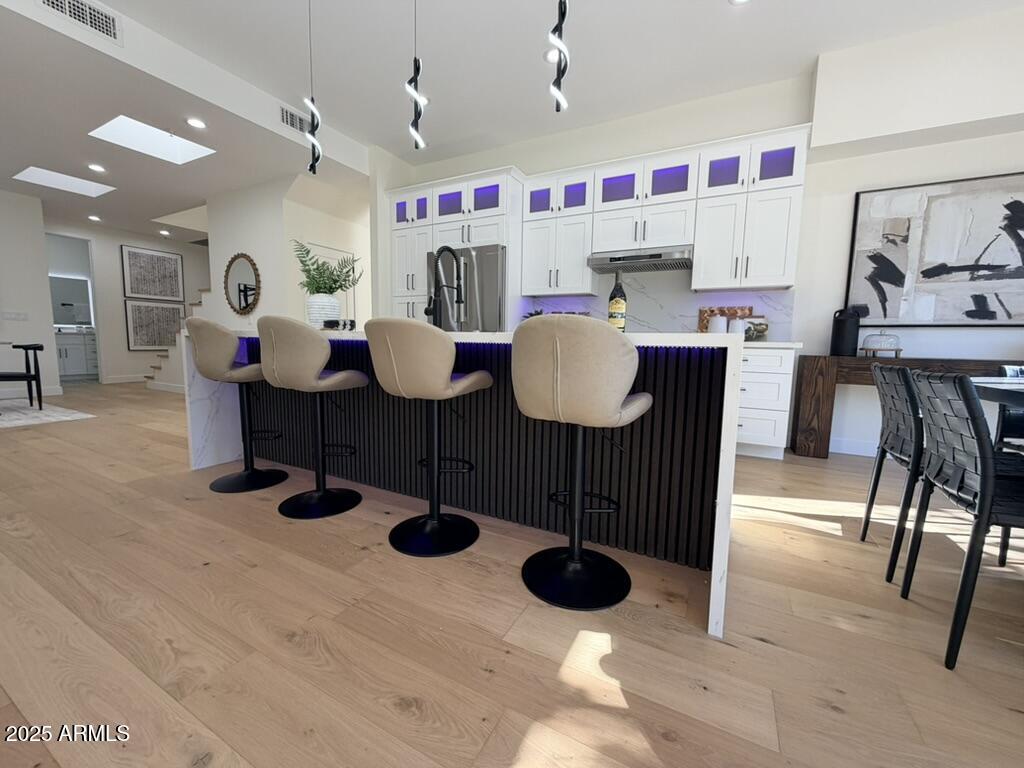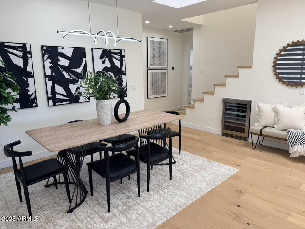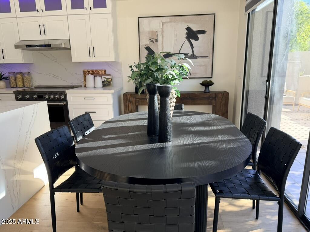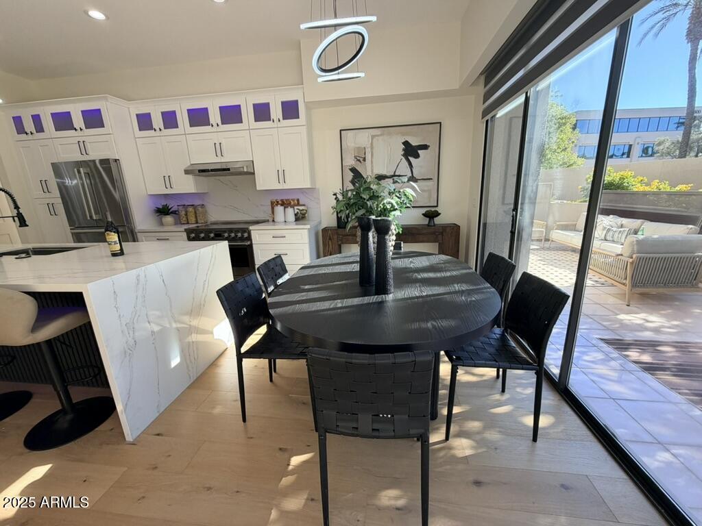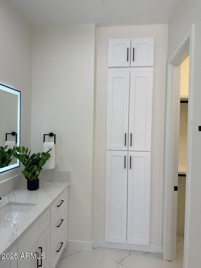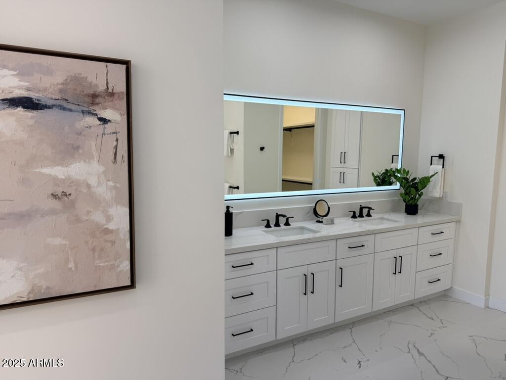 Completely reimagined from the studs up, this sophisticated 3br 3ba residence showcases a full remodel with premium finishes and modern design. The main-level primary suite is spacious with a stunning custom bathroom including a large walk-in shower, an impressive 120'' double vanity, and an electronic bidet. The chef's kitchen is appointed with a waterfall quartz island, custom cabinetry with glass-front uppers, and RGB in and under-cabinet lighting. Professional-grade appliances elevate the cooking experience. Imported Italian porcelain beautifully frames the electric fireplace and the included 85'' OLED television. German-engineered hardwood throughout the home, brings warmth to the contemporary design. Outdoor living is exceptional with an oversized patio ideal for dining and.. relaxation, surrounded by lush, manicured landscaping. The downstairs guest suite comfortably accommodates a queen-size bed, while the upstairs ensuite offers its own private balconyperfect for enjoying Arizona's breathtaking sunsets. This upper suite includes a walk-in closet and ample space for a king-size bed.