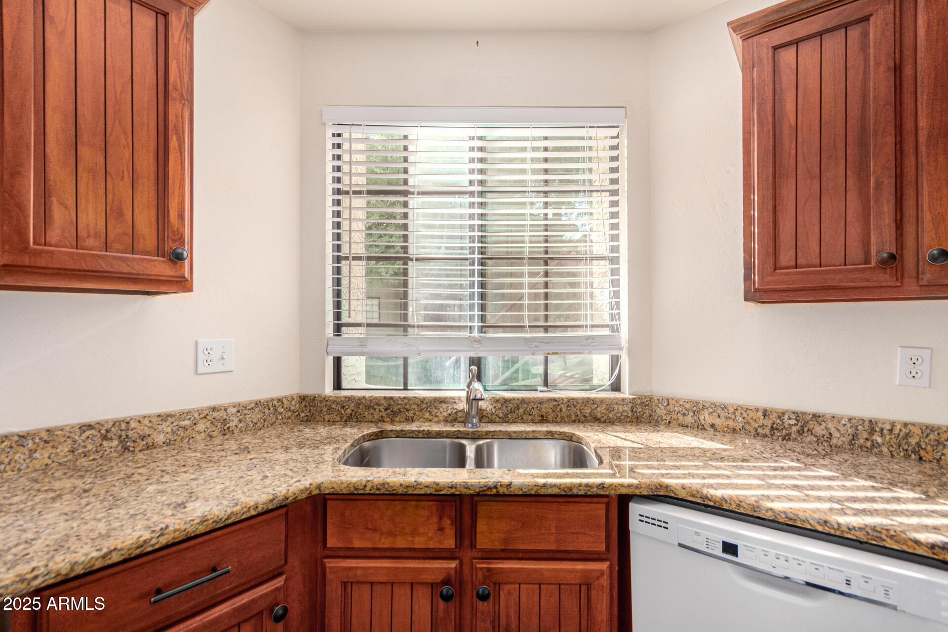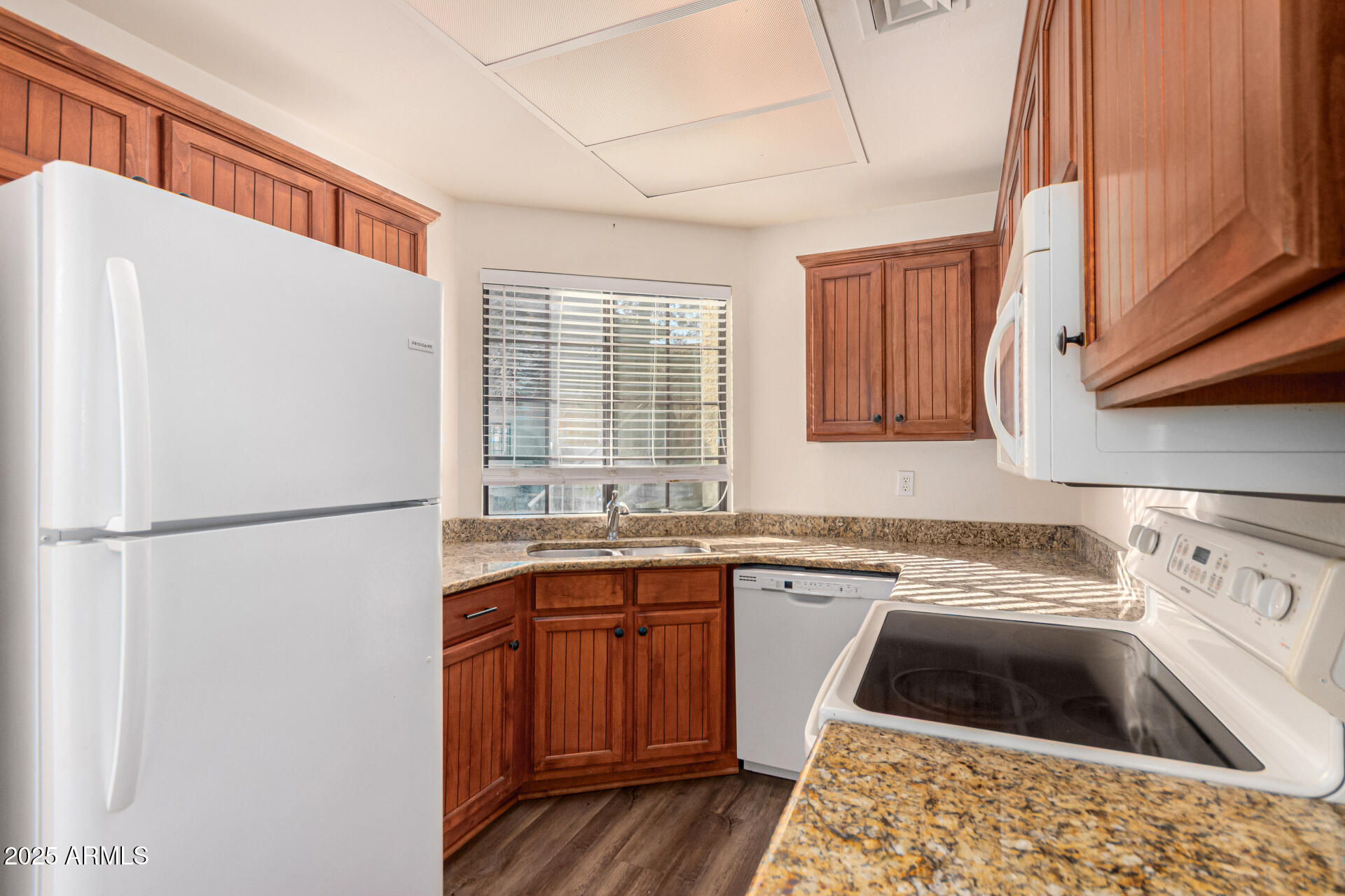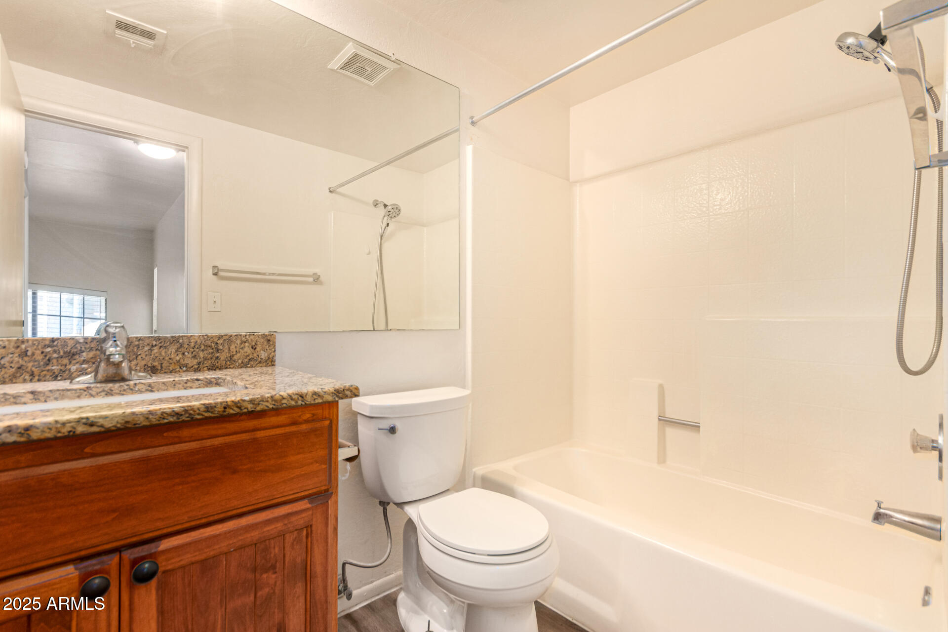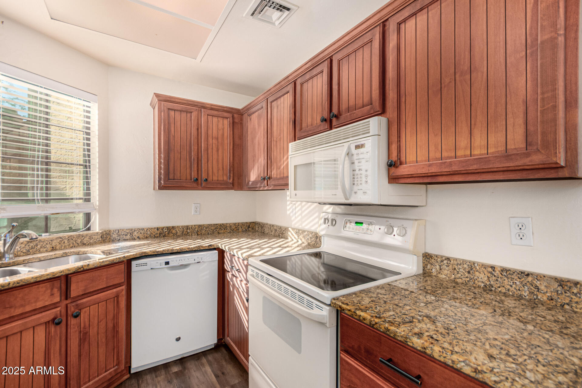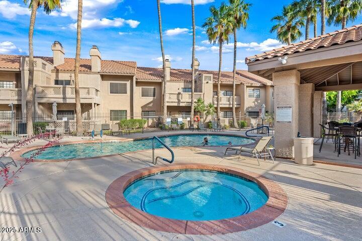 Super Cute Condo in a Great Location!! Walk right out your back patio to a Beautiful Grassy area with a View and Access to one of two pools. Upgrades include Newer Wood Look Planked Grooved Tile, Newer Kitchen & Bathroom Cabinets, Inside Paint in 2022, Newer Appliances, Newer Washer and Dryer that stay, New in 2024 Hot Water Heater, Newer Window Coverings and Lighting Fixtures, Dual Paned Windows, Granite Countertops, and Toilets are newer. There is also a cozy Fireplace for those cooler evenings. It would be remiss not to mention the area .... the hiking and biking trails that border the neighborhood, Cubs Spring Training Baseball Stadium, Restaurants, and Shopping. Great access to Freeways. Let me know how I can help!