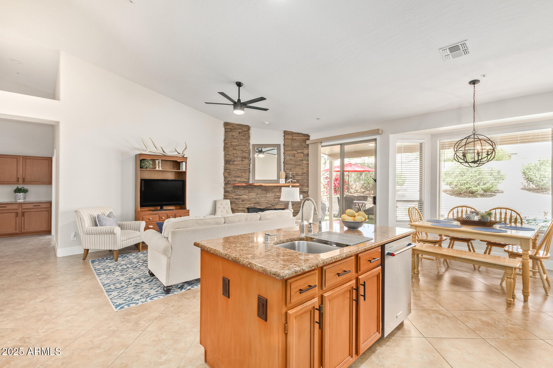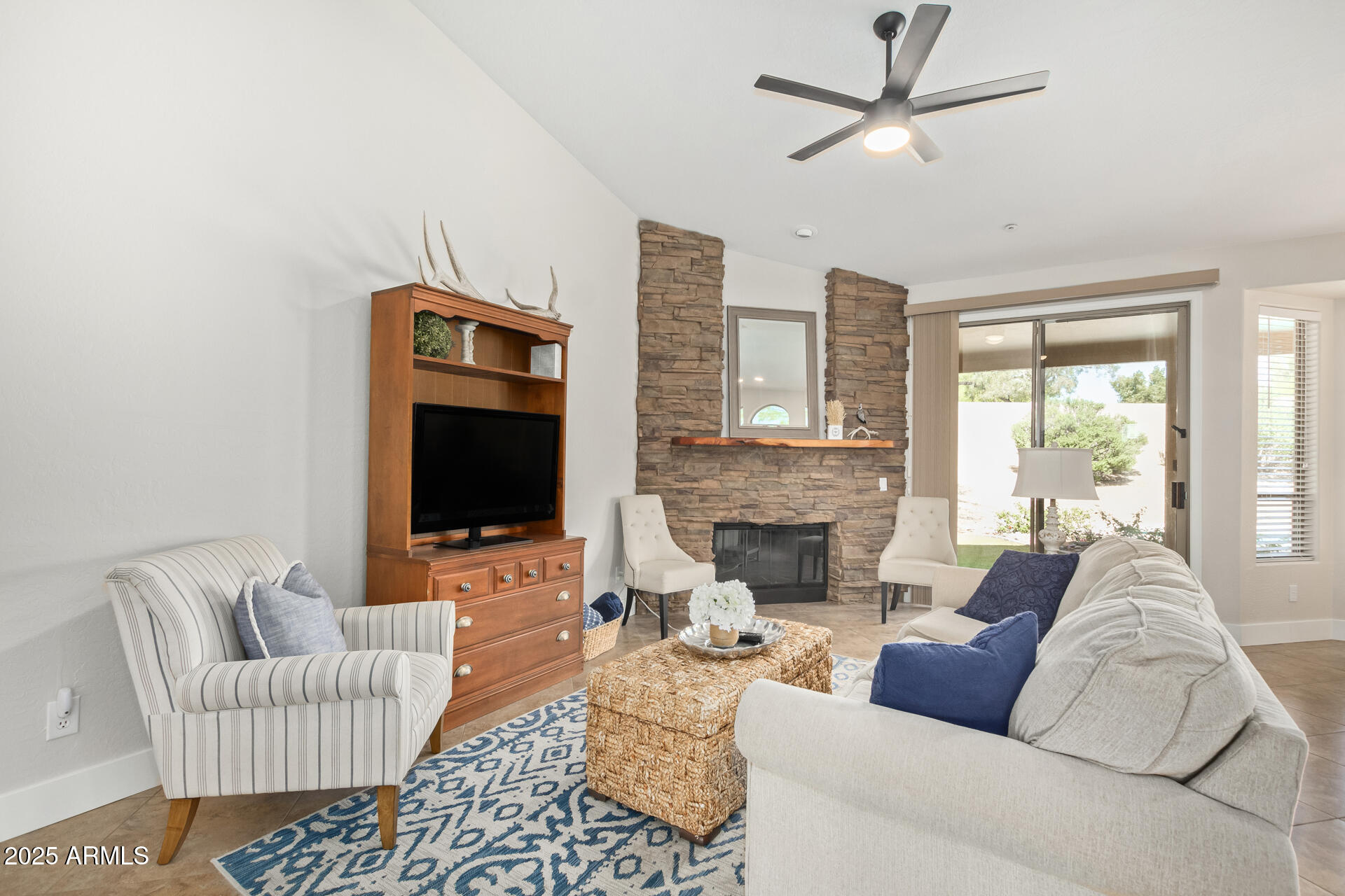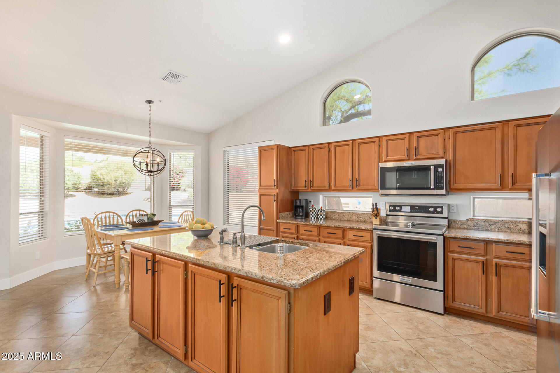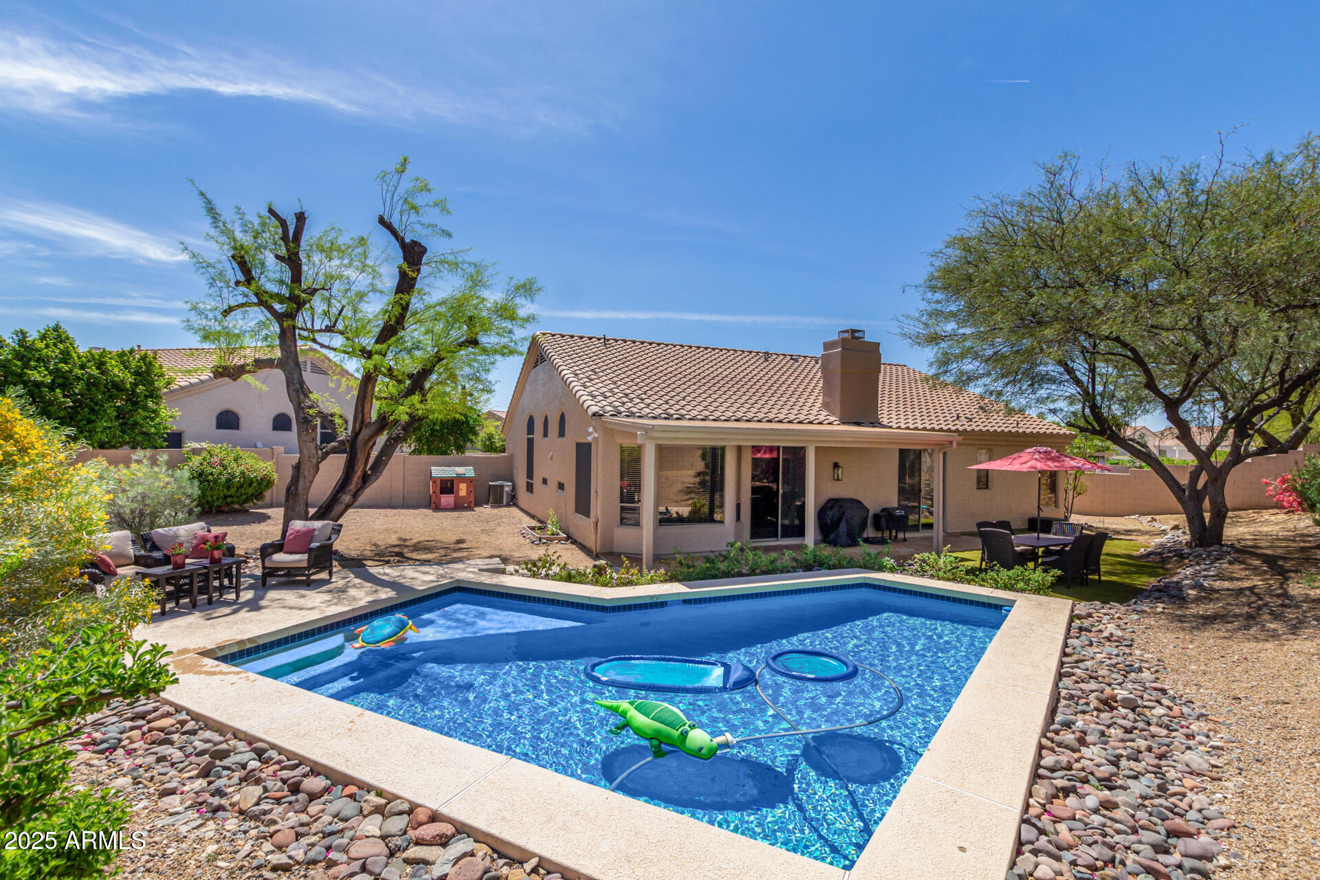 This gorgeous property sits on over a quarter acre featuring a spacious 3-car garage. Explore inside to discover fabulous living & dining areas offering vaulted ceilings, neutral tile floor, & bountiful natural light. Stone fireplace in the family room! The beautiful kitchen boasts wood cabinetry, granite counters, new Kitchen Aid SS appliances, backsplash windows, LED lighting, & a center island. Fiber optics throughout. Double doors open to the main retreat showcasing plush carpet, a private bathroom with granite dual sinks, a walk-in closet, & direct access to the back patio. Enjoy relaxing along with your loved ones in the wonderful backyard including a covered patio, a refreshing blue pool. Pool/Lanscaping included in lease price. Pool fence installed. HOA included in lease price
