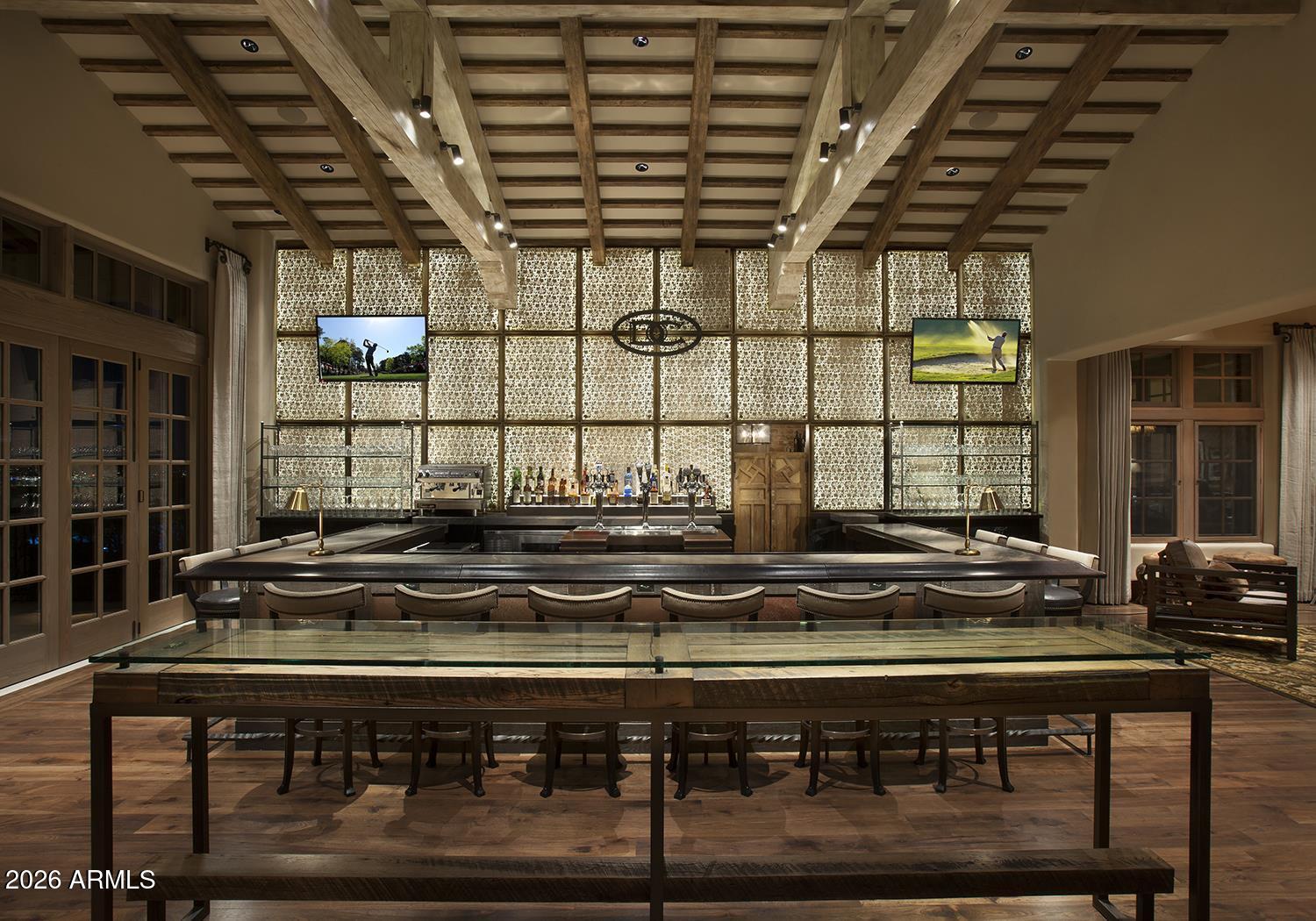 From the moment you enter this one story, open concept floor plan, natural light pours in with the walls of windows framing the stunning mountain vistas from within the home, creating a constant connection to the surrounding desert landscape and a backdrop for living art. Carrying the European white oak flooring throughout creates a natural warmth. The interior is both inviting and functional with a true dining room or flex space for formal living or office, and a spacious chef's kitchen with true 48" cabinetry, walk in pantry, oversized island paired with quartz countertops, complete with a fully matching Monogram, stainless steel appliance package with 5 burner gas gourmet cooking station, double ovens, built in full-size VinoTemp wine fridge and reverse osmosis water purification system.