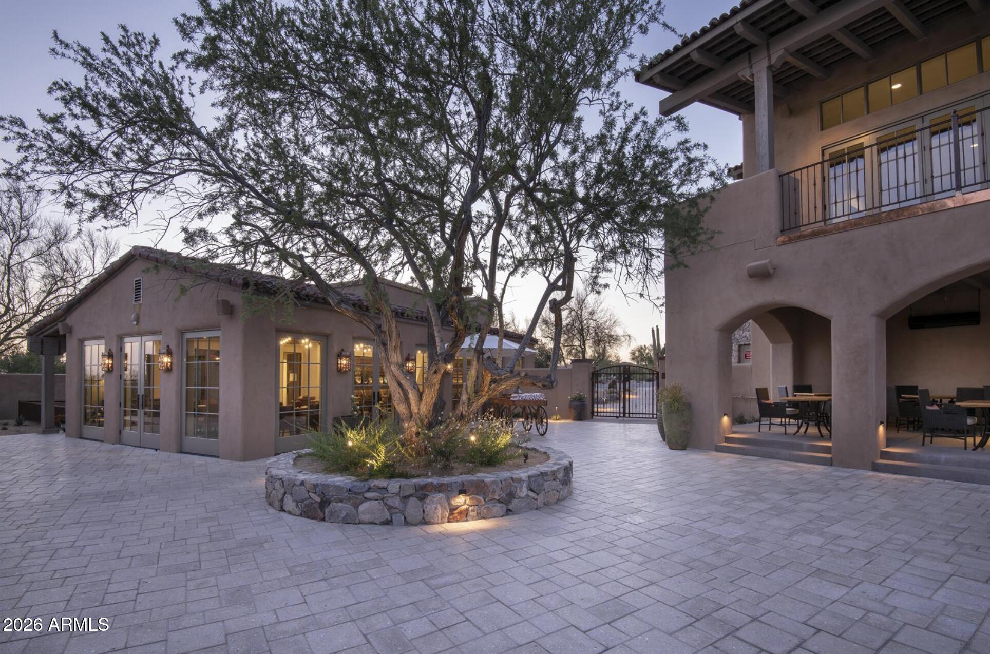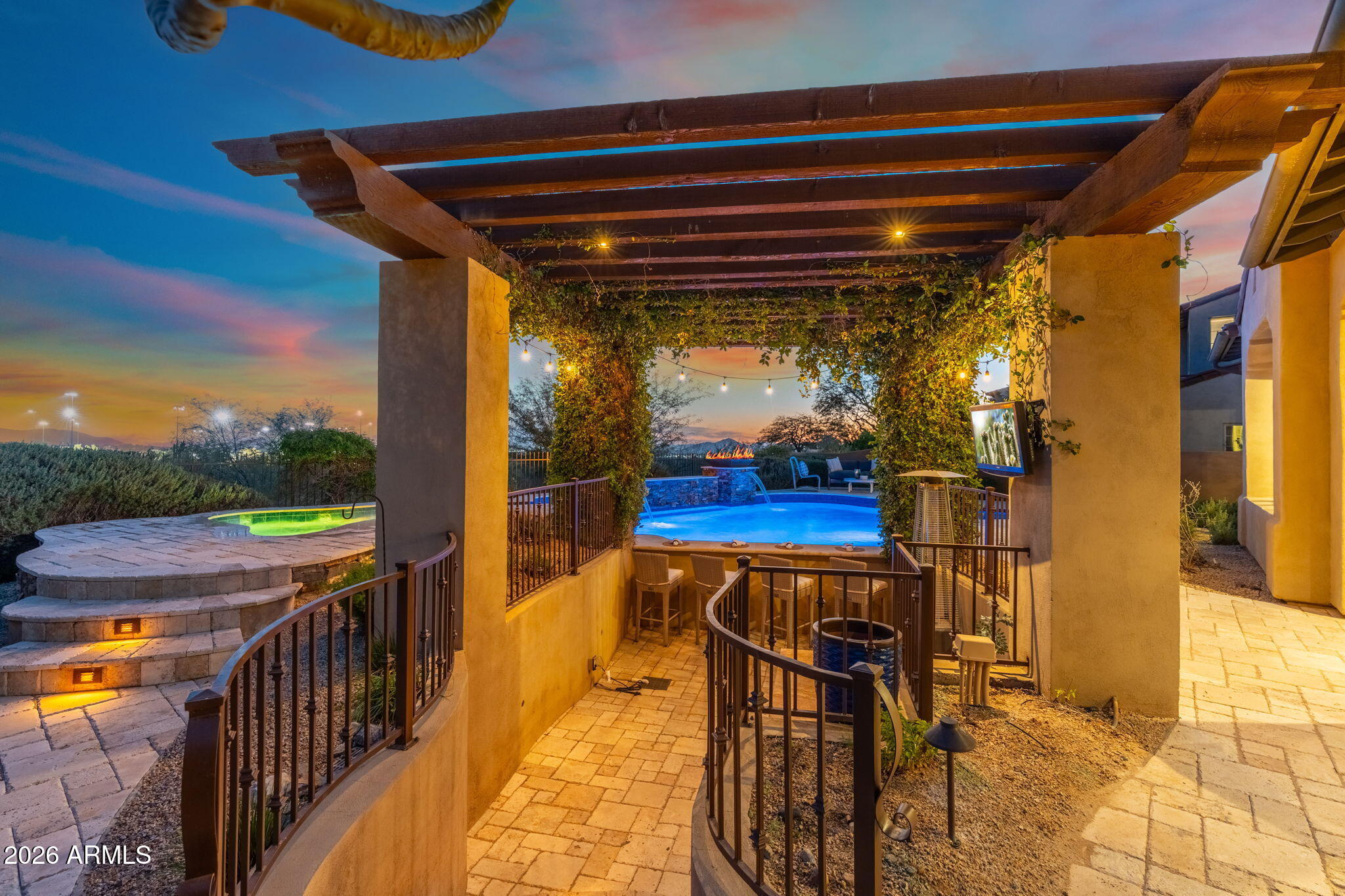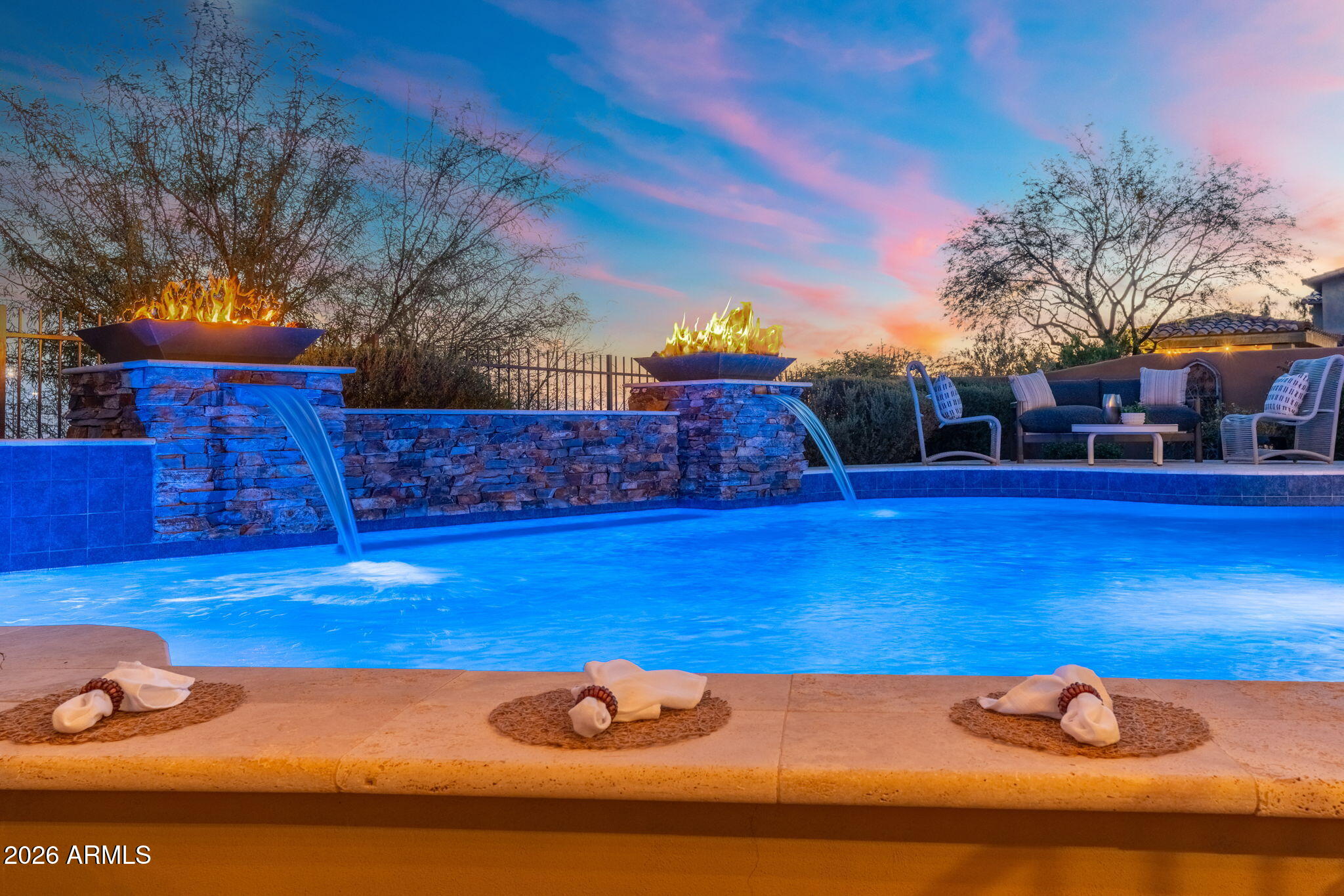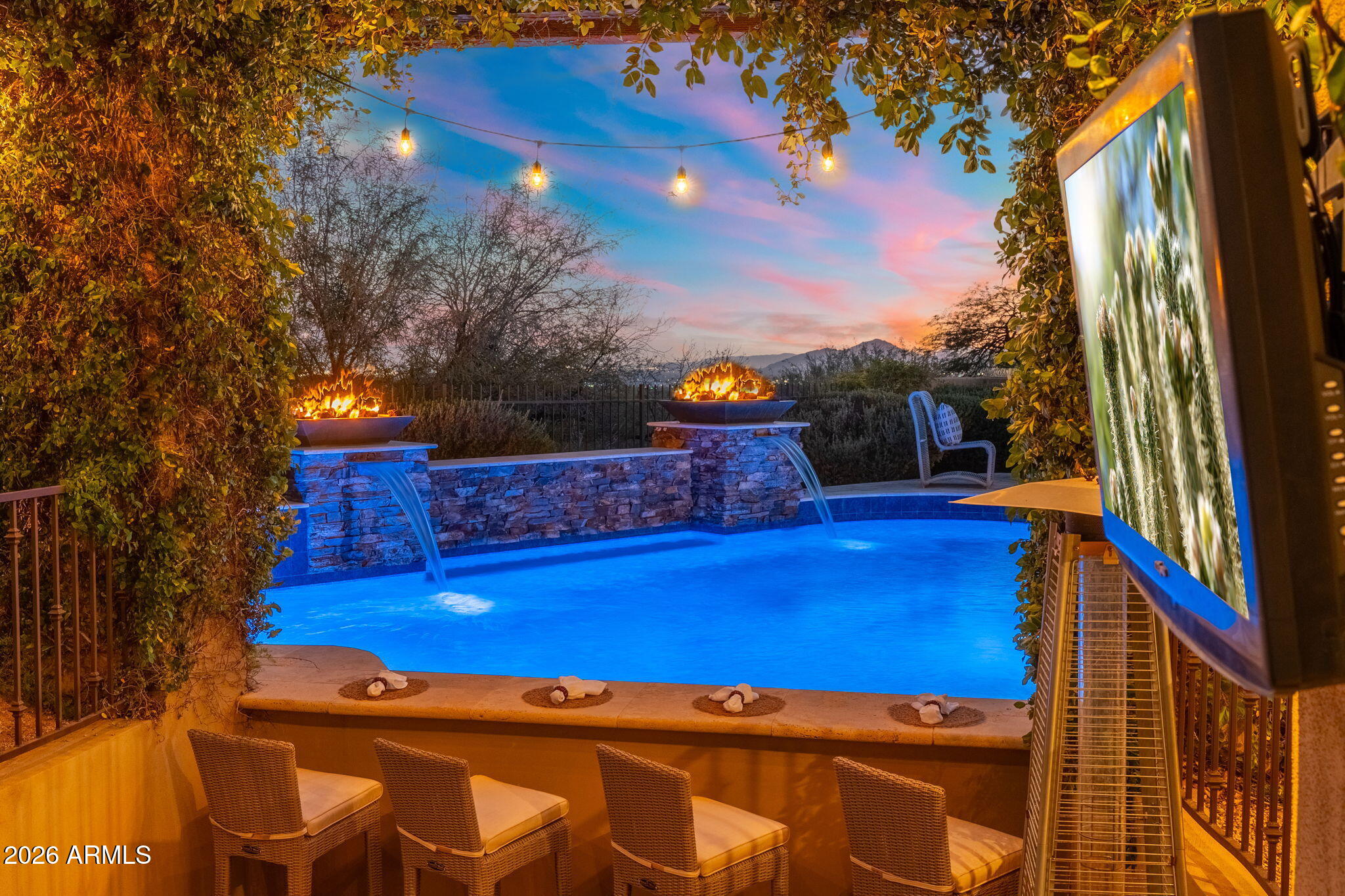 Appreciate the additional private courtyard that offers a quiet retreat for morning coffee, evening wine, or intimate gatherings under the Arizona sky. The backyard is truly an entertainer's dream. Designed for both relaxation and unforgettable hosting, with striking fire and waterfall elements, the resort-style pool and swim up bar has elegant, in-pool tiled barstools so you can sip and socialize without ever leaving the water. Enjoy the best of both worlds with the lowered lounge area that sits just opposite the swim-up bar. While some guests relax in the pool, others can unwind in the shaded pergola lounge just steps away for everyone to gather and allowing guests to sit comfortably out of the water but still be part of the fun. Fire up the Jenn-air gas grill for your favorite BBQ spread. Whether you're hosting sunset dinners, weekend pool days, cozy nights by the fire, or indulging in a spa-like experience under the stars, the setting is elevated by sweeping mountain views and complete privacy.